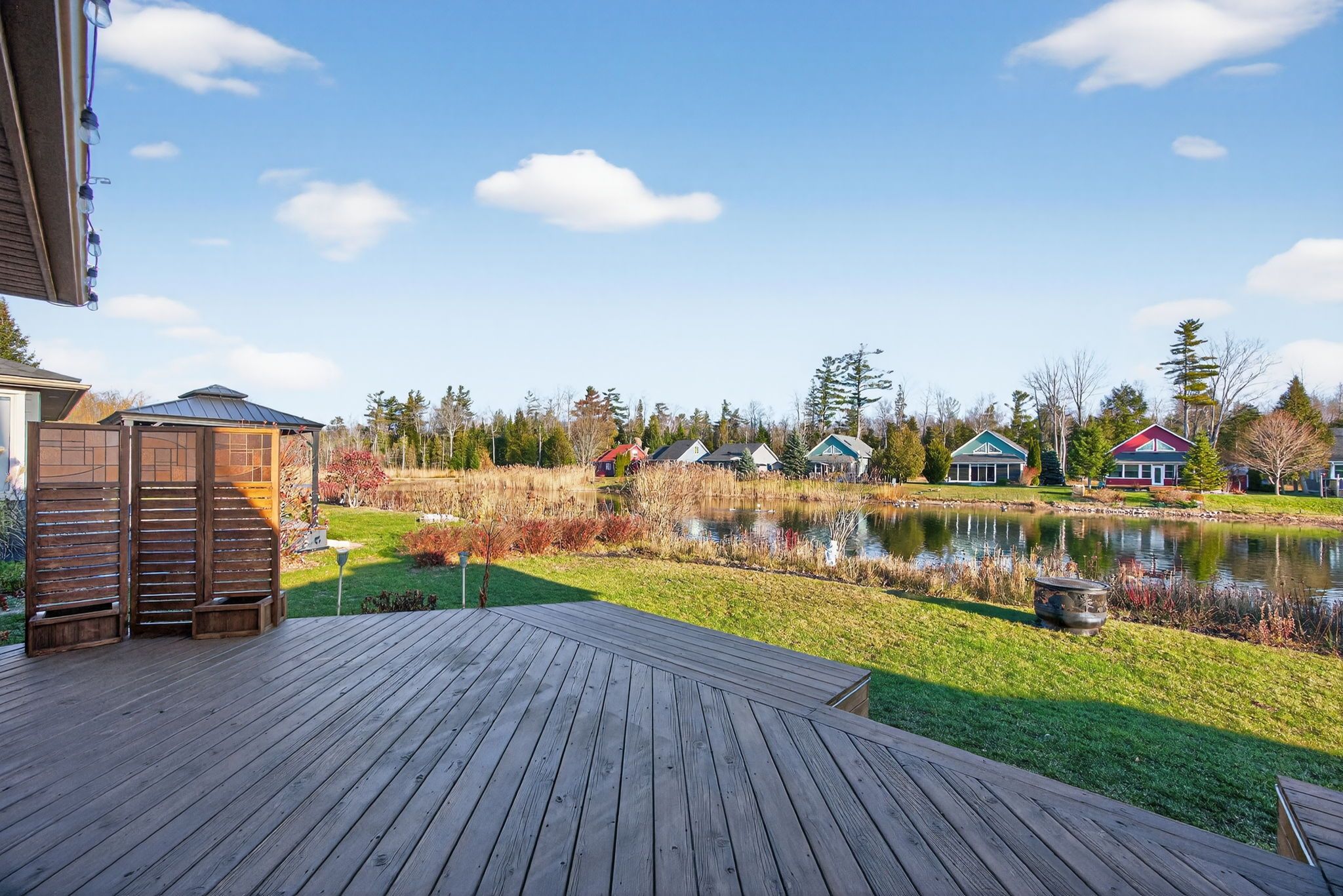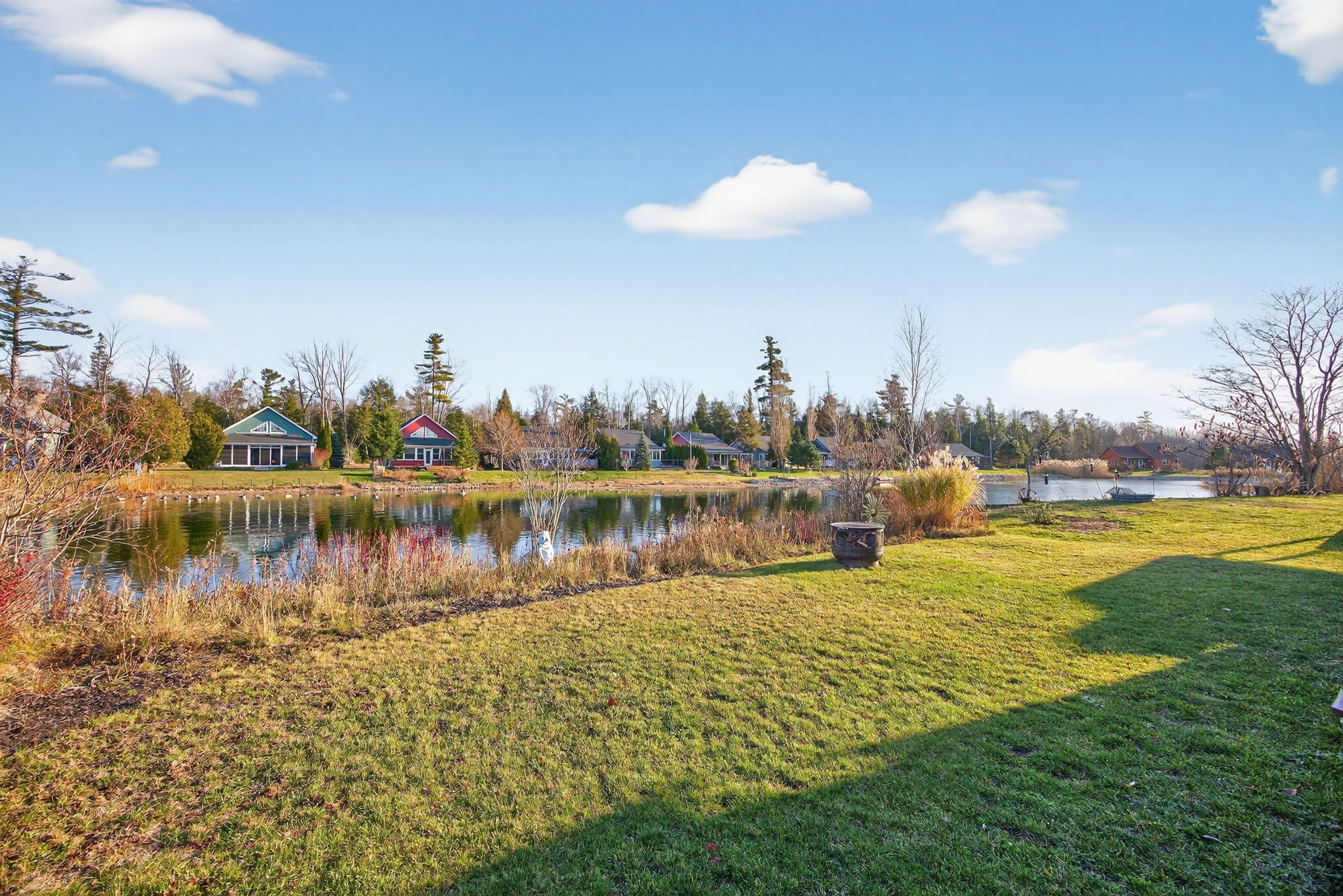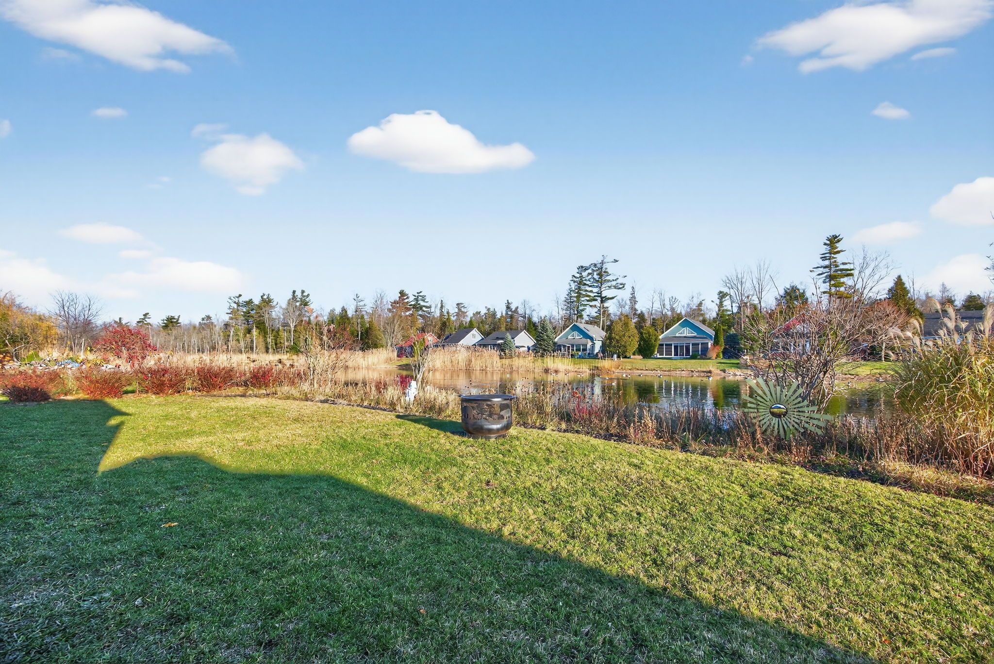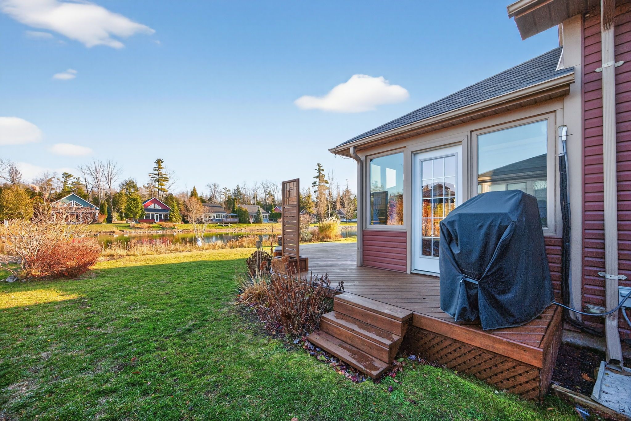 • Cozy gas fireplace and a sunroom with pond views.