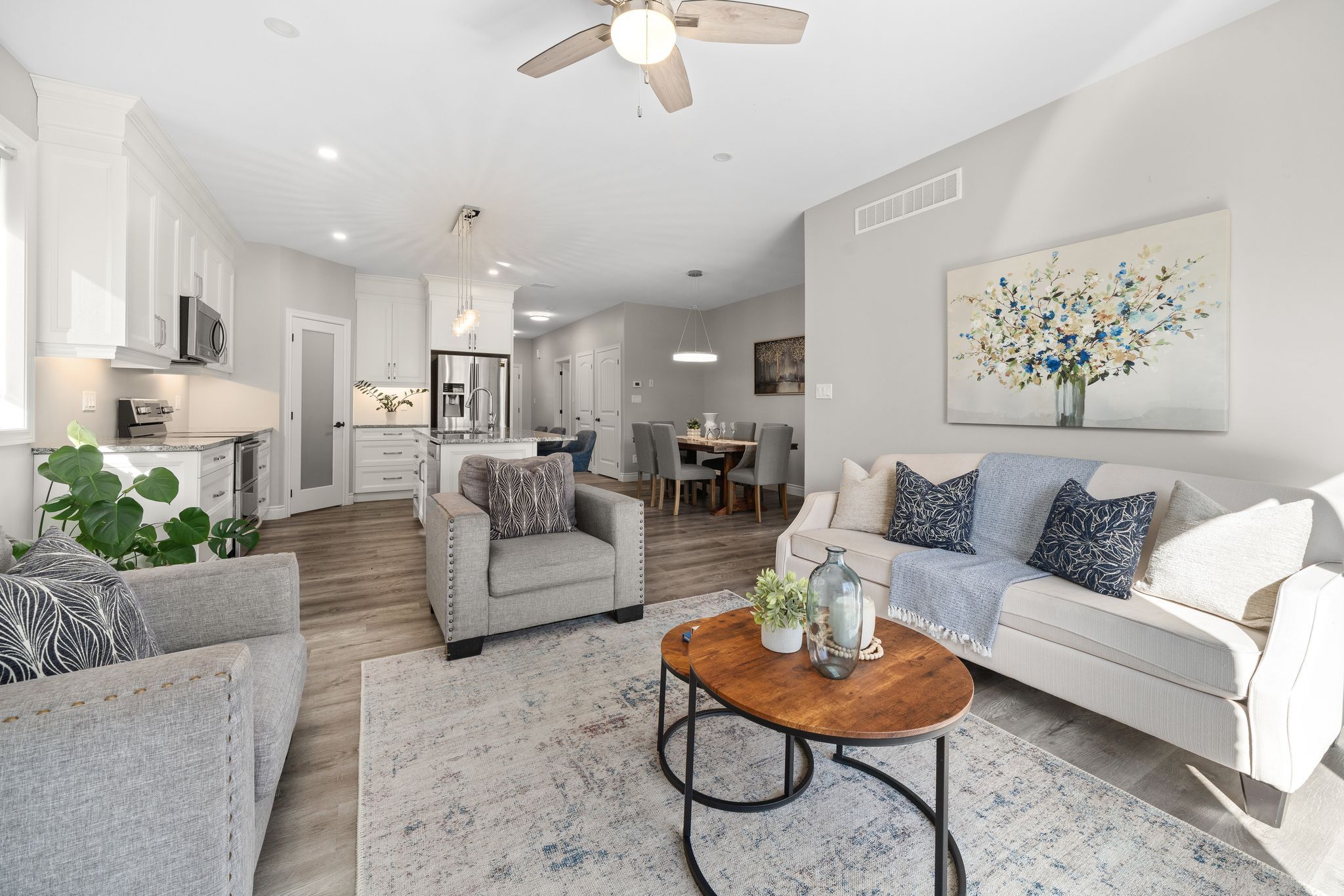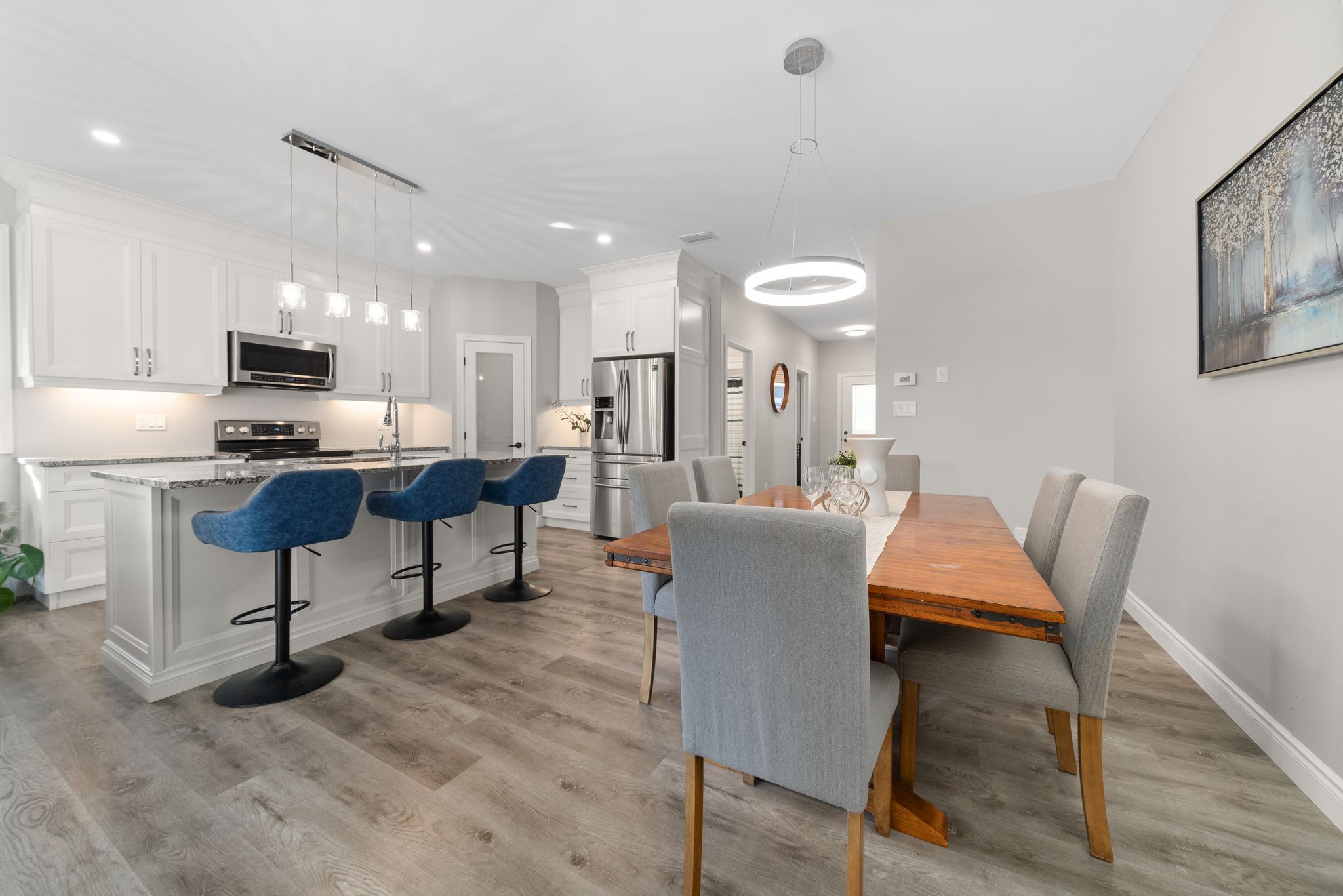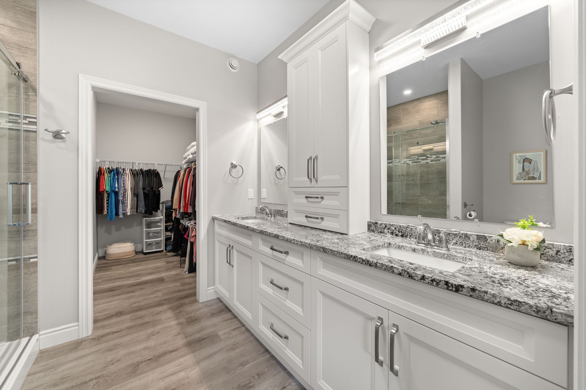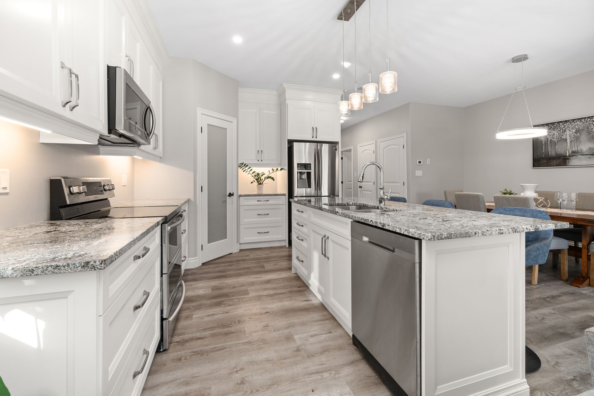 • Custom kitchen features stainless steel appliances and a walk-in pantry.