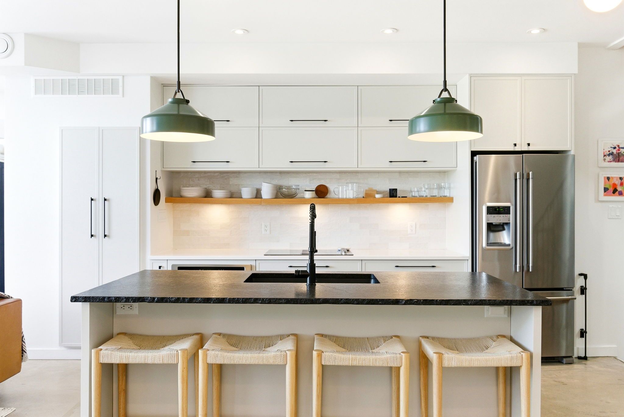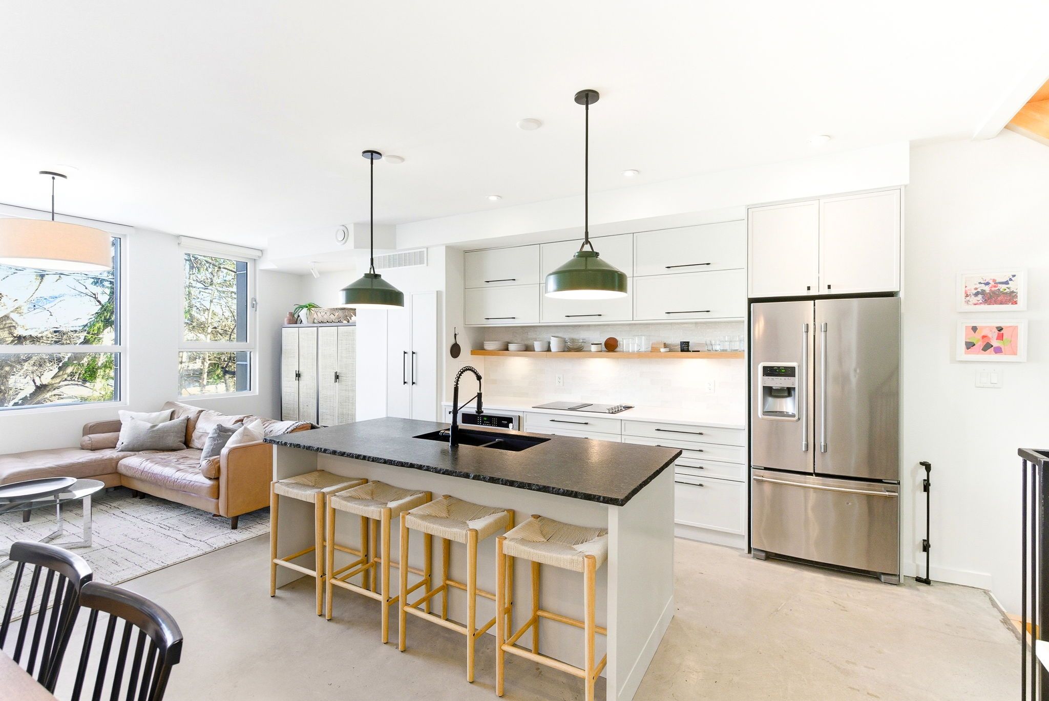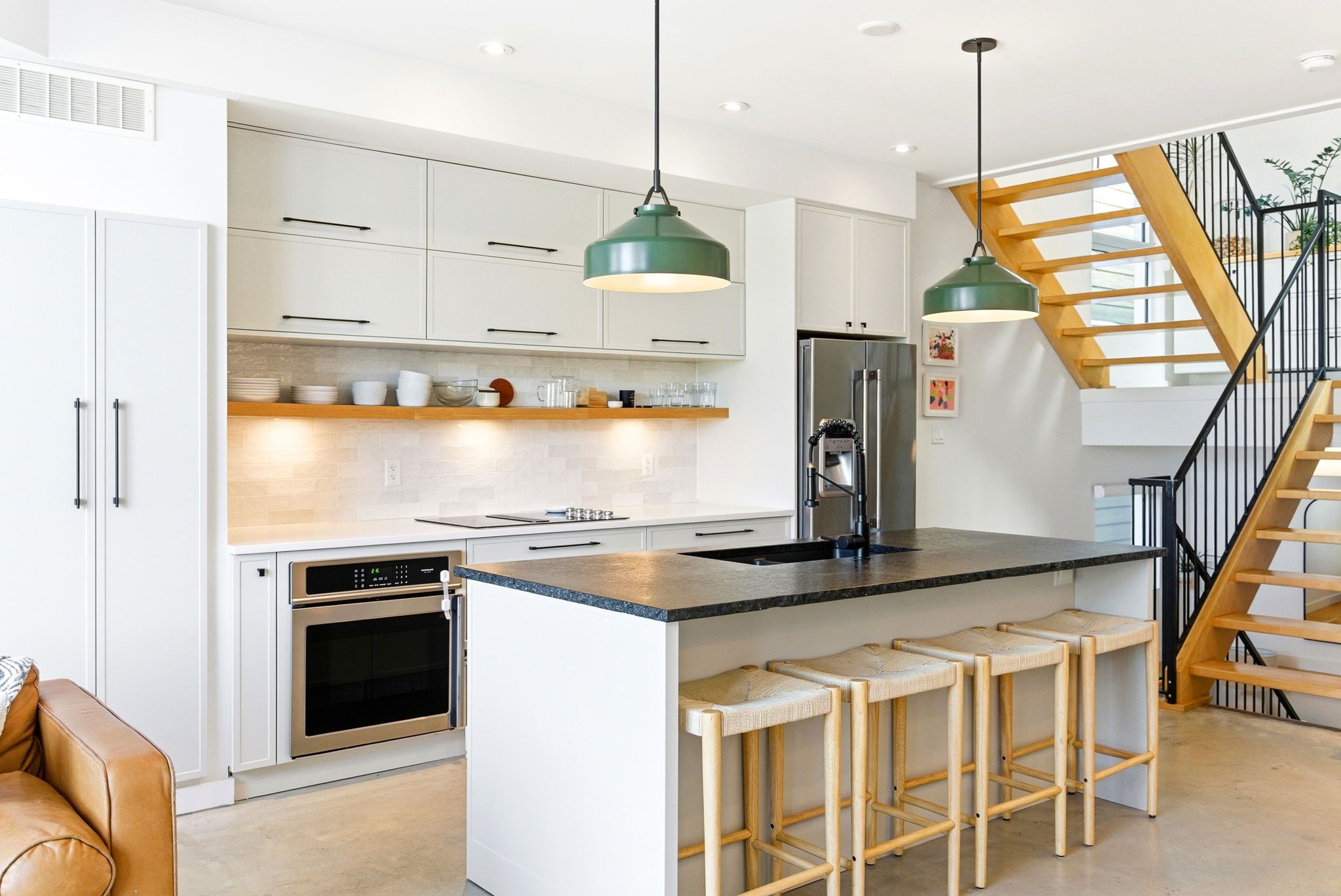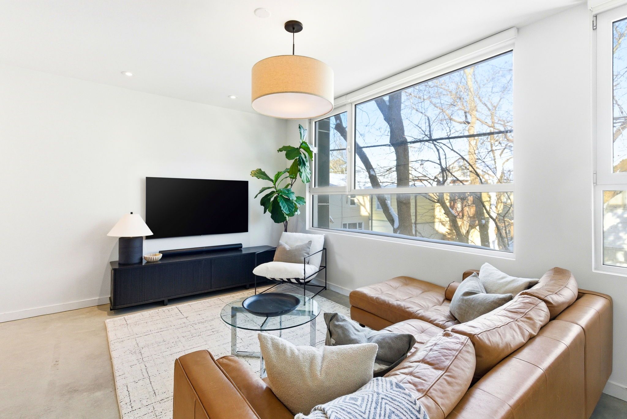 • Spacious main living area with a chef's kitchen and quartz countertops.