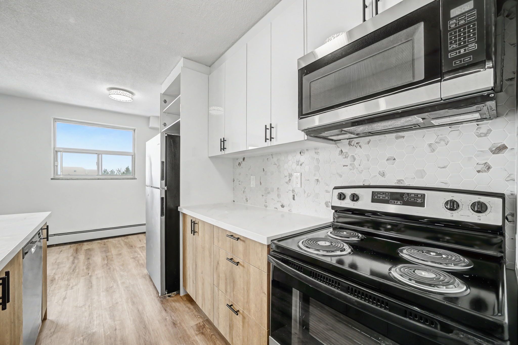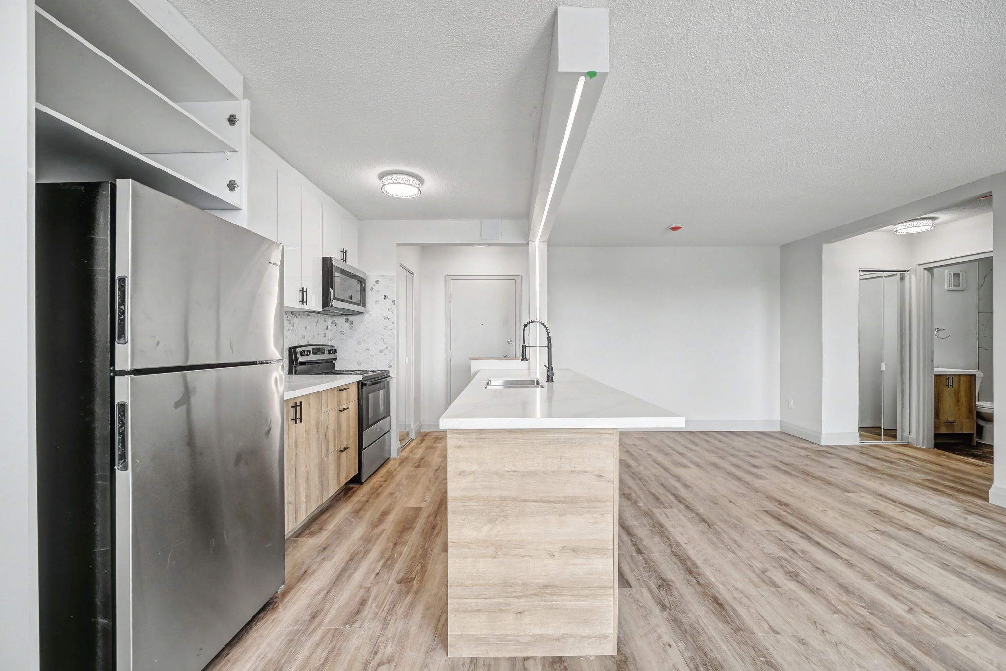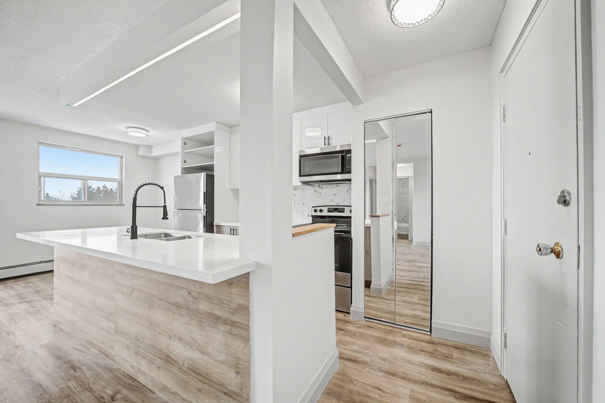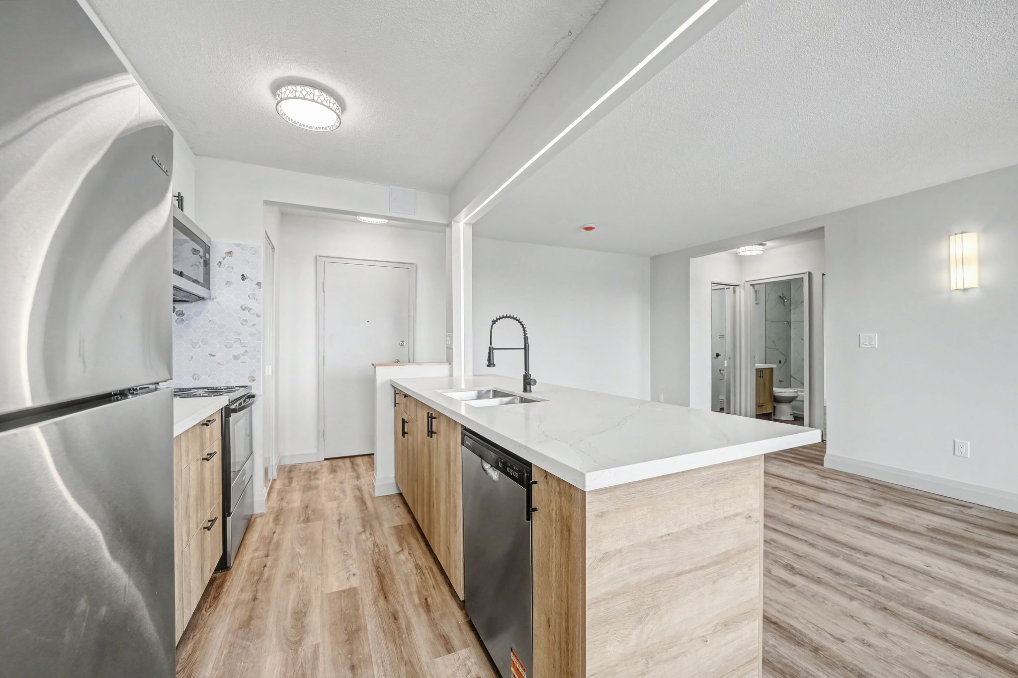 • Modern kitchen with new stainless steel appliances and quartz countertops.