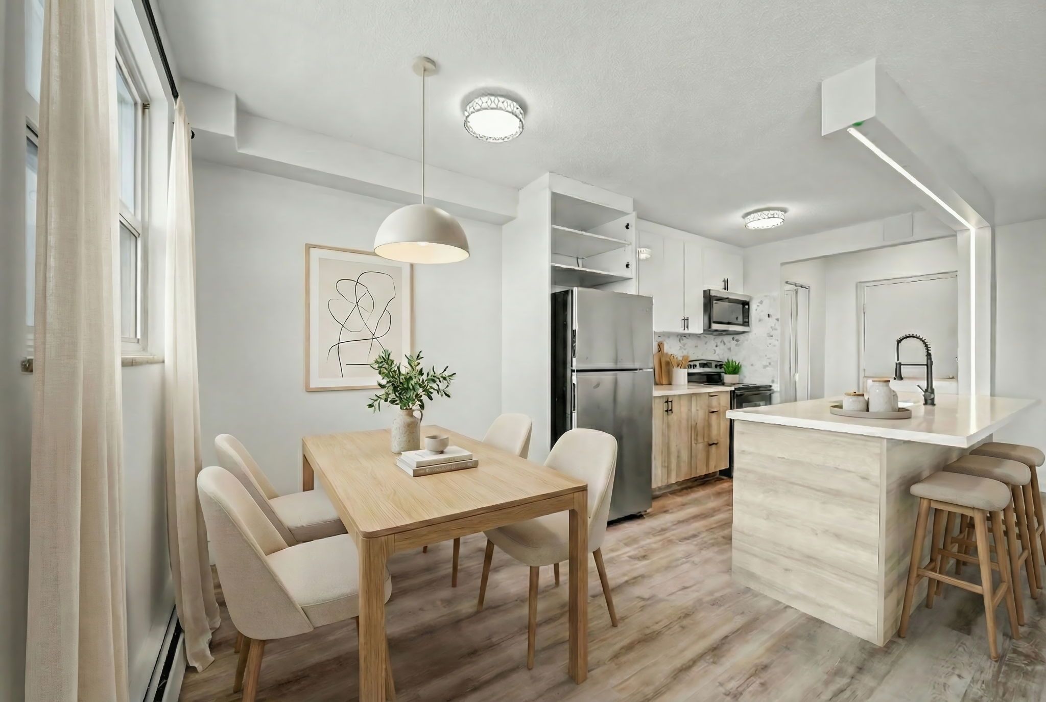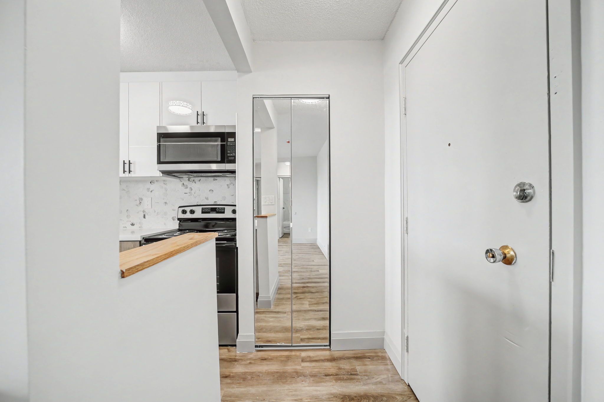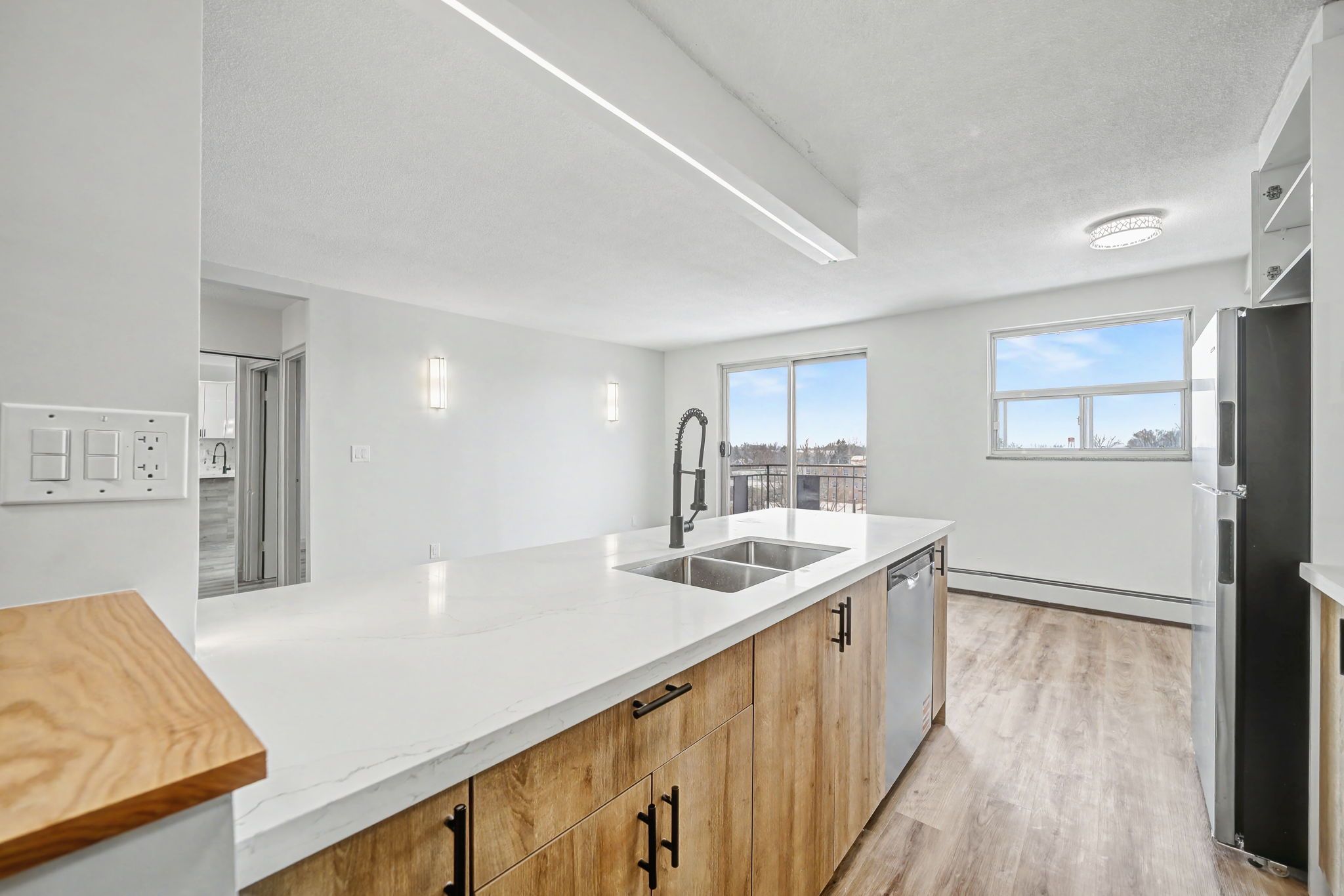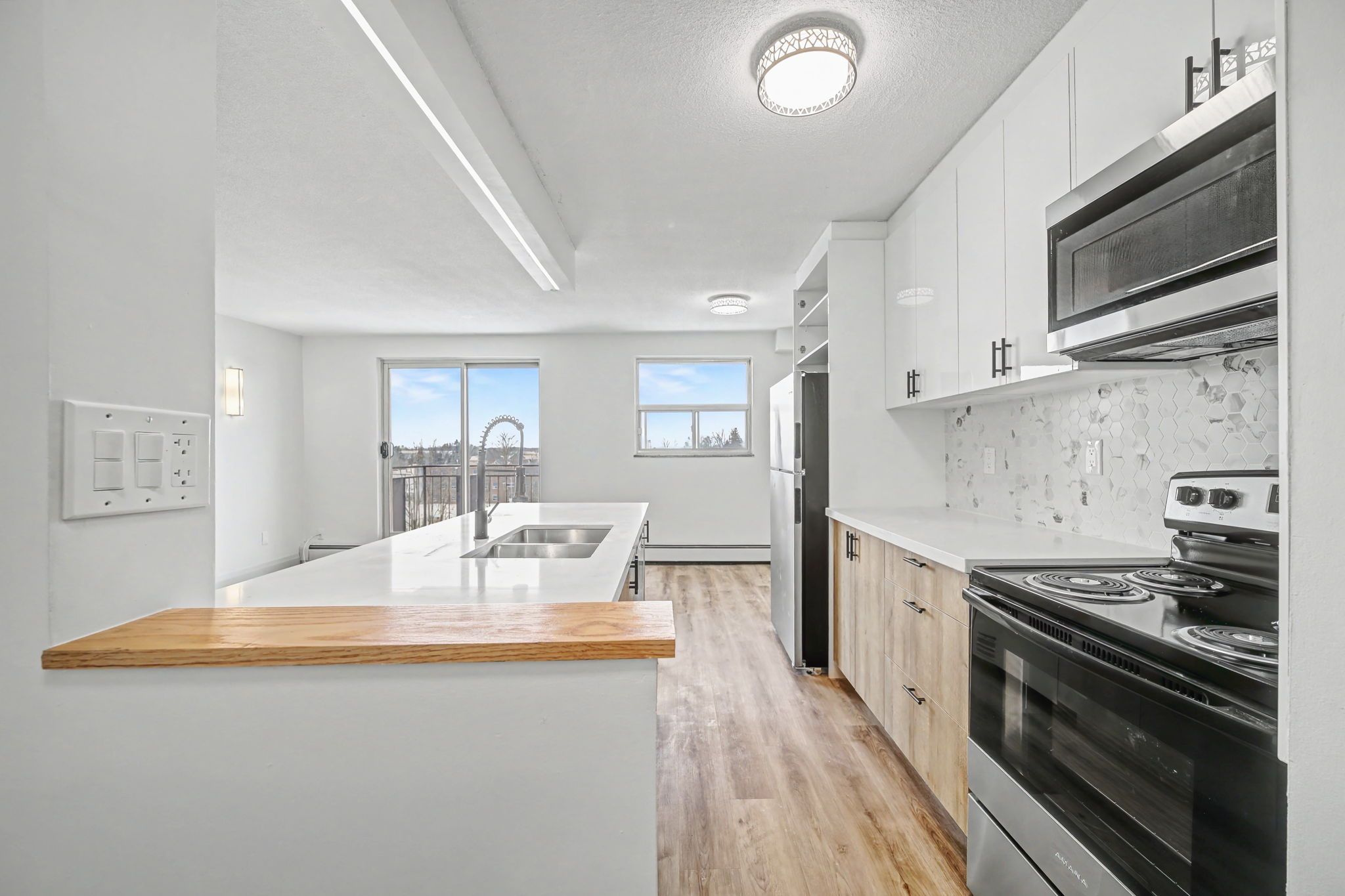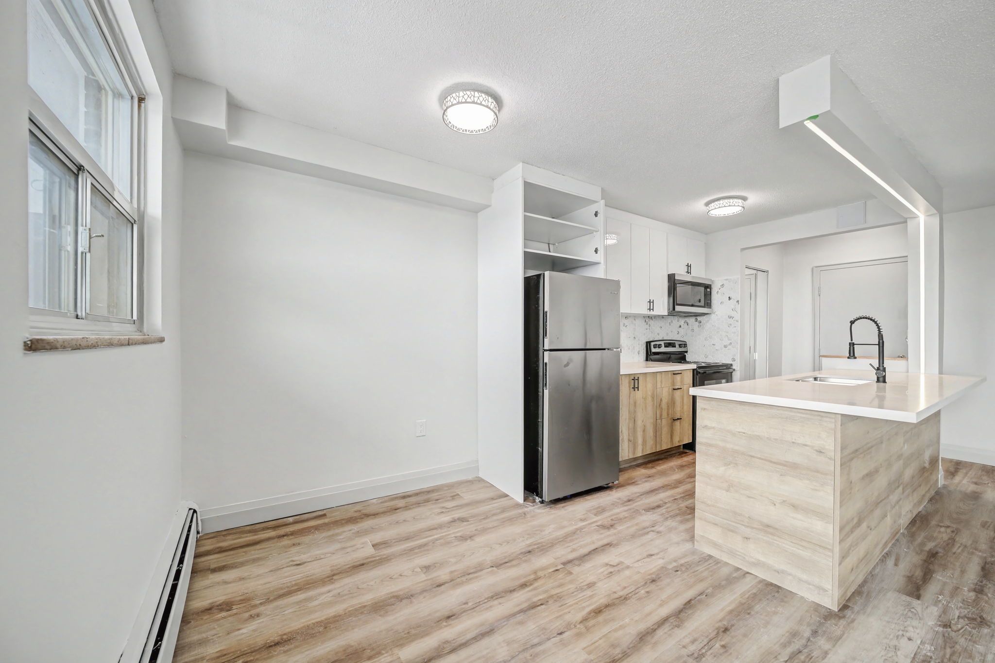 • Modern kitchen with new stainless steel appliances and quartz countertops.