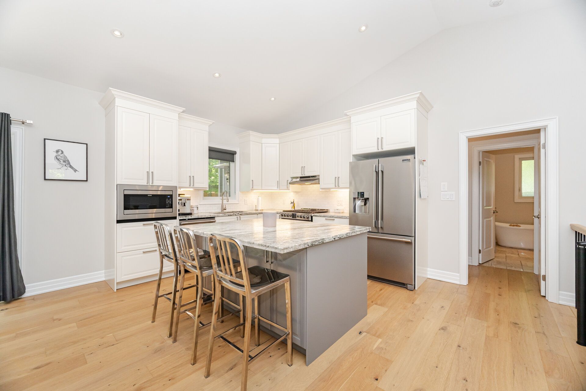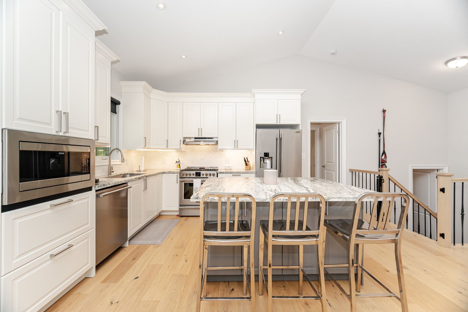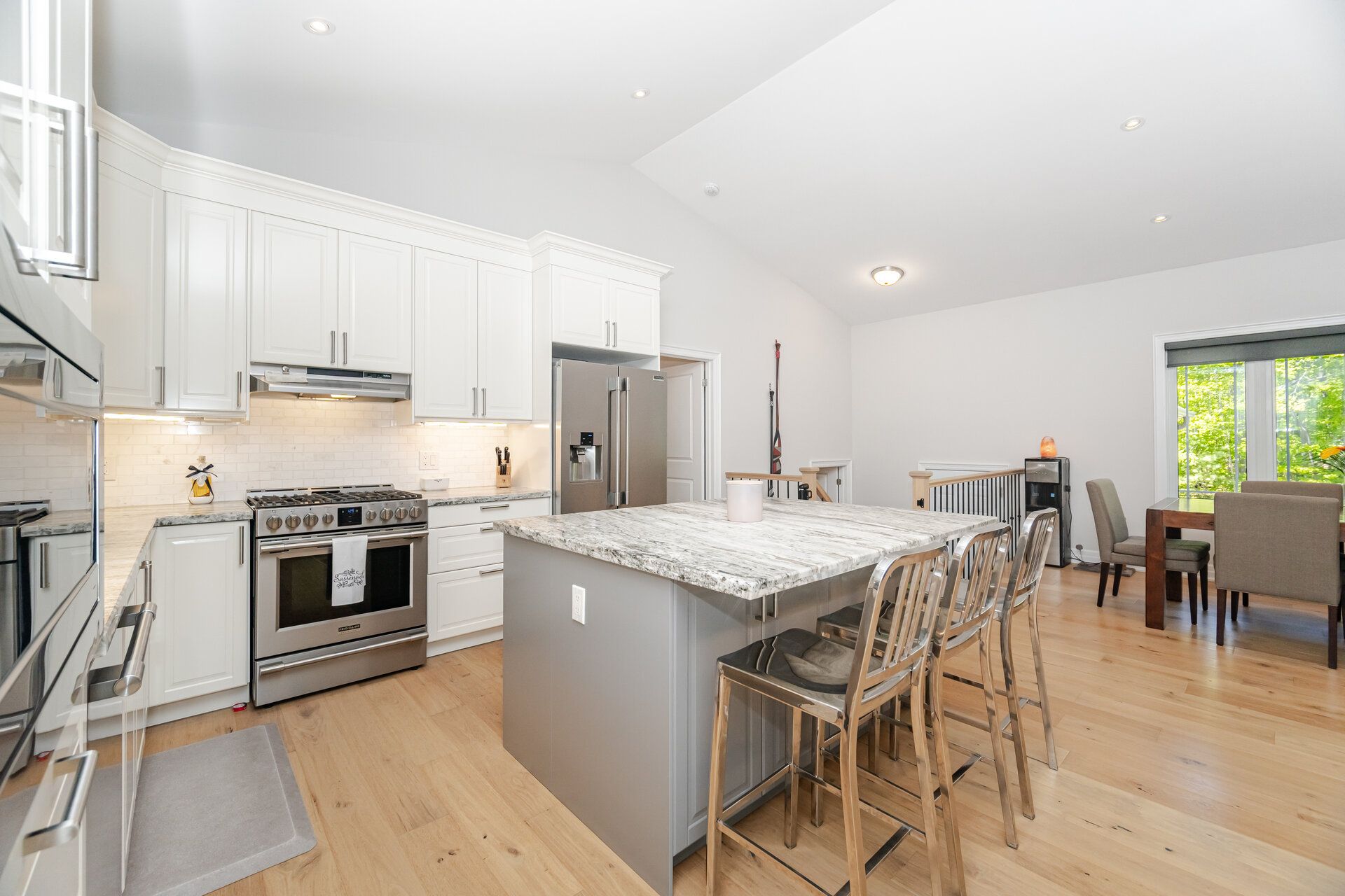 • Modern kitchen with upgraded stainless steel appliances and ample dining space.