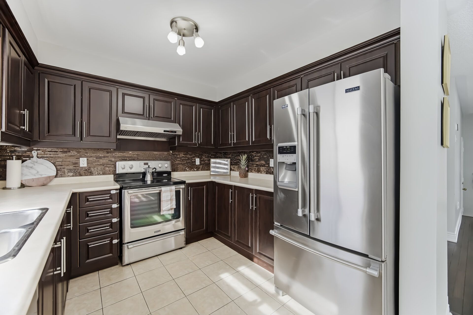 • Oversized kitchen with stainless steel appliances and ample cabinet space.