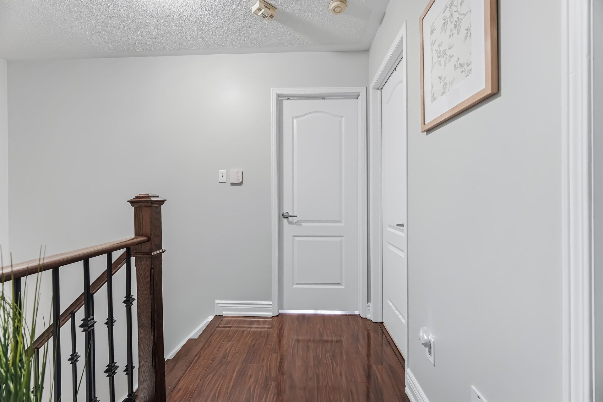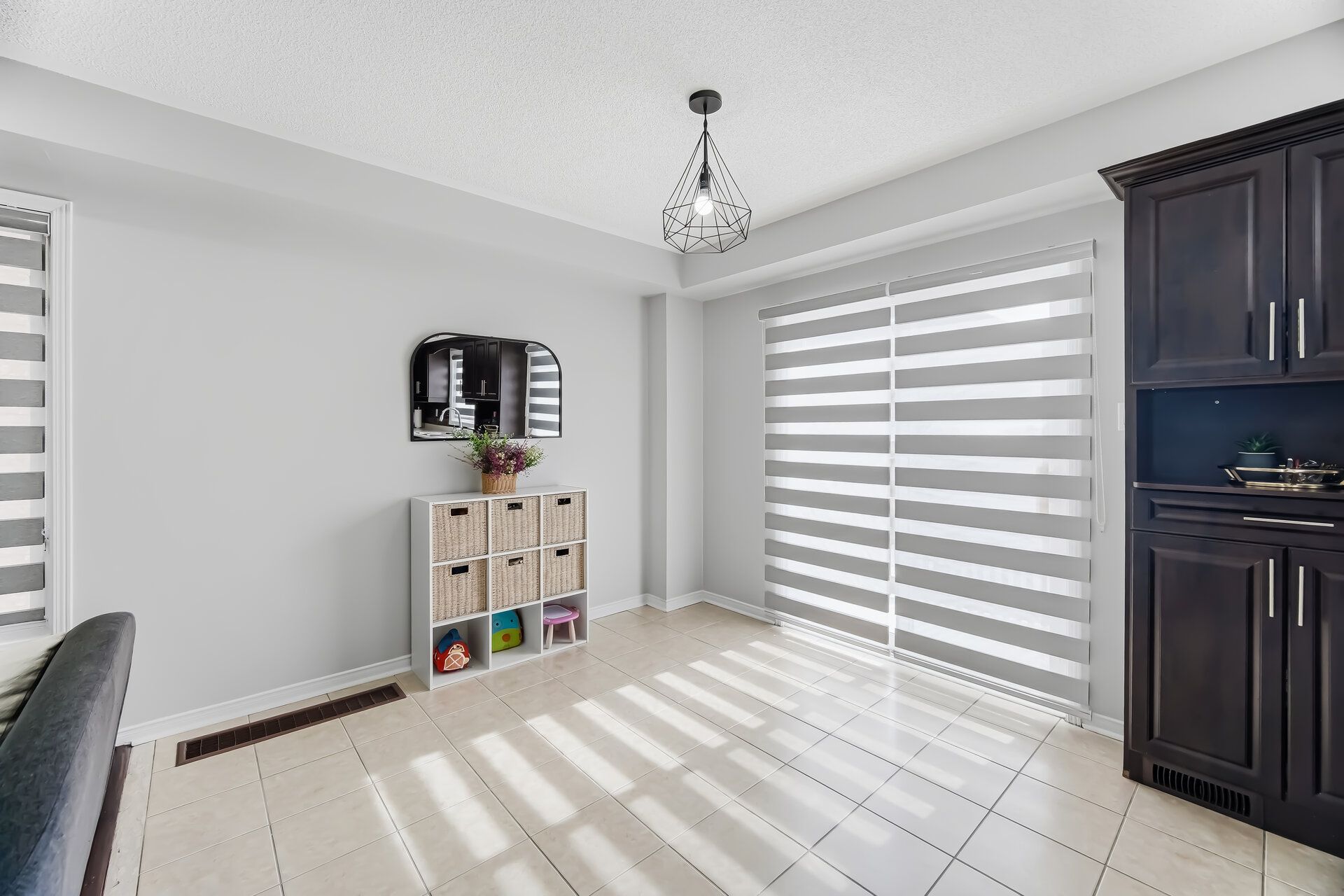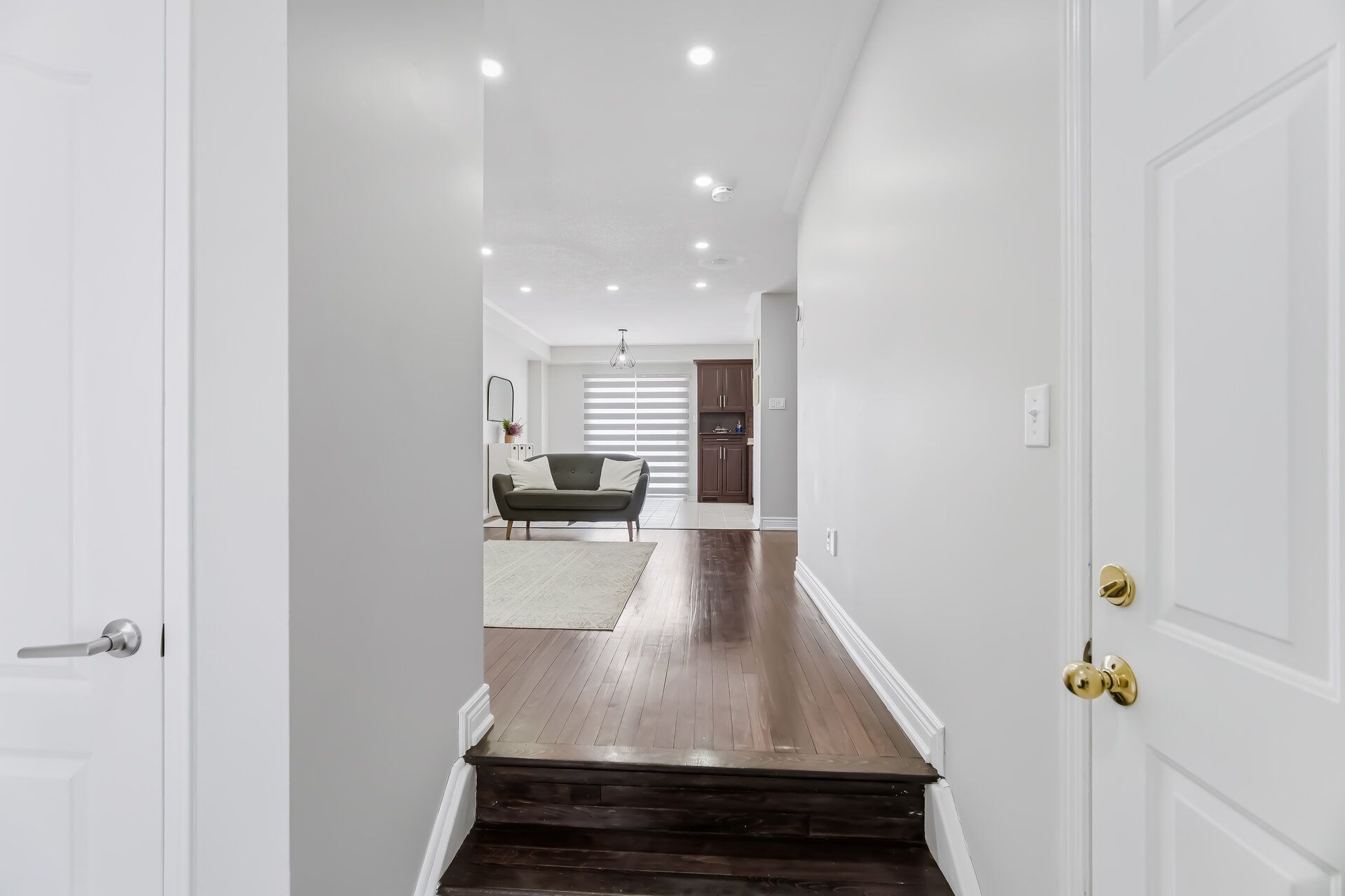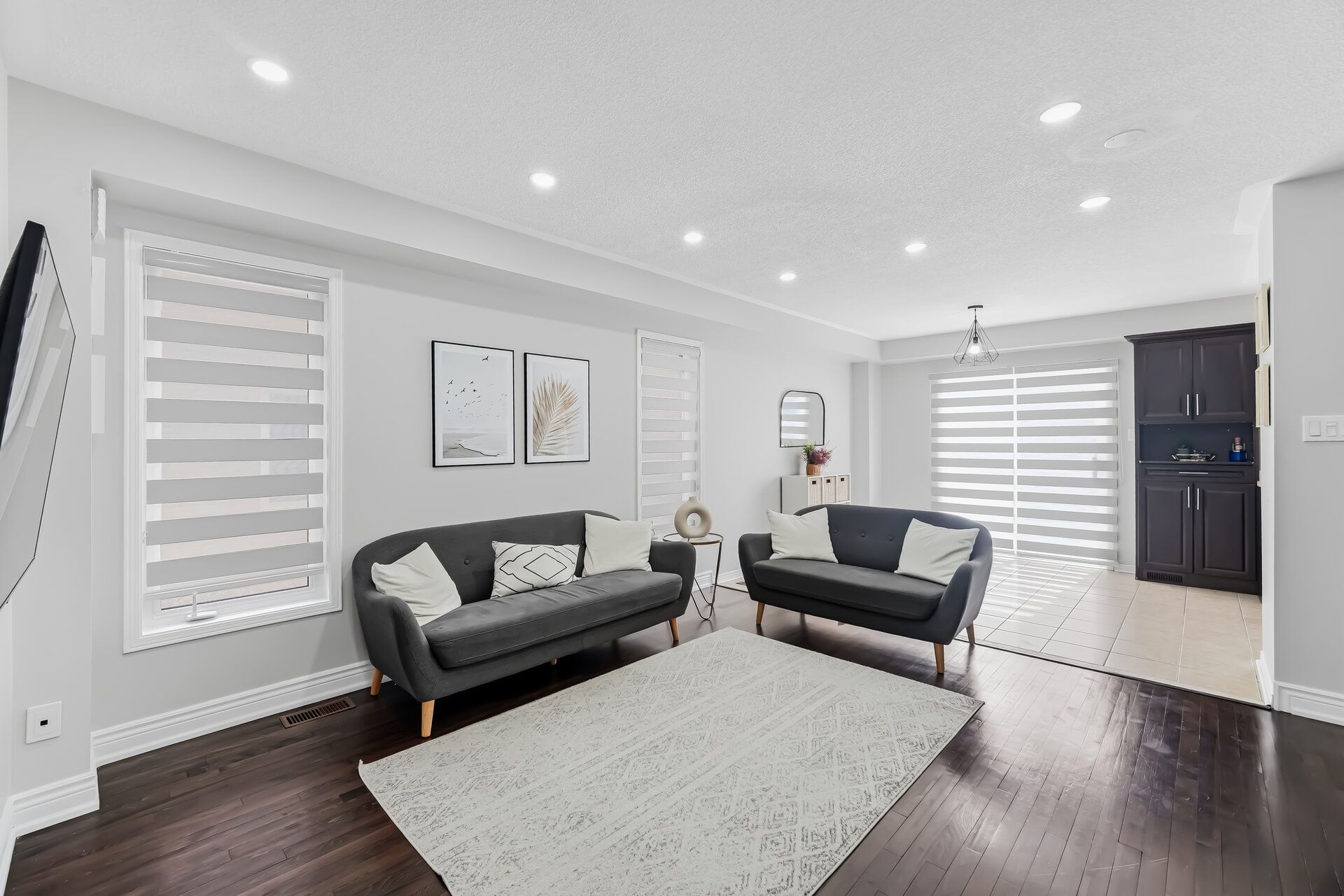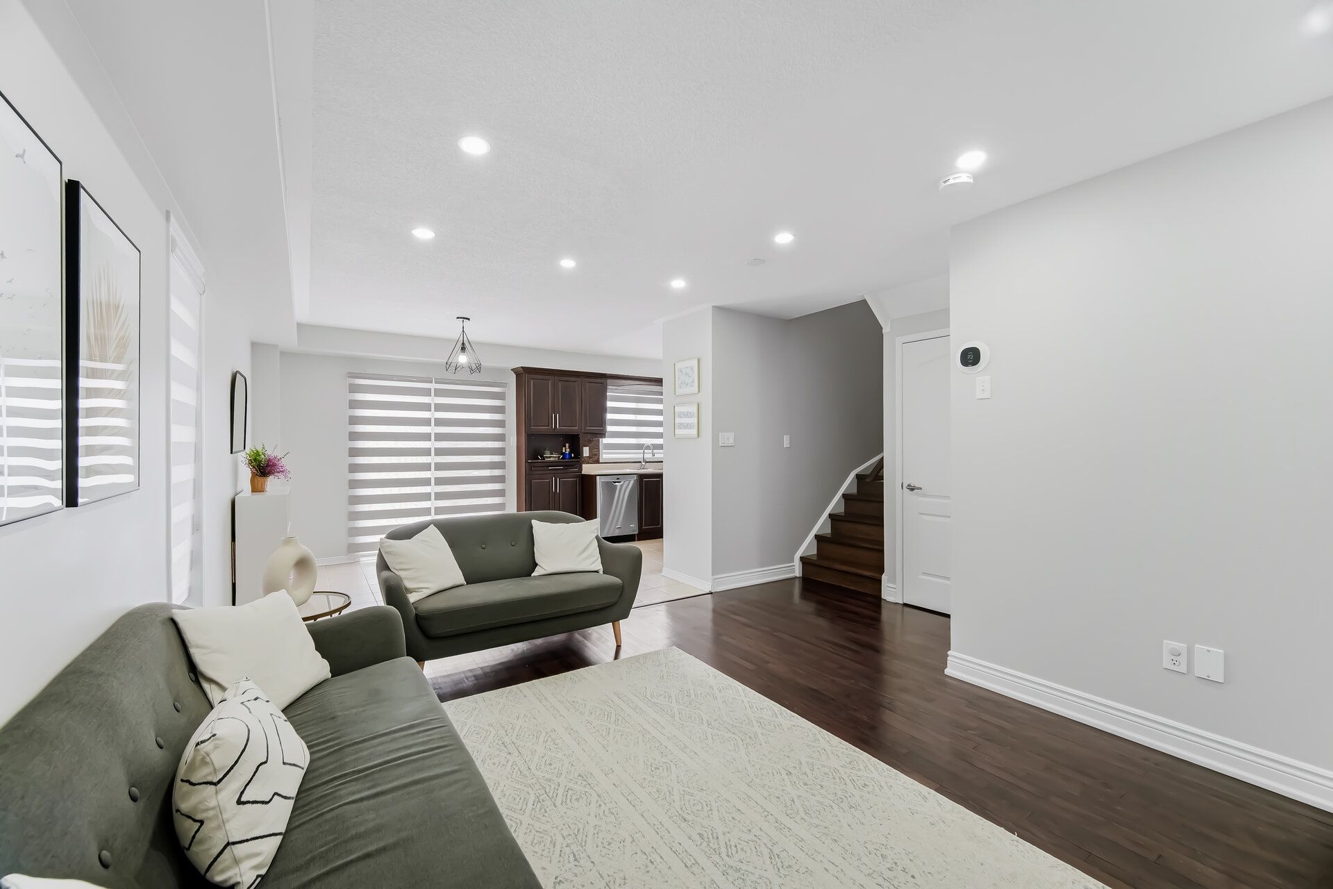 • Bright open concept living area with modern finishes and wood flooring.