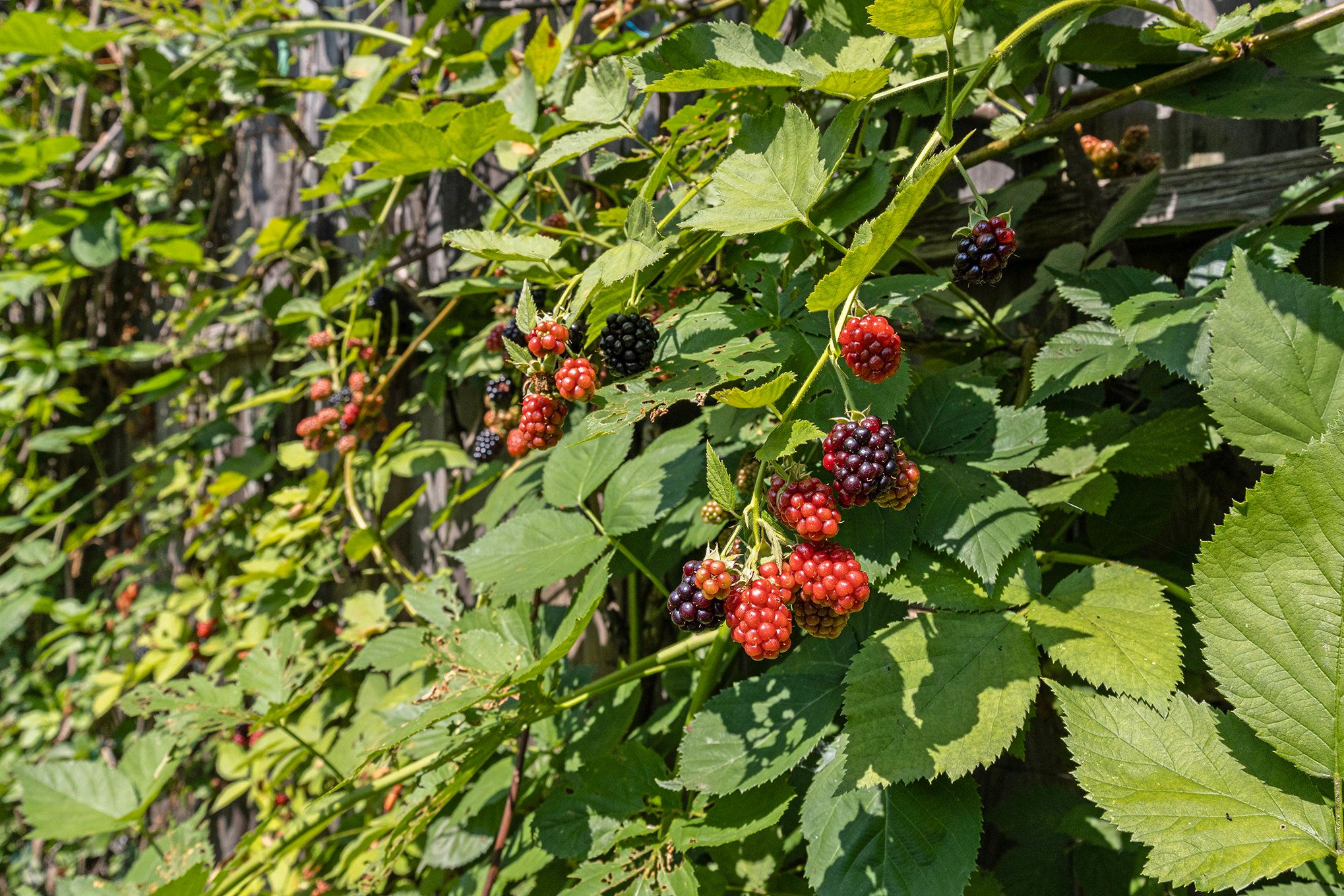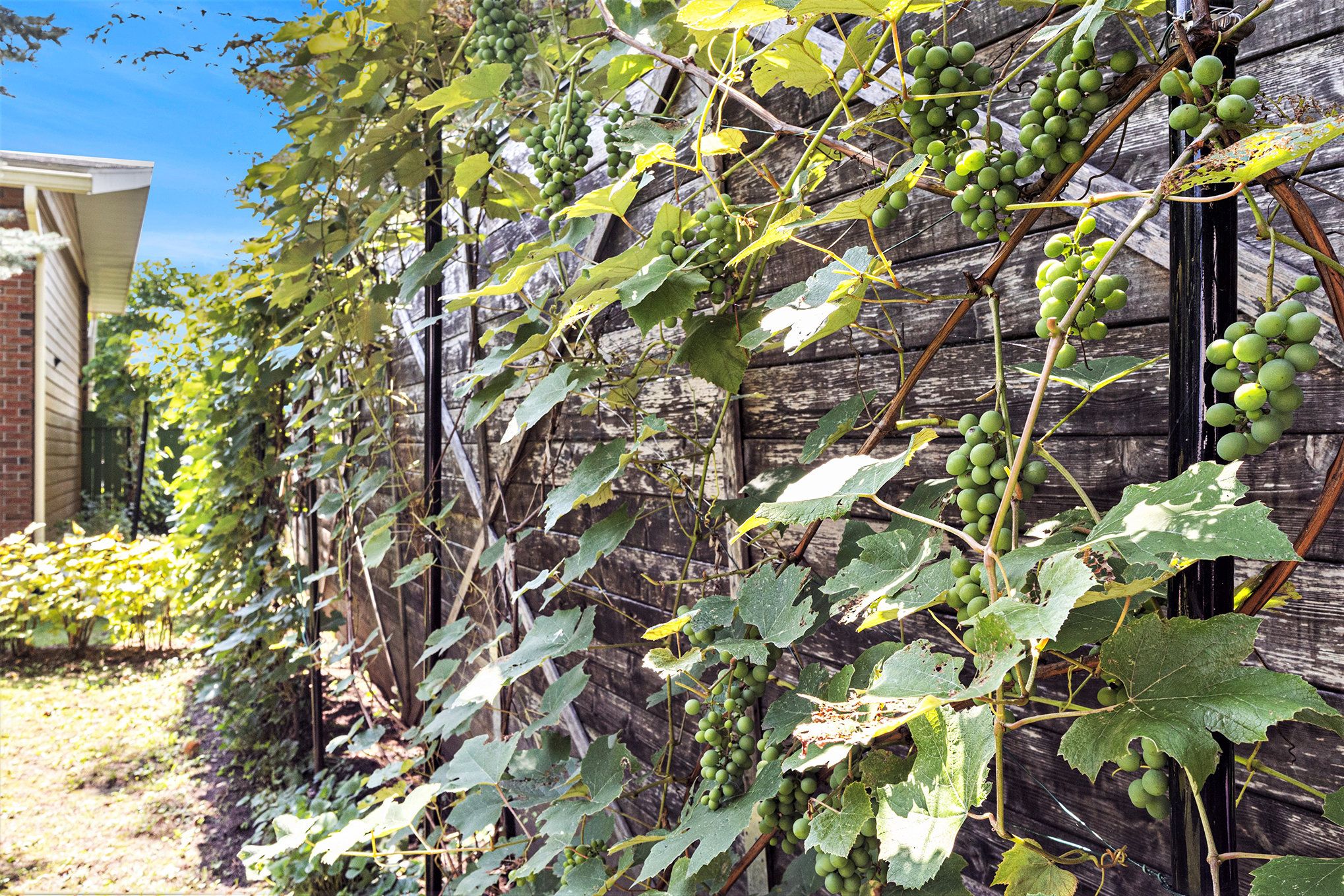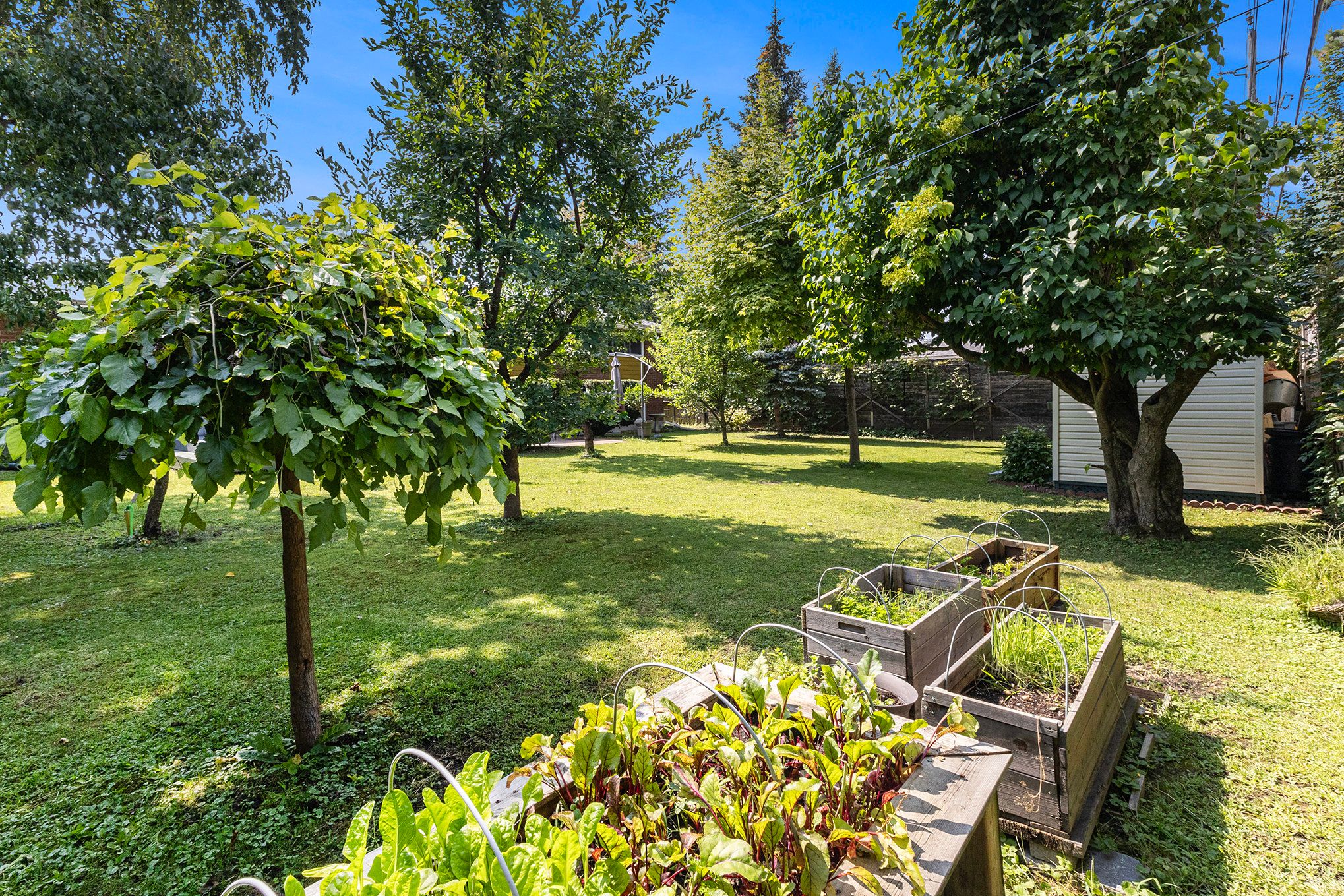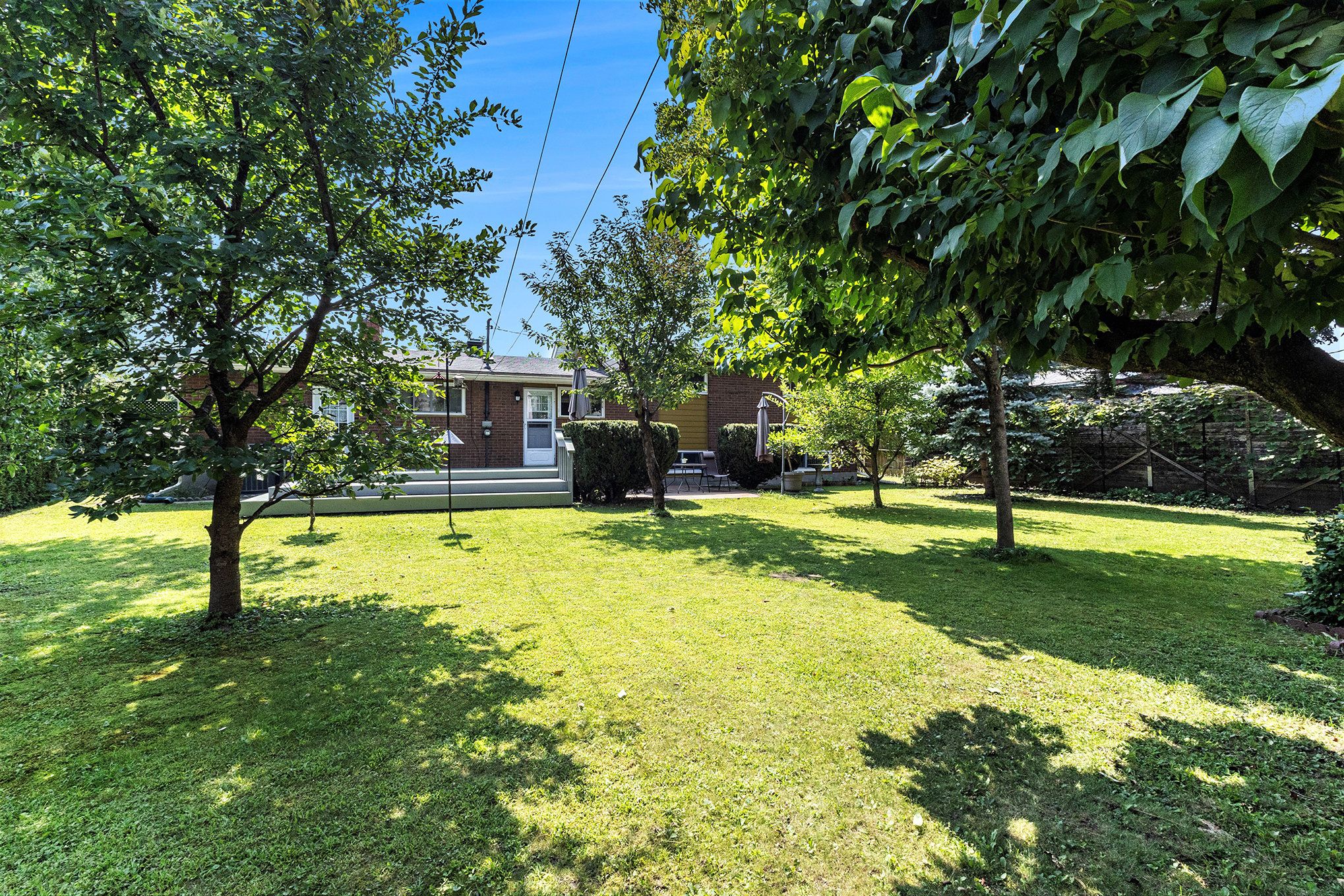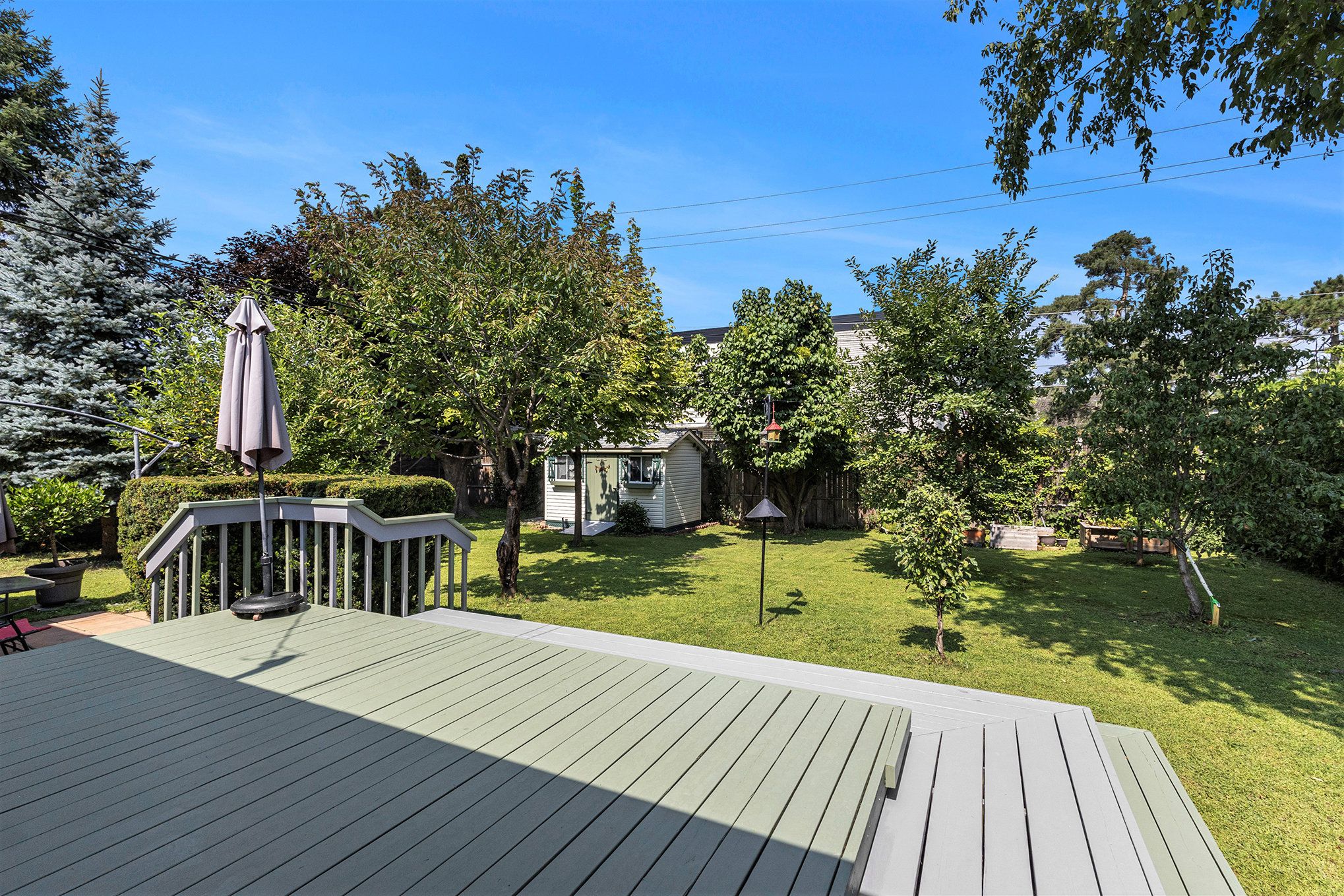 • Private backyard oasis with deck, patio, and a variety of fruit trees.