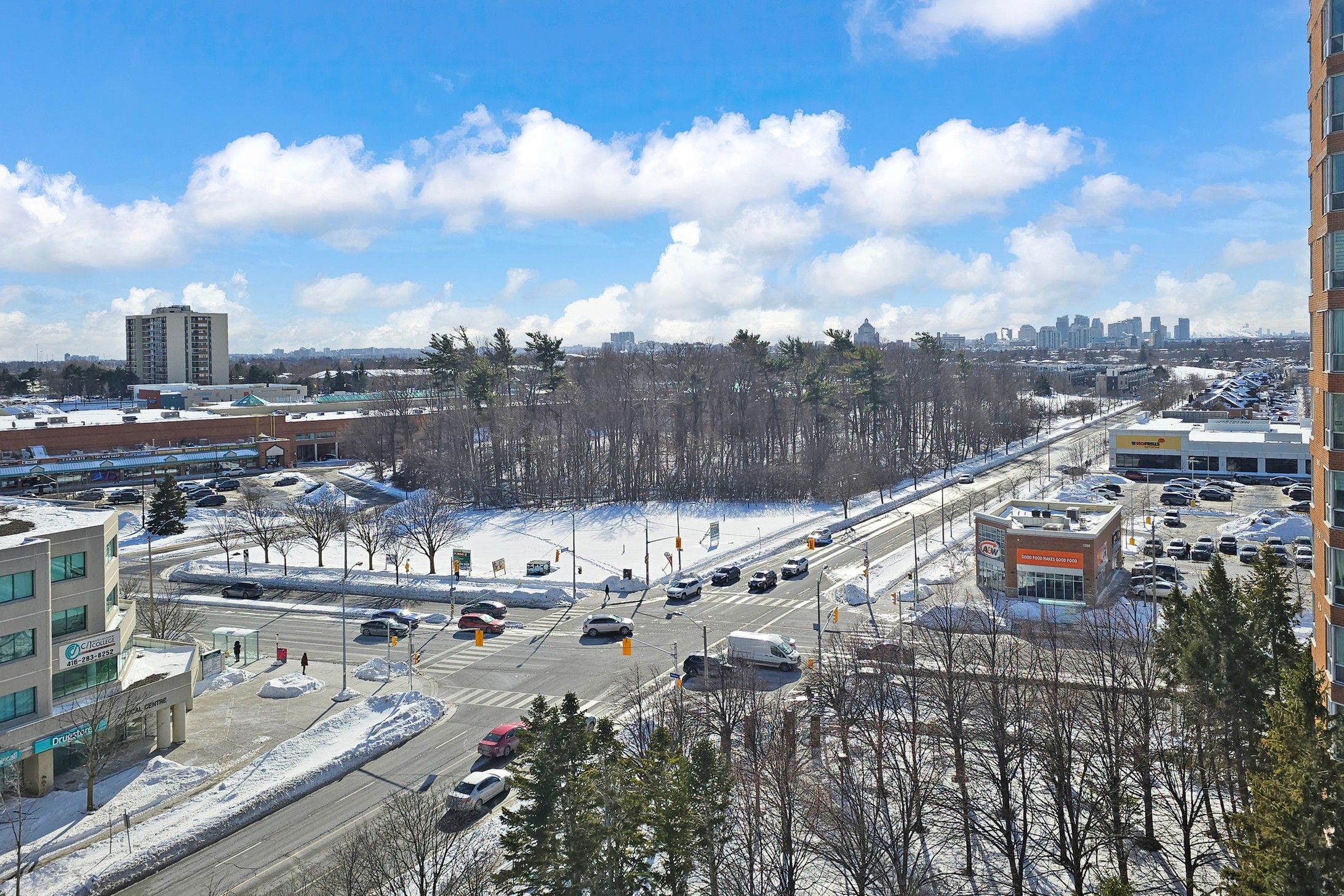 Welcome to this spacious, fully upgraded, sun-filled corner unit offering over 1,200 sq. Ft. In the highly sought-after mayfair on the green community. Featuring a formal open-concept living and dining area with a walkout to an open corner balcony, this home showcases spectacular panoramic, unobstructed views. The den has been converted into a bright eat-in breakfast area. The spacious primary bedroom offers his & hers walk-in closets and a 4-piece en-suite. Enjoy engineered hardwood flooring, granite kitchen countertops with ikea cabinetry in the kitchen and bathrooms, and california shutters throughout. Located in a desirable neighborhood with exceptional amenities, including a gym, indoor pool, squash and tennis courts, party room, and 24-hour gated security walking distance to medical buildings, shopping mall, shoppers drug mart, no frills, library, elementary, and high schools. Ttc at your door and minutes to highway 401. Move in and enjoy!