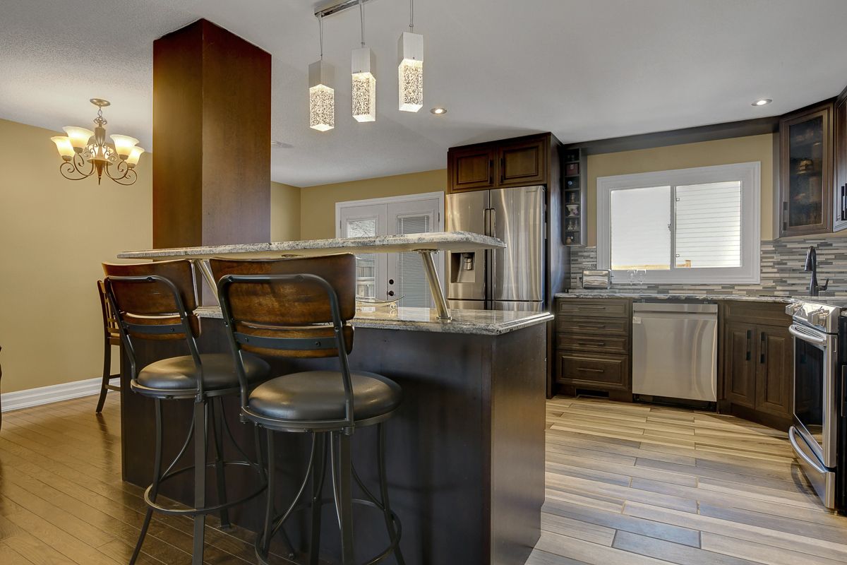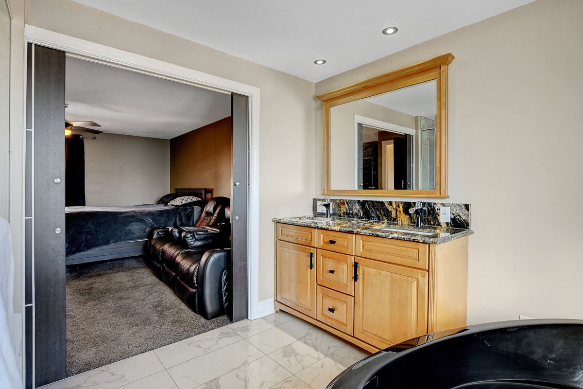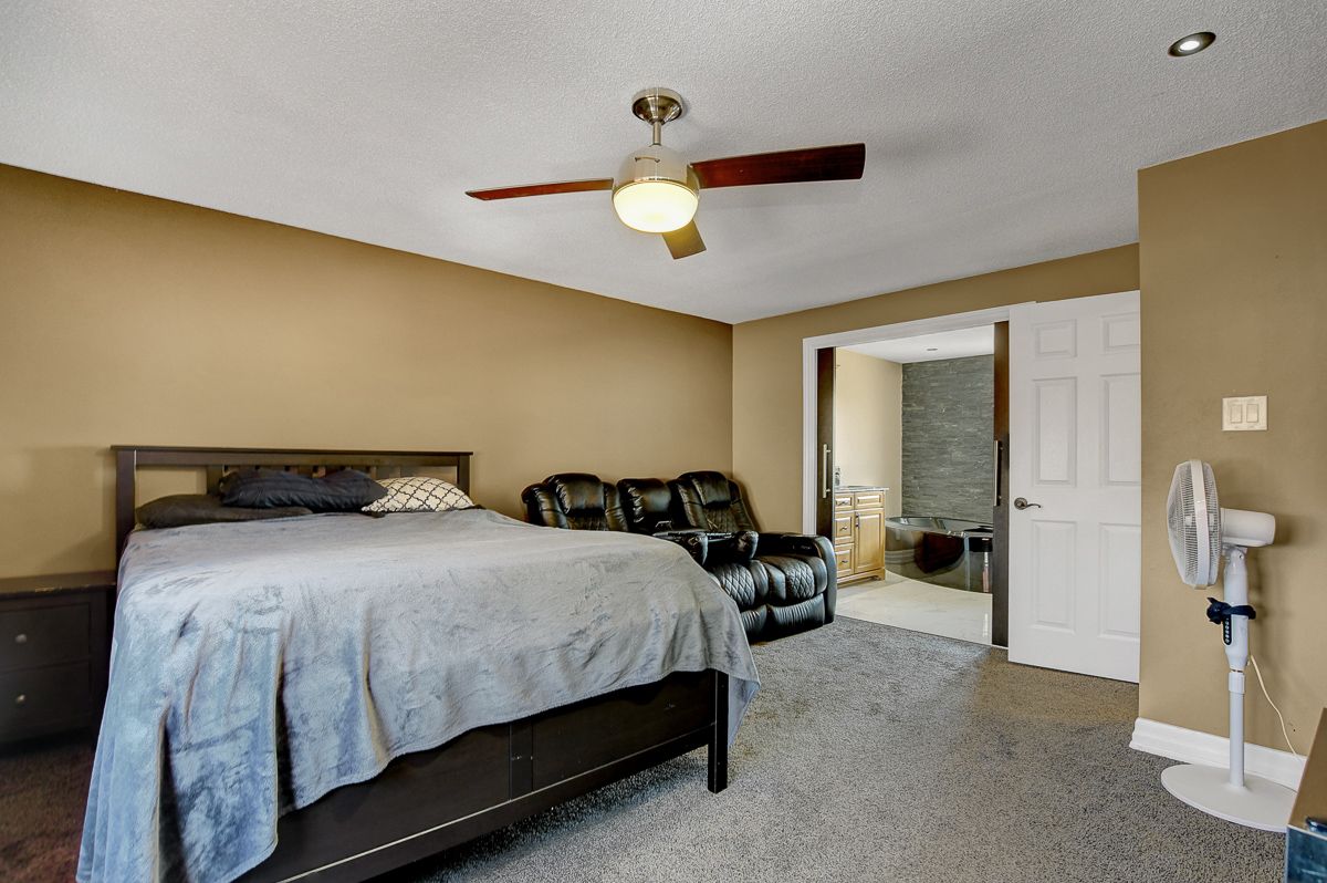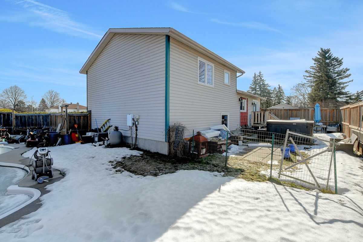 Fully renovated home with heated in-ground pool in desirable queenswood heights! Welcome to this beautifully updated detached split-level home situated on a large west-facing lot on a quiet, child-friendly street in sought-after queenswood heights. Offering quick possession, this turnkey property features 3 bedrooms, 2 bathrooms, and stylish renovations from top to bottom. The main living area is bright and inviting, featuring hardwood floors throughout the spacious living and dining rooms, perfect for entertaining or relaxing with family. The modern kitchen showcases sleek cabinetry, granite countertops, stainless steel appliances, stylish tile backsplash, breakfast bar seating, and convenient pot-and-pan drawers, all complemented by contemporary fixtures. Upstairs, you'll find newly carpeted bedrooms and a beautifully renovated main bathroom with a modern vanity and elegant tile finishes. The luxury 5-piece ensuite offers a spa-like retreat with a glass shower, standalone soaker tub, double sinks, and granite counters. A main floor bedroom provides flexible living space-ideal for a guest suite, home office, teenager's retreat, or multi-generational living. The lower level family room adds a cozy second living space, while the laundry, utility room, and generous storage complete the home. Step outside to enjoy the expansive fully fenced backyard, perfect for summer entertaining with a deck, patio, and private gas-heated in-ground pool. Additional features include central air conditioning, fresh modern paint throughout, and parking for up to 5 vehicles including an oversized garage. This beautifully renovated home combines comfort, style, and outdoor living in a fantastic family neighborhood. A great opportunity-don't miss your chance to make this home yours!