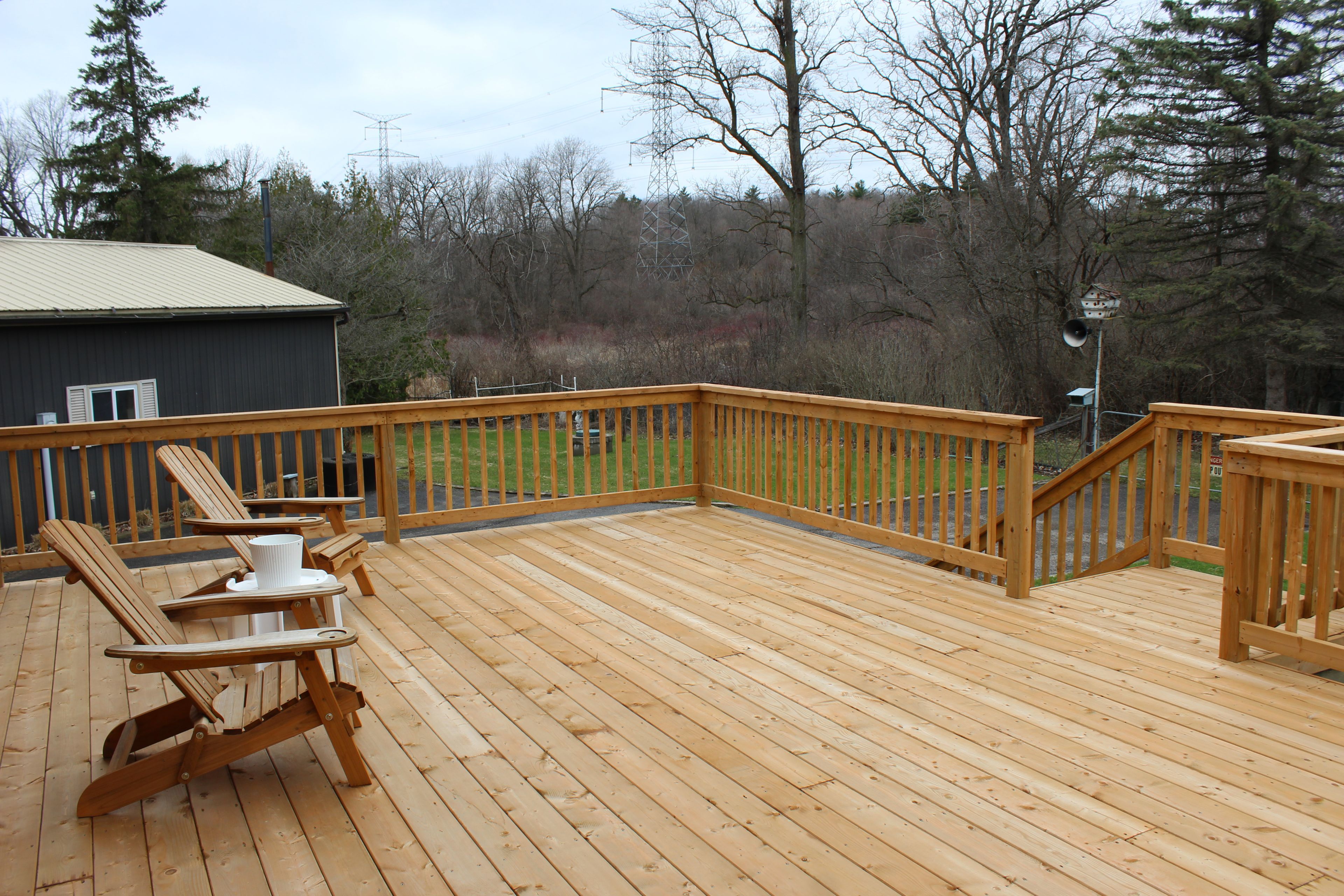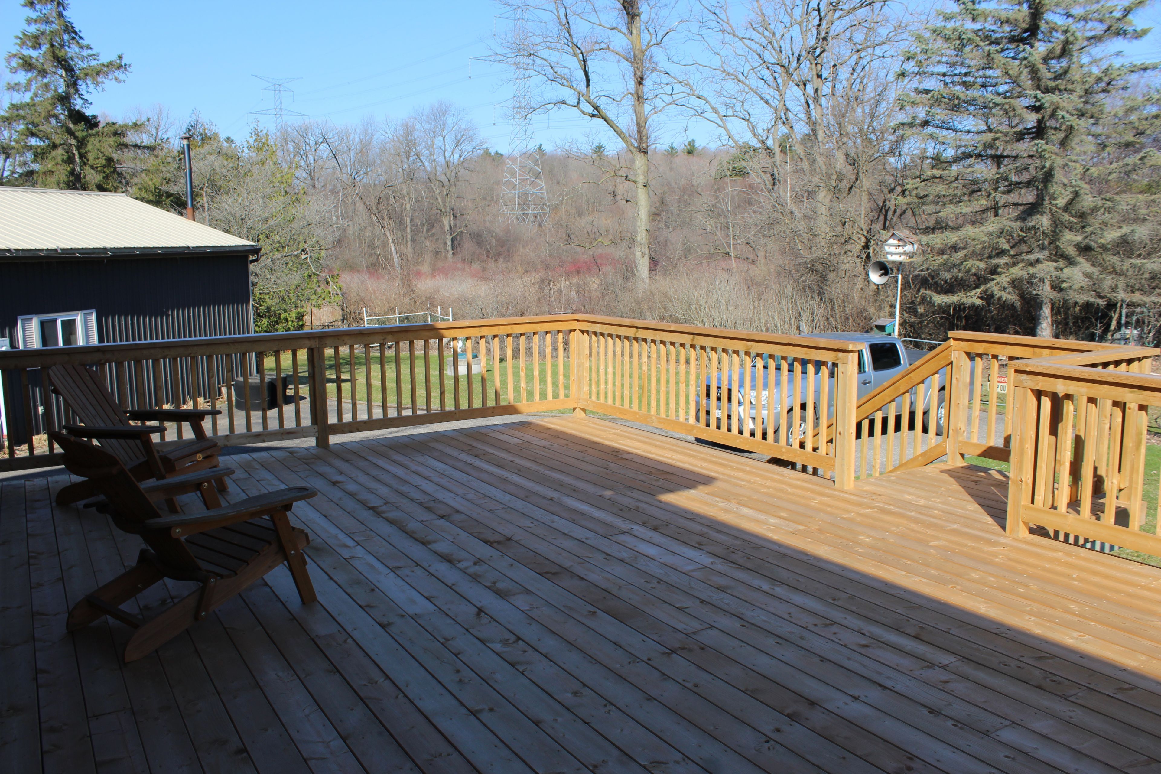 • Large deck, double garage, and workshop for hobbies or storage.