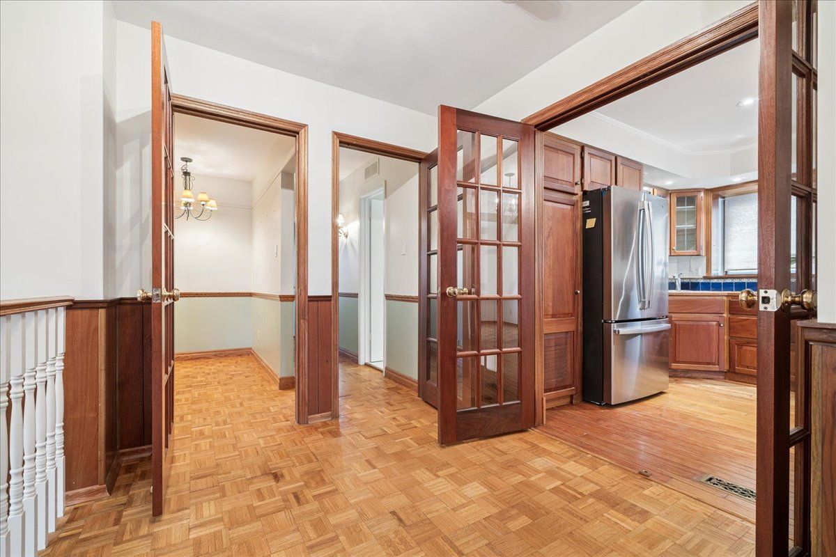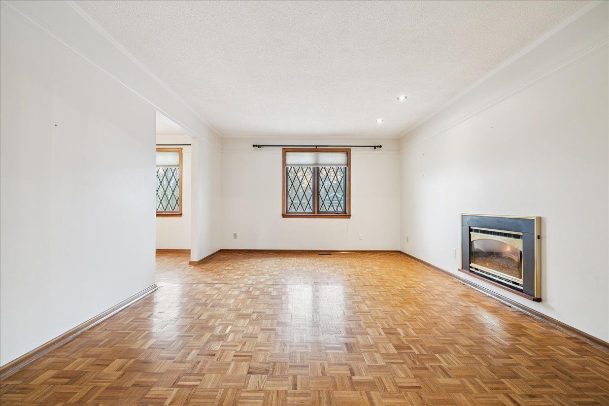 • Cozy living room features a gas fireplace and parquet floors.