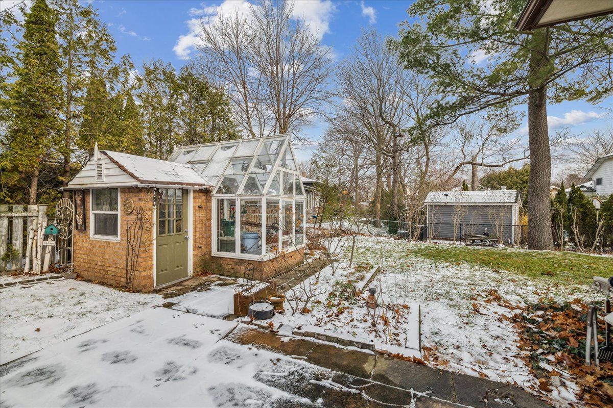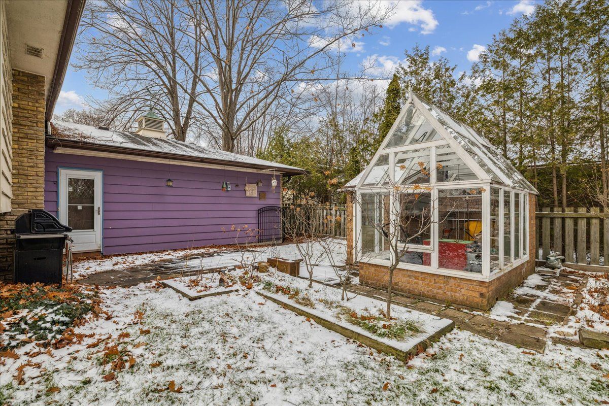 • Big backyard with a patio, greenhouse, and mature landscaping.