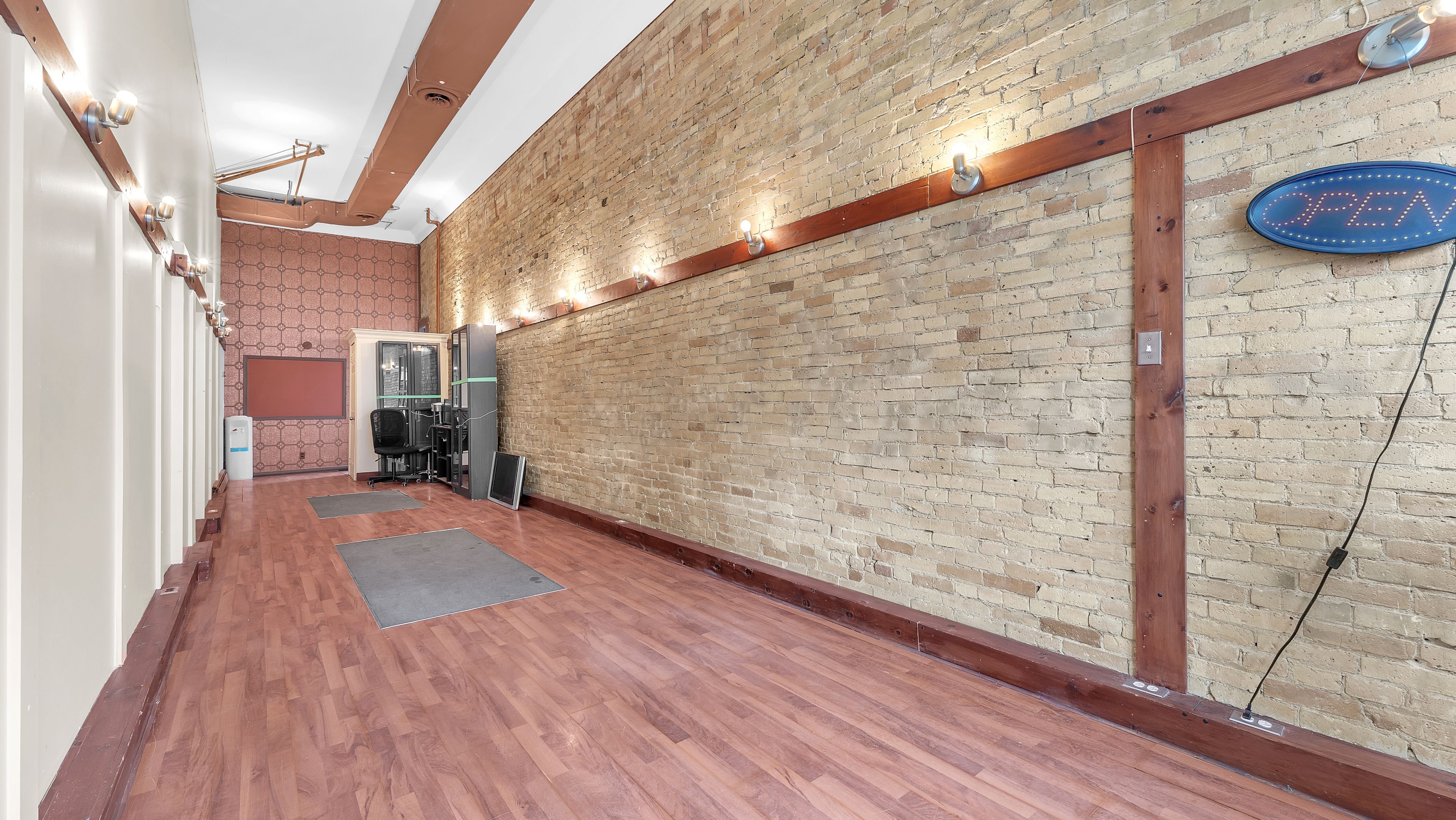 • Space features rustic charm, perfect for customization to suit business needs.