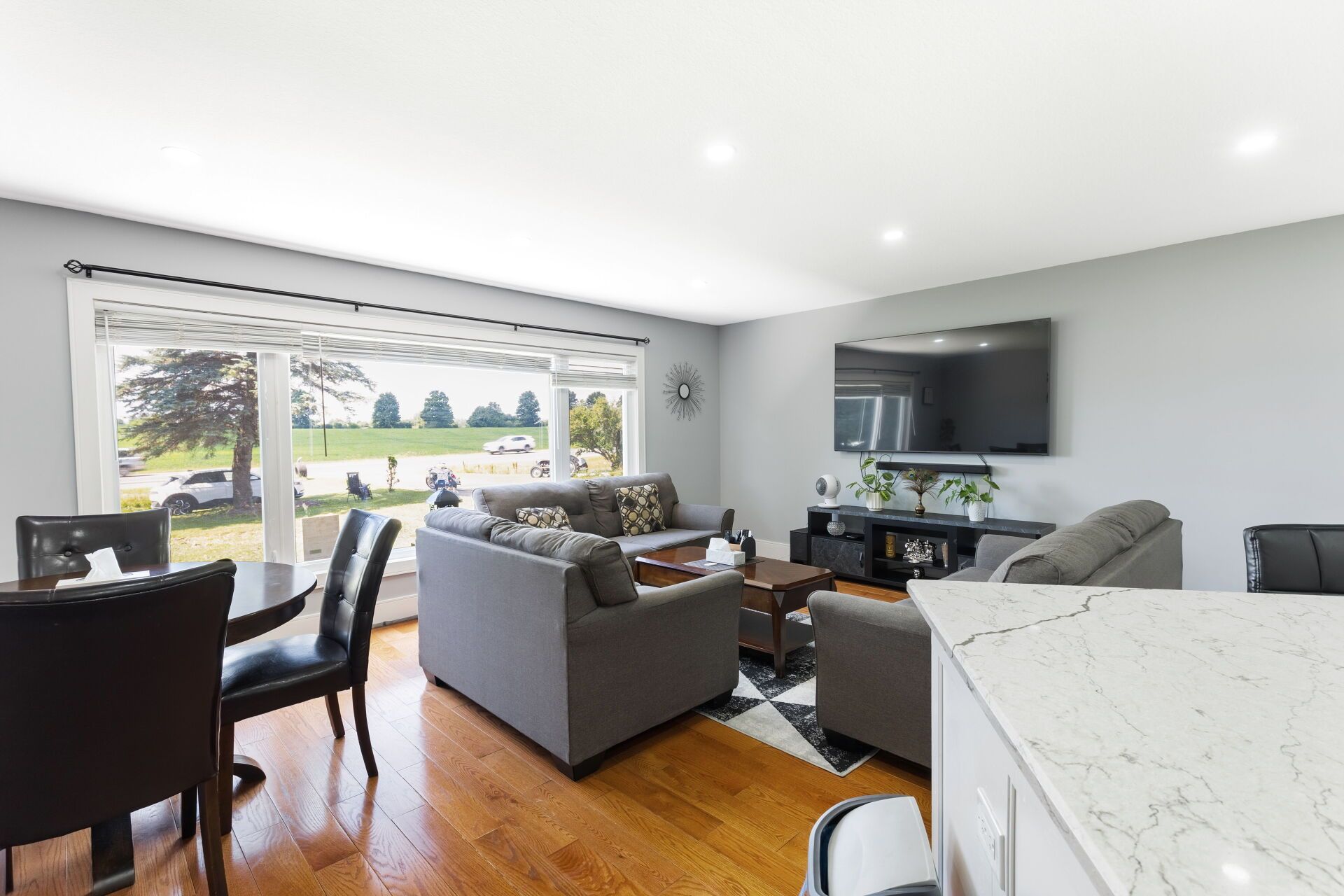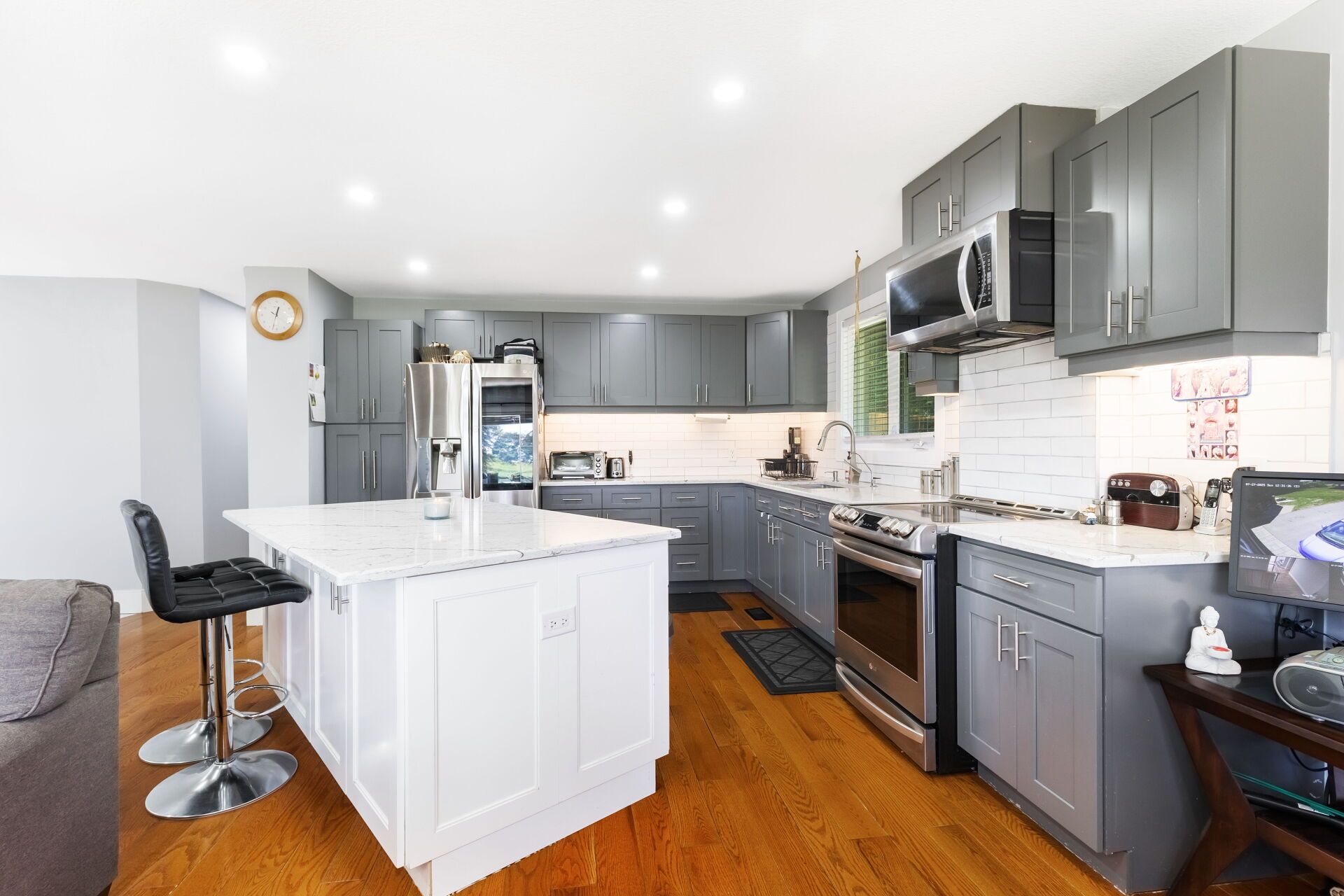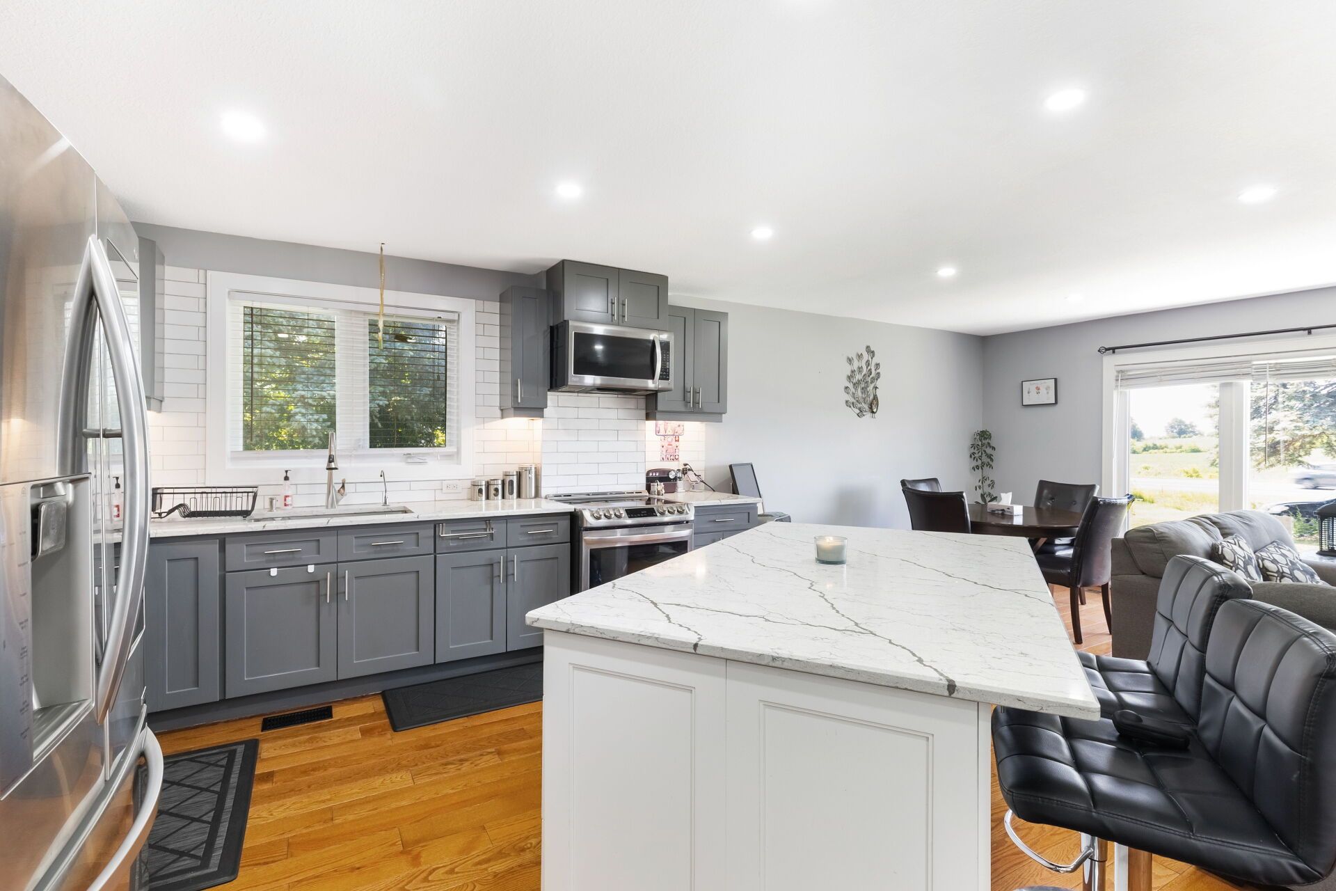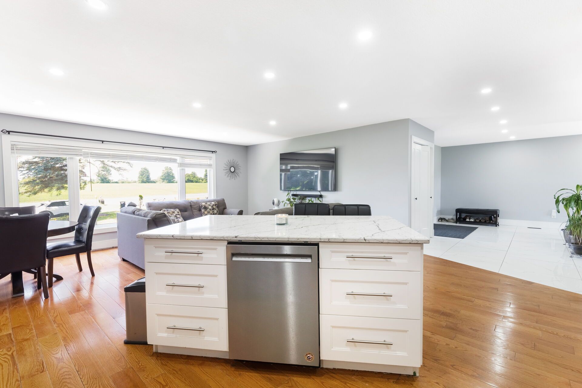 • Open-concept kitchen featuring a large island and quartz countertops.