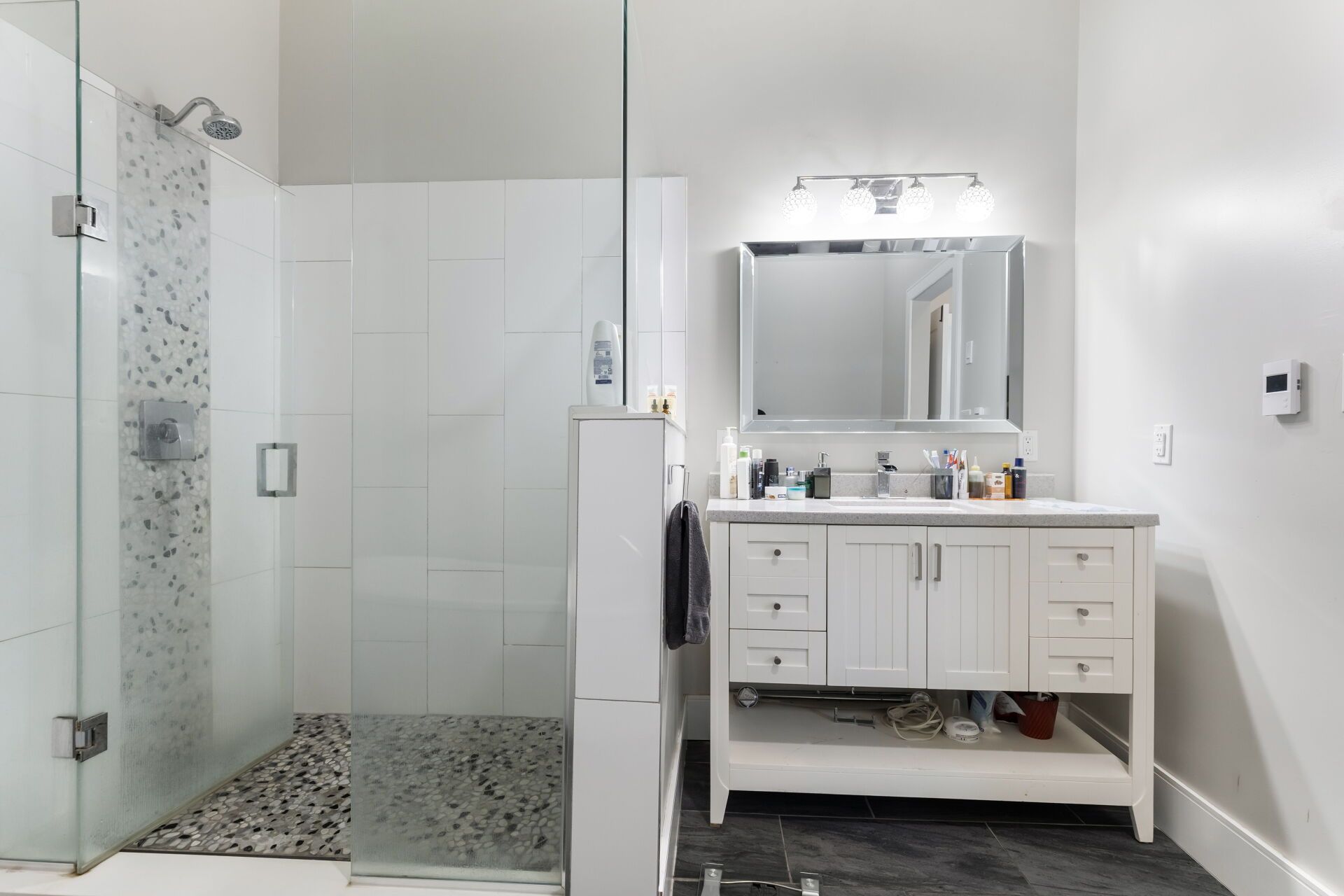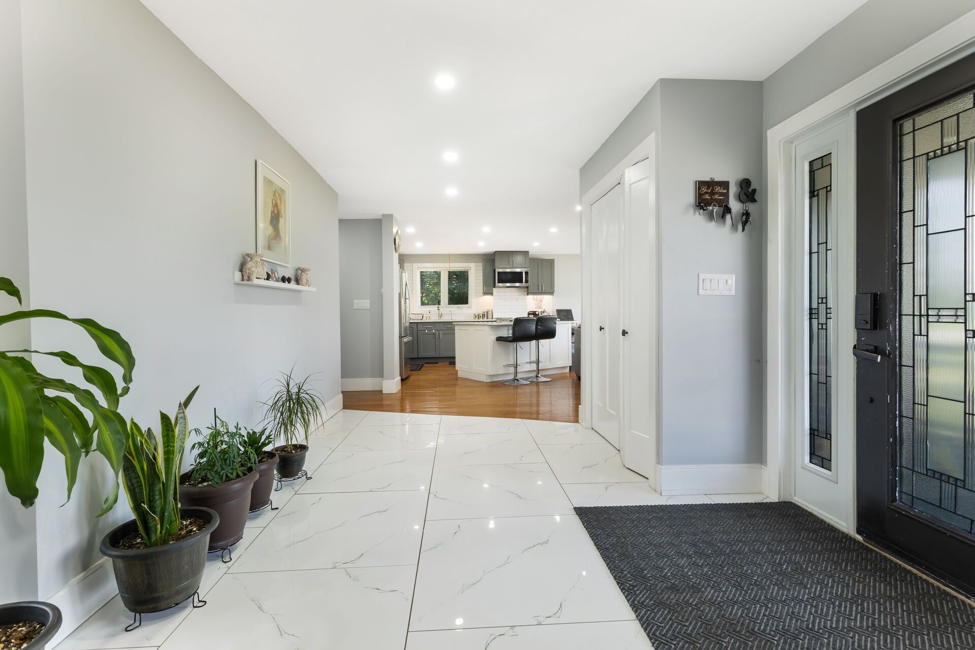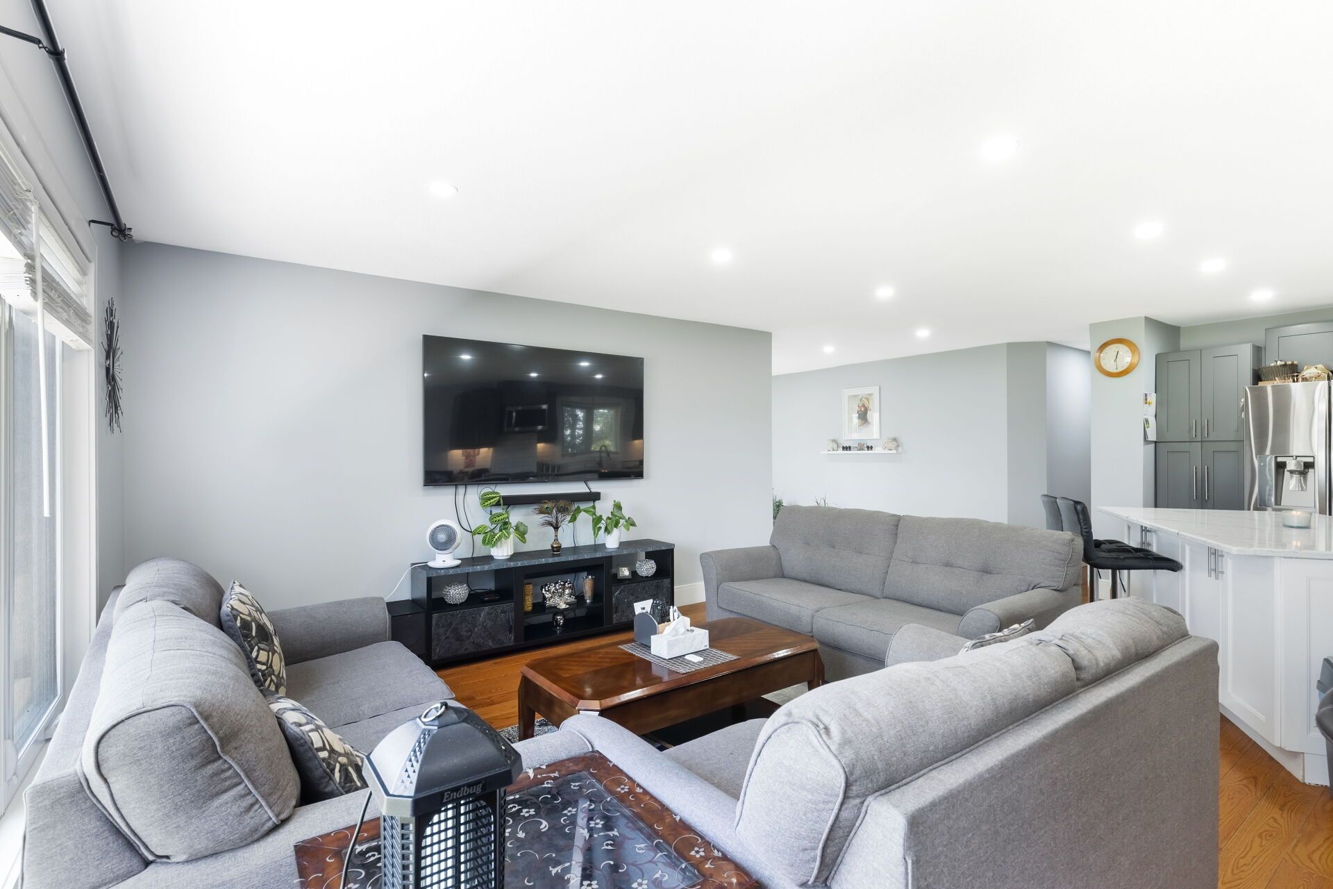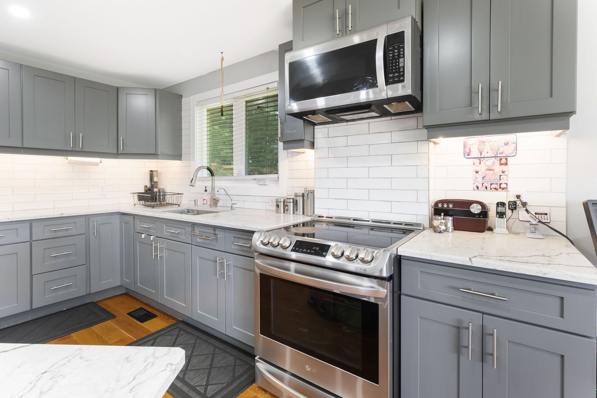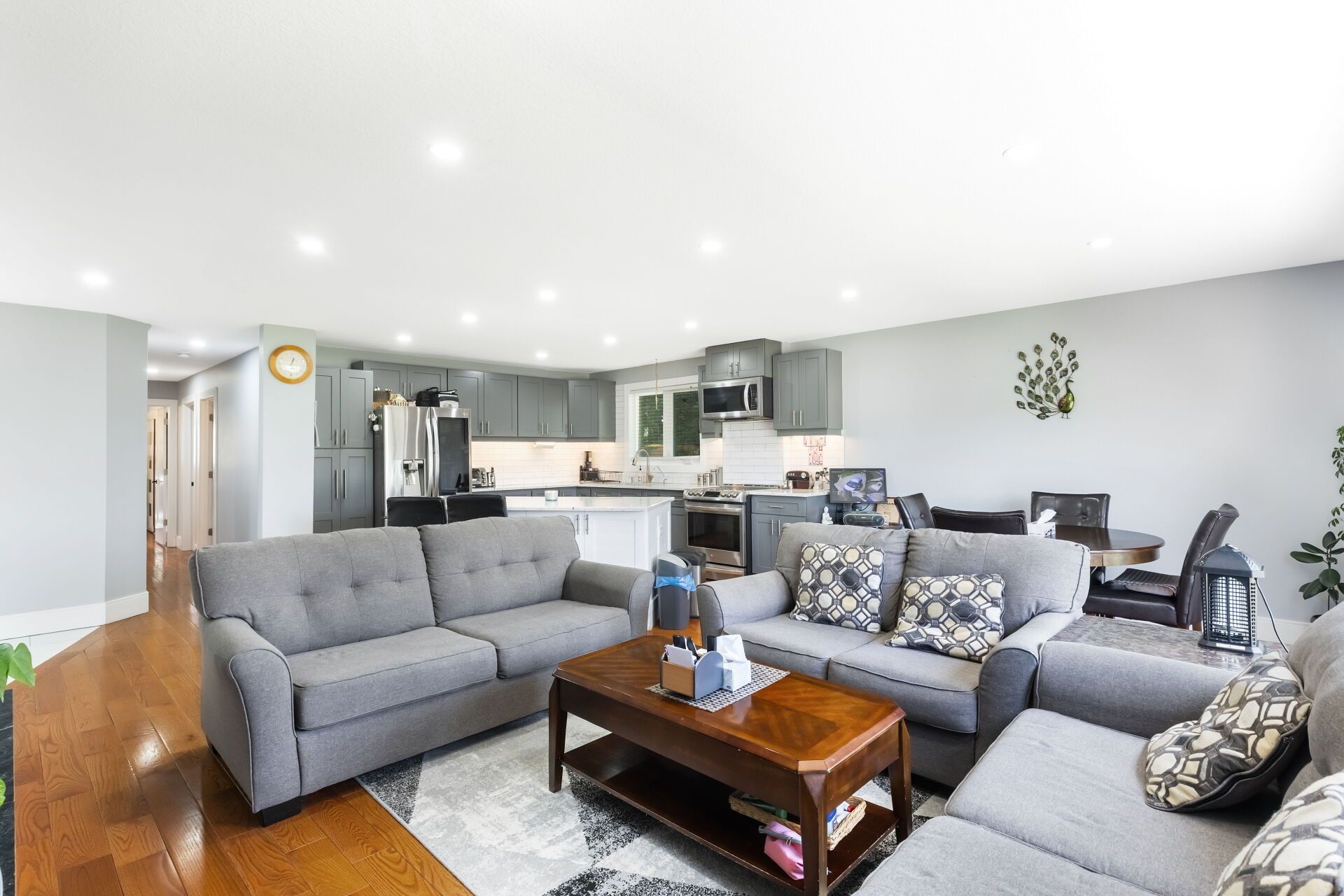 • Open-concept kitchen featuring a large island and quartz countertops.
