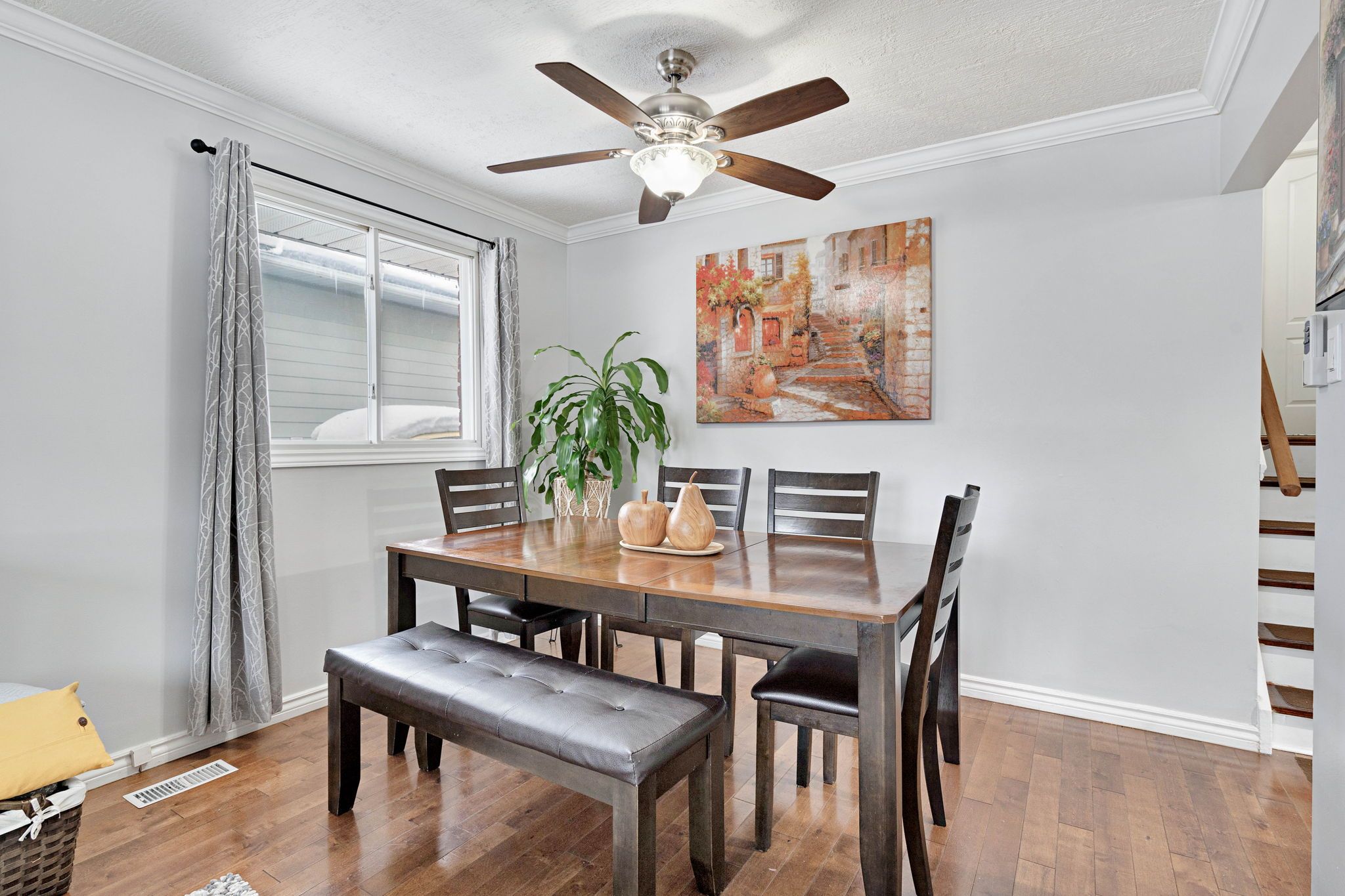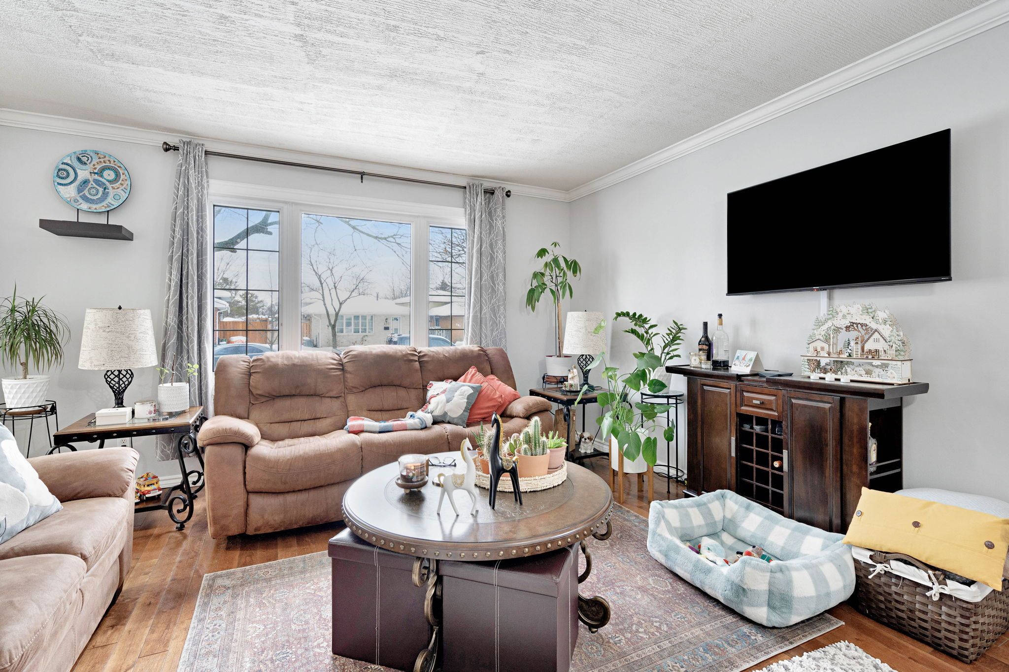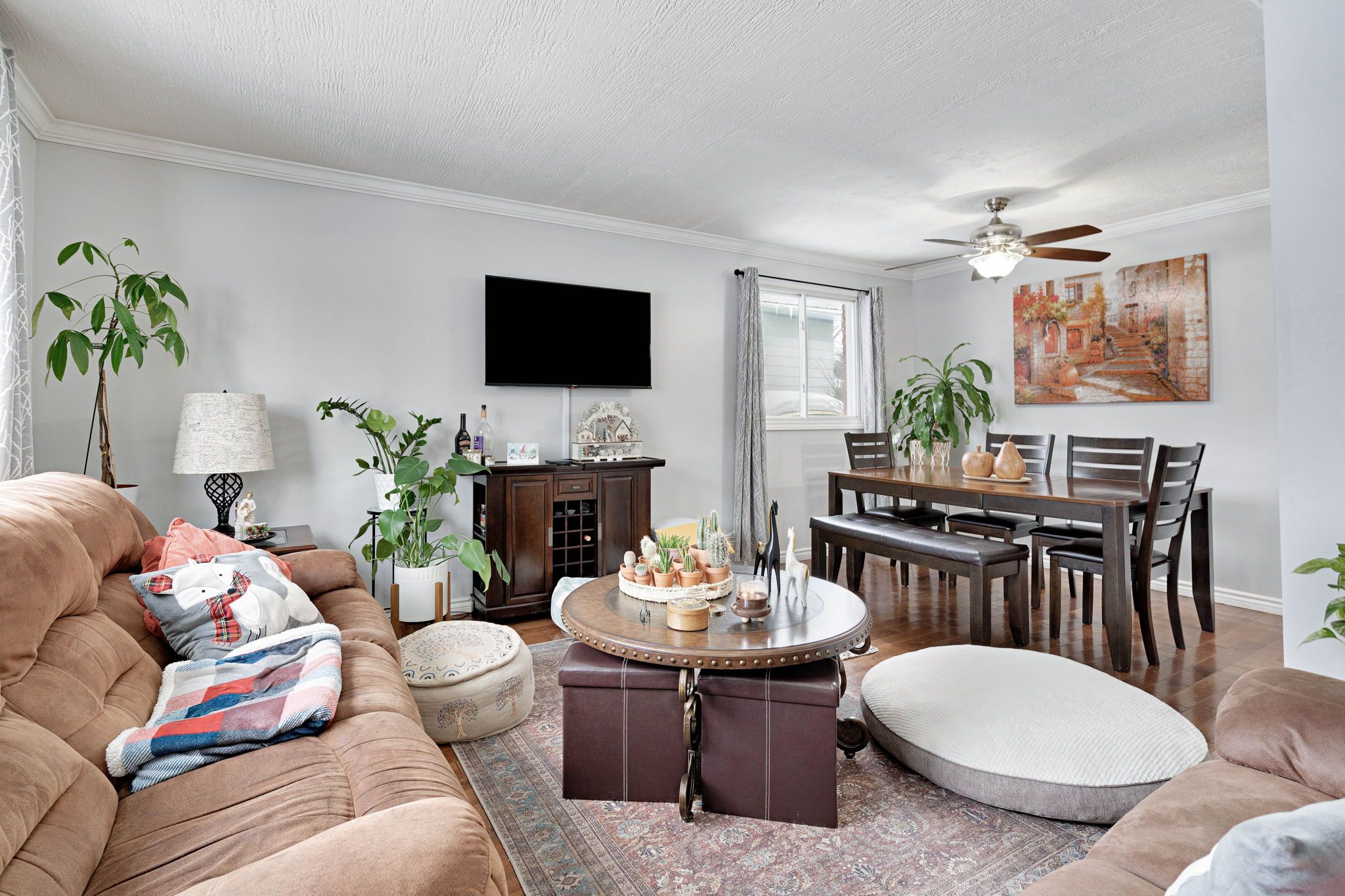 • Bright open living/dining area featuring large front window and hardwood flooring.