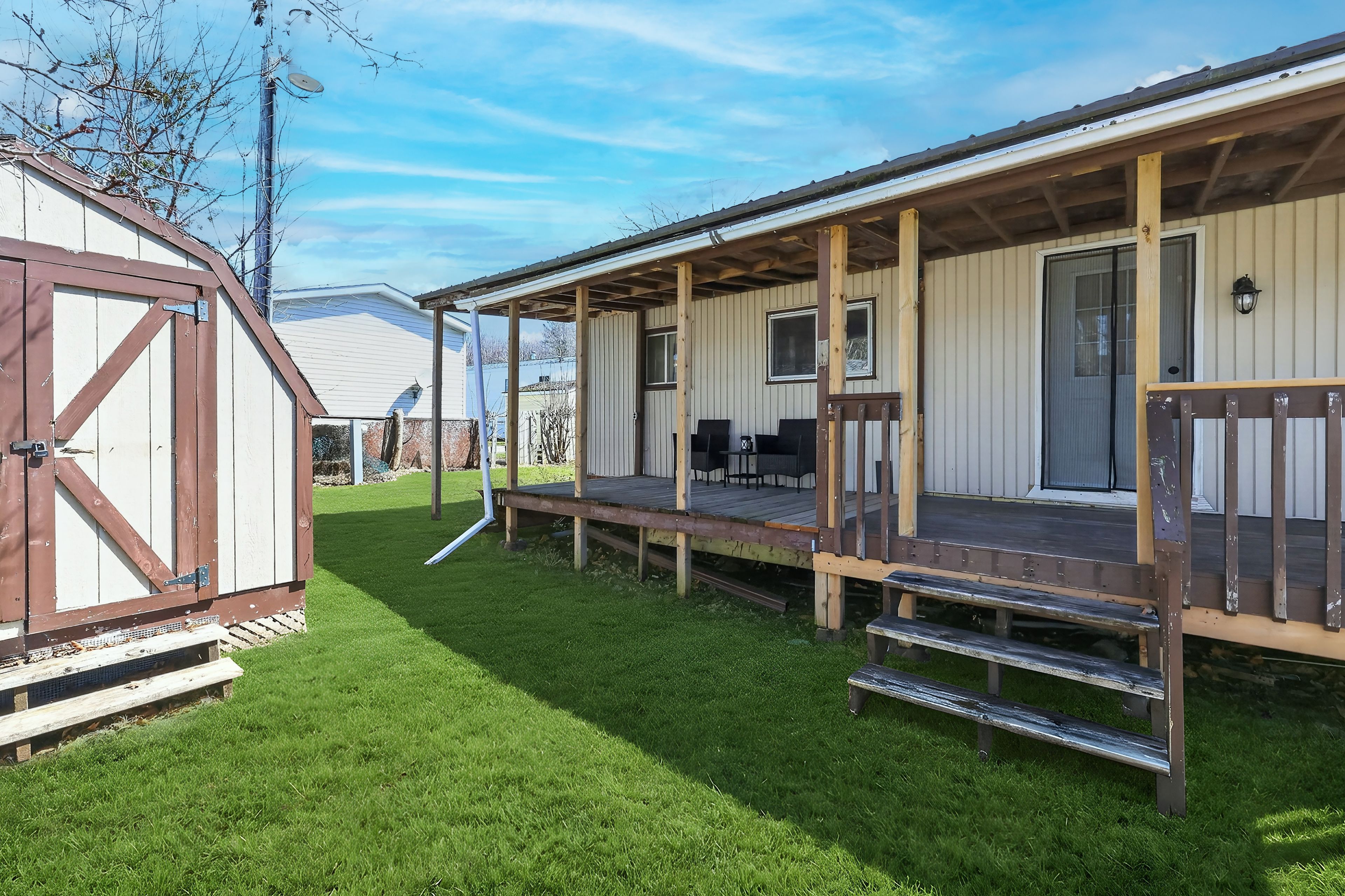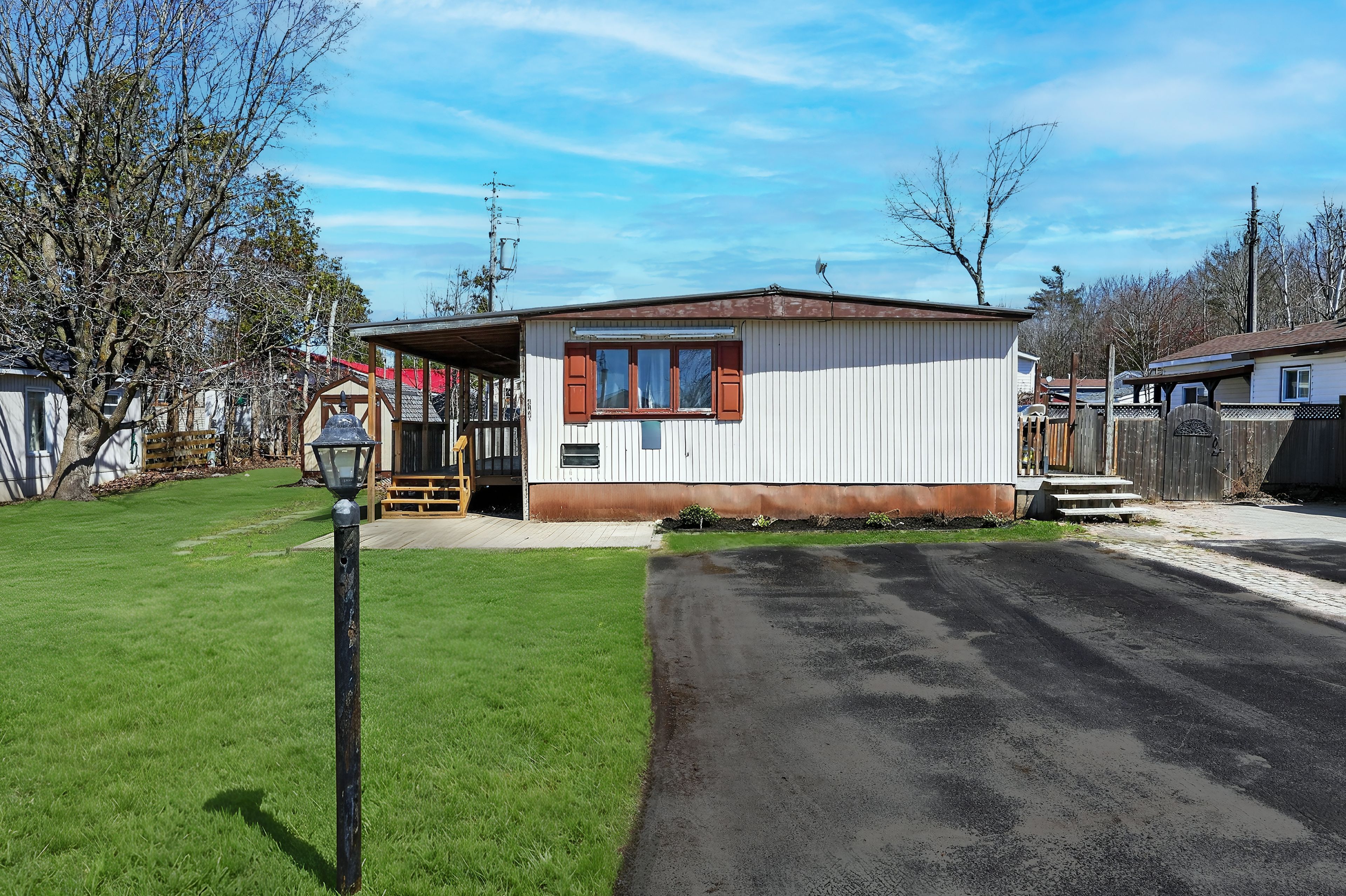 Great opportunity for first-time home buyers! Located just five minutes outside of orillia in the silver creek estates mobile home community, this charming & affordable modular home sits on one of the rare double lots in the park. Featuring an open-concept layout, the home offers a bright kitchen, living, & dining area-perfect for comfortable living & entertaining. It includes 3 bedrooms, 1 bathroom, & the convenience of in-suite laundry. Enjoy outdoor living with a spacious backyard, an even larger side yard, a storage shed, & a large covered porch-all at an incredible value. The property also offers private parking for four vehicles. Important updates include washer & dryer (2023), 200 amp electrical panel, roof (2018), & shower (2022). The living room also features an optional gas fireplace hookup for added comfort & future customization. Ideally situated close to highway 11 south, making commuting easy & convenient. A fantastic chance to own an affordable home with extra space & great potential!