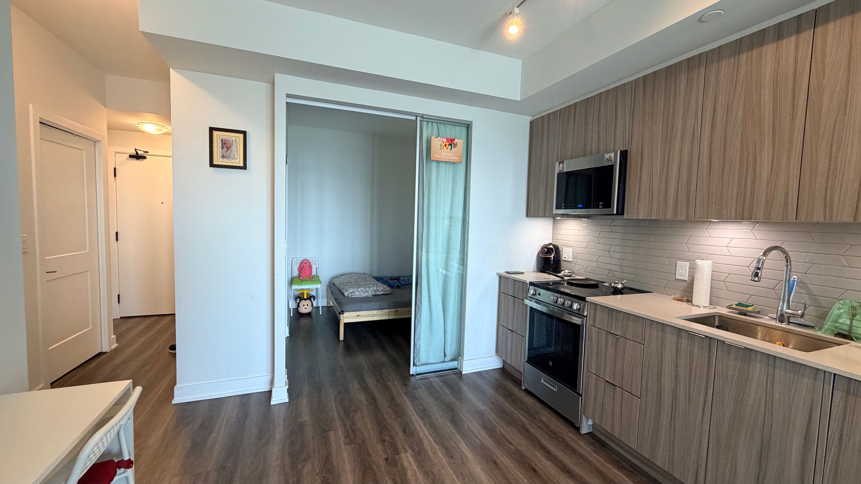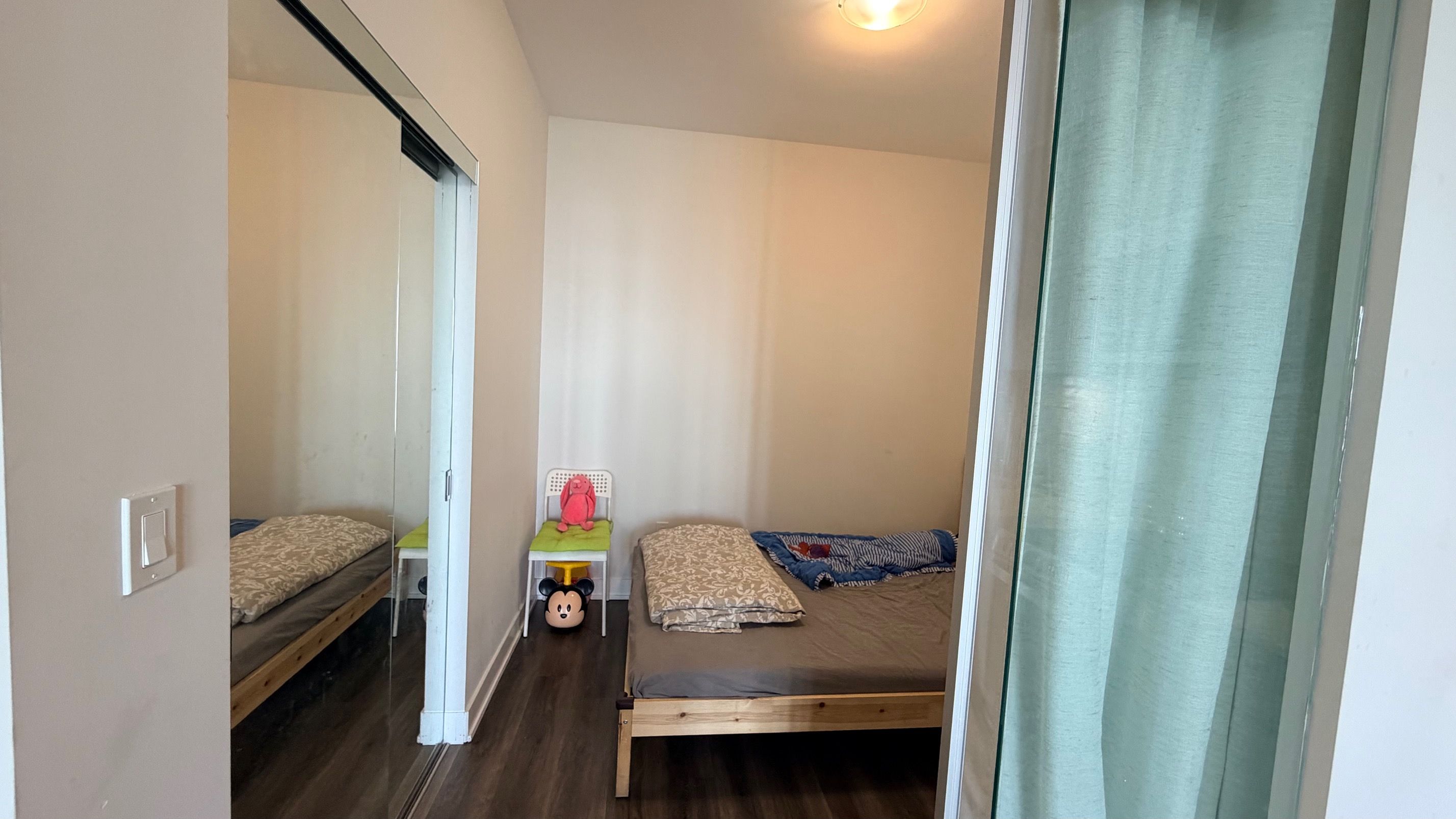 Excellent location. New building in downtown mississauga. Two bedroom, two full bathrooms. Open concept & bright. Laminate floor through out. Unobstructed north view. Floor to ceiling windows, modern window coverings, walk out to open & spacious balcony from living room & primary bedroom. Stainless steel appliances, quartz countertop & modern backsplash with ample storage. In-suite laundry. **includes parking & locker** amenities include 24h concierge, yoga studio, party room, gym, kids play room, outdoor lounge, sun terrace with bbqs, theatre....& more. **food basic, baskin robbins, and pet store in building** highly accessible to public transportation, shopping, grocery, hwy 403. Steps to square one shopping centre, library, transit, sheridan college, parks, and dining.