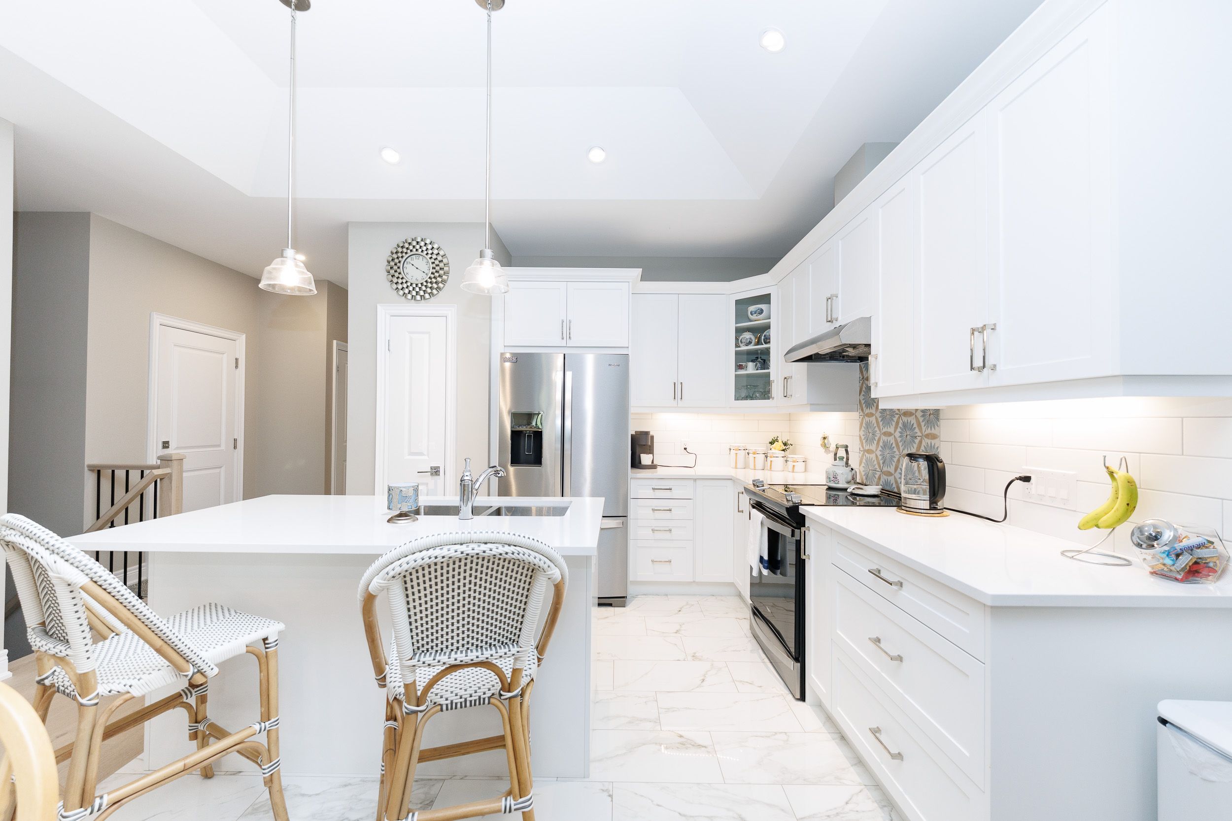 • Modern kitchen with quartz countertops and breakfast bar for entertaining.
