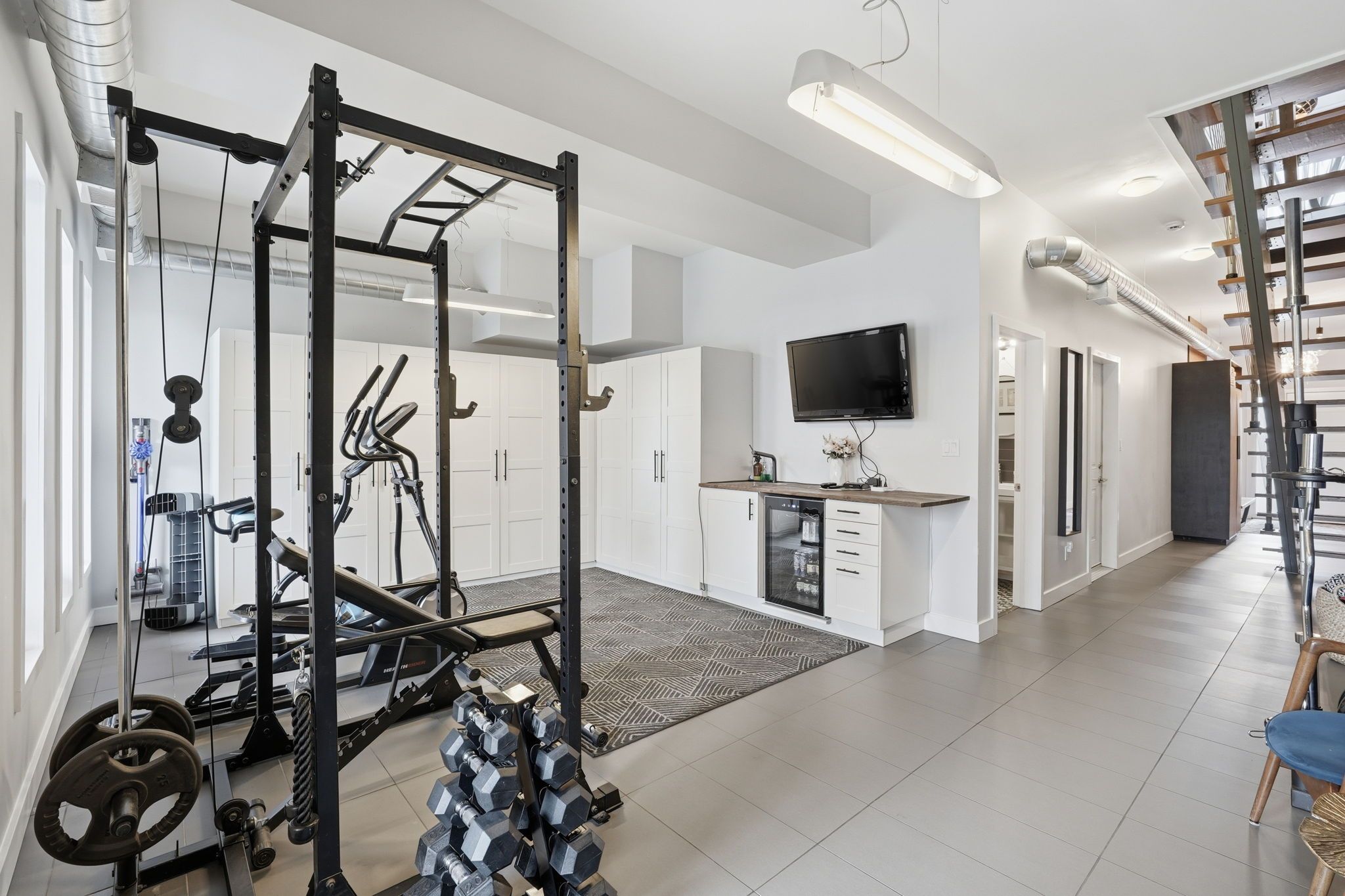 • Main-level gym and premium kitchen with oversized island for convenience.