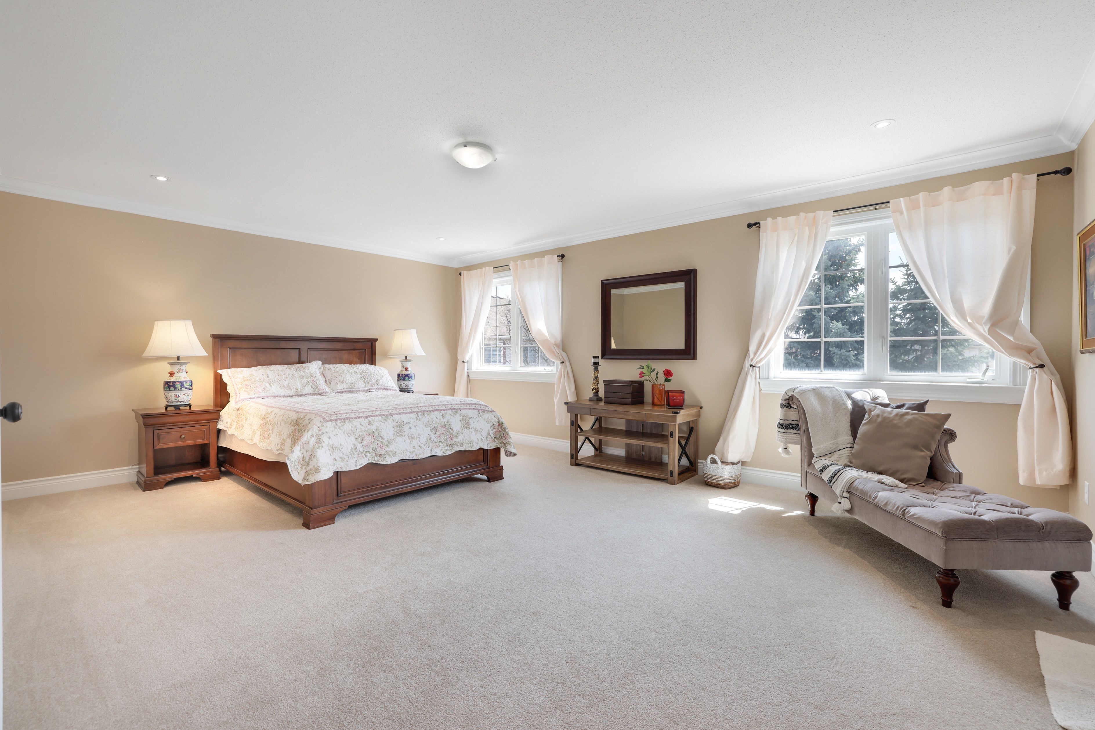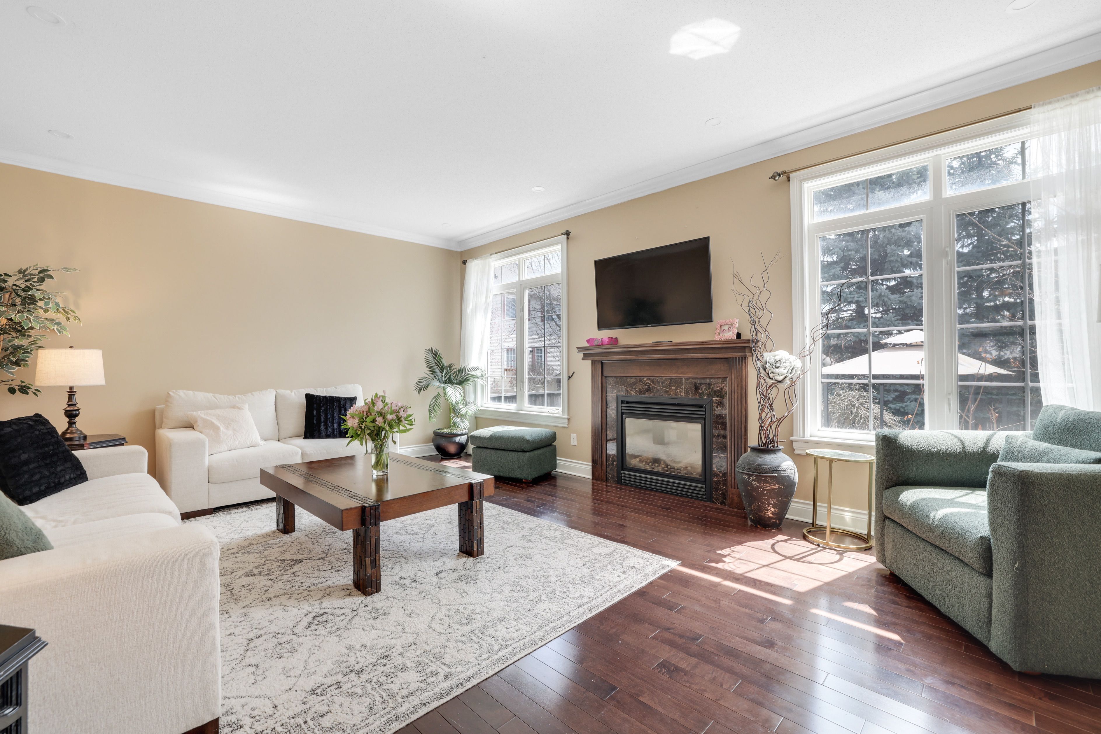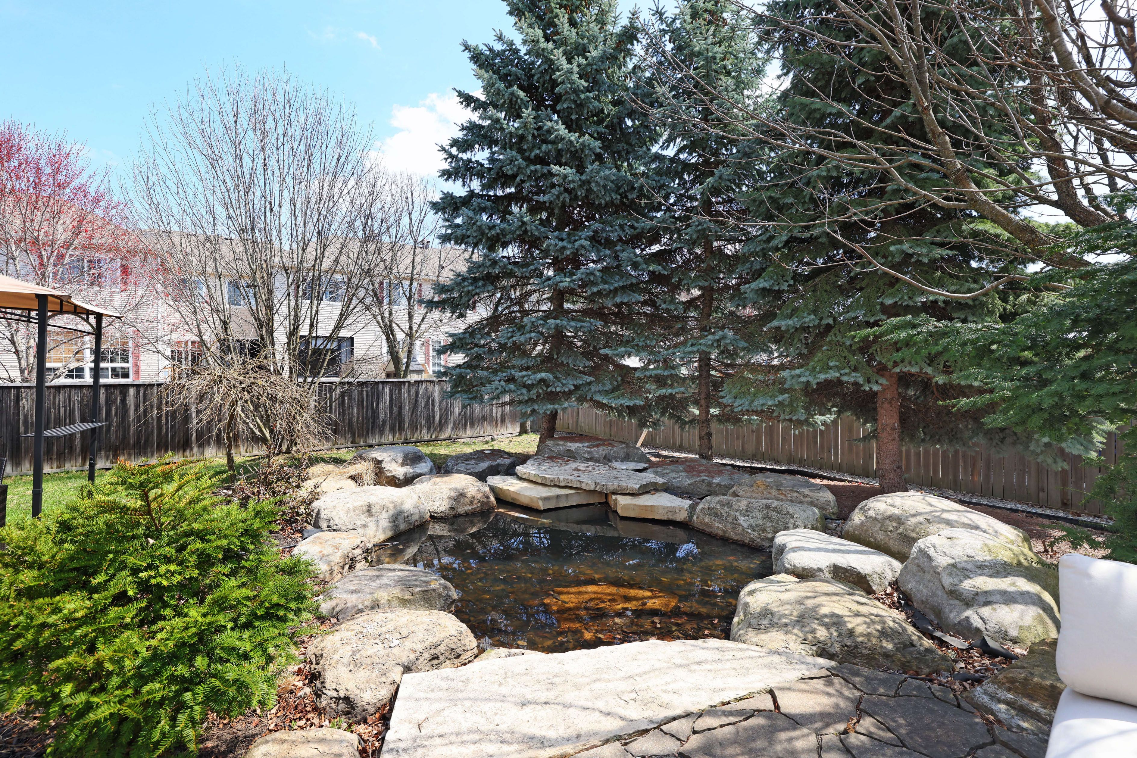 • Private backyard oasis with mature greenery and a tranquil pond.