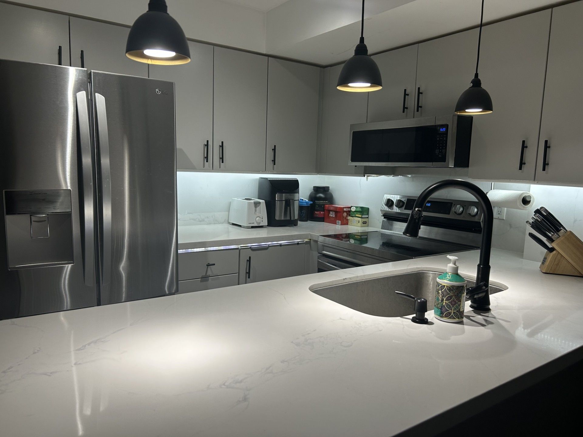 • Modern open-concept kitchen with a breakfast bar, great for hosting.