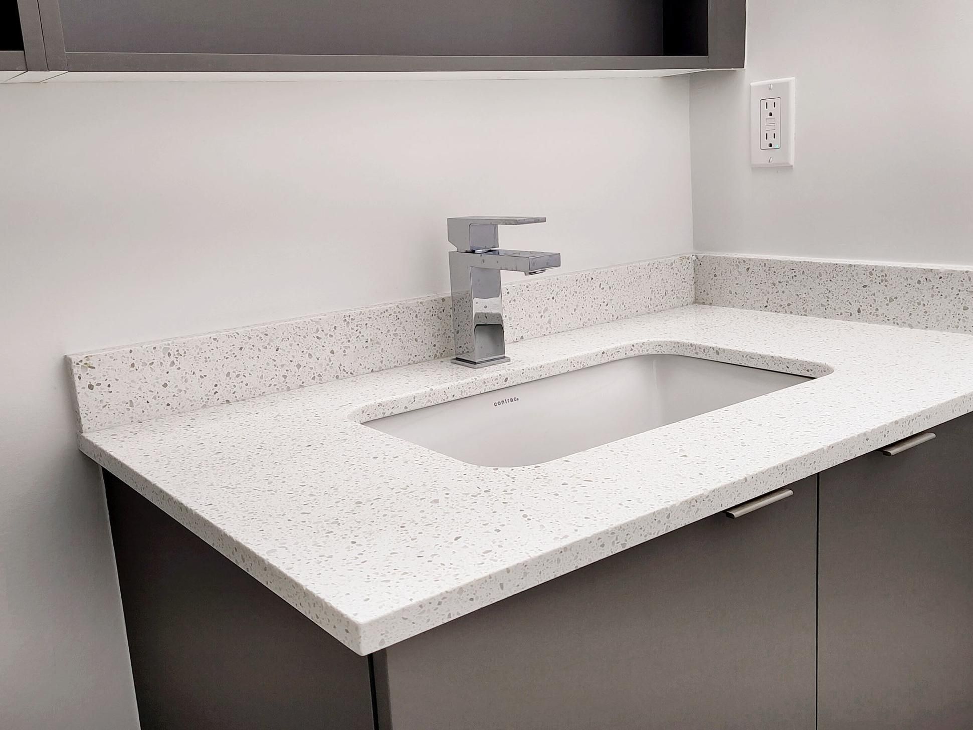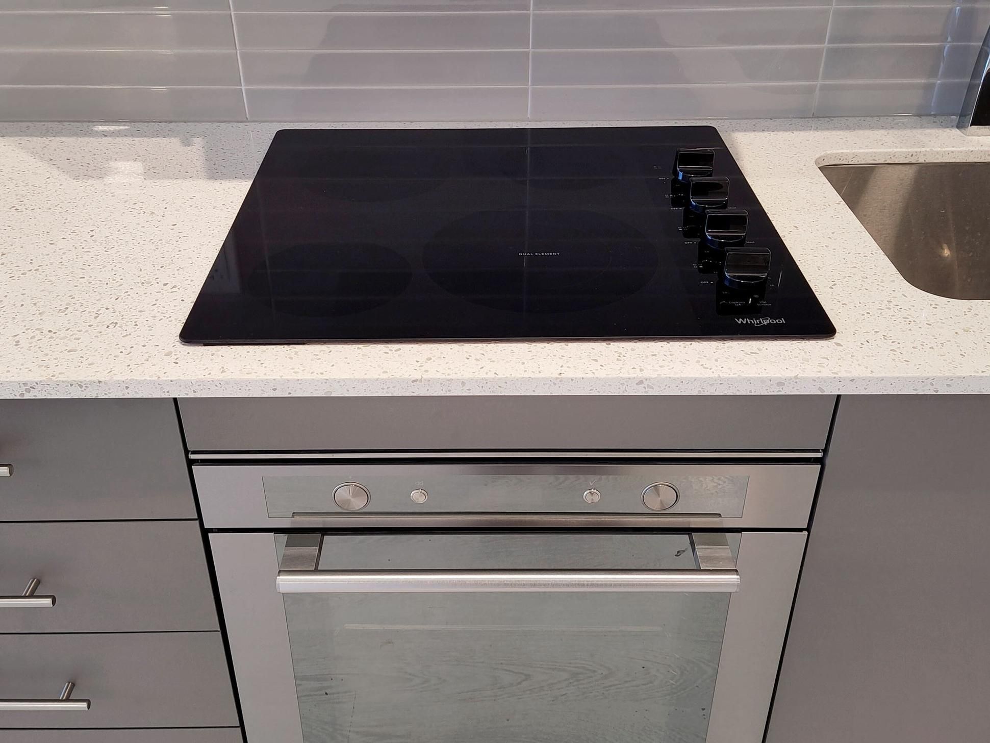 • Modern kitchen with quartz counters and built-in appliances.