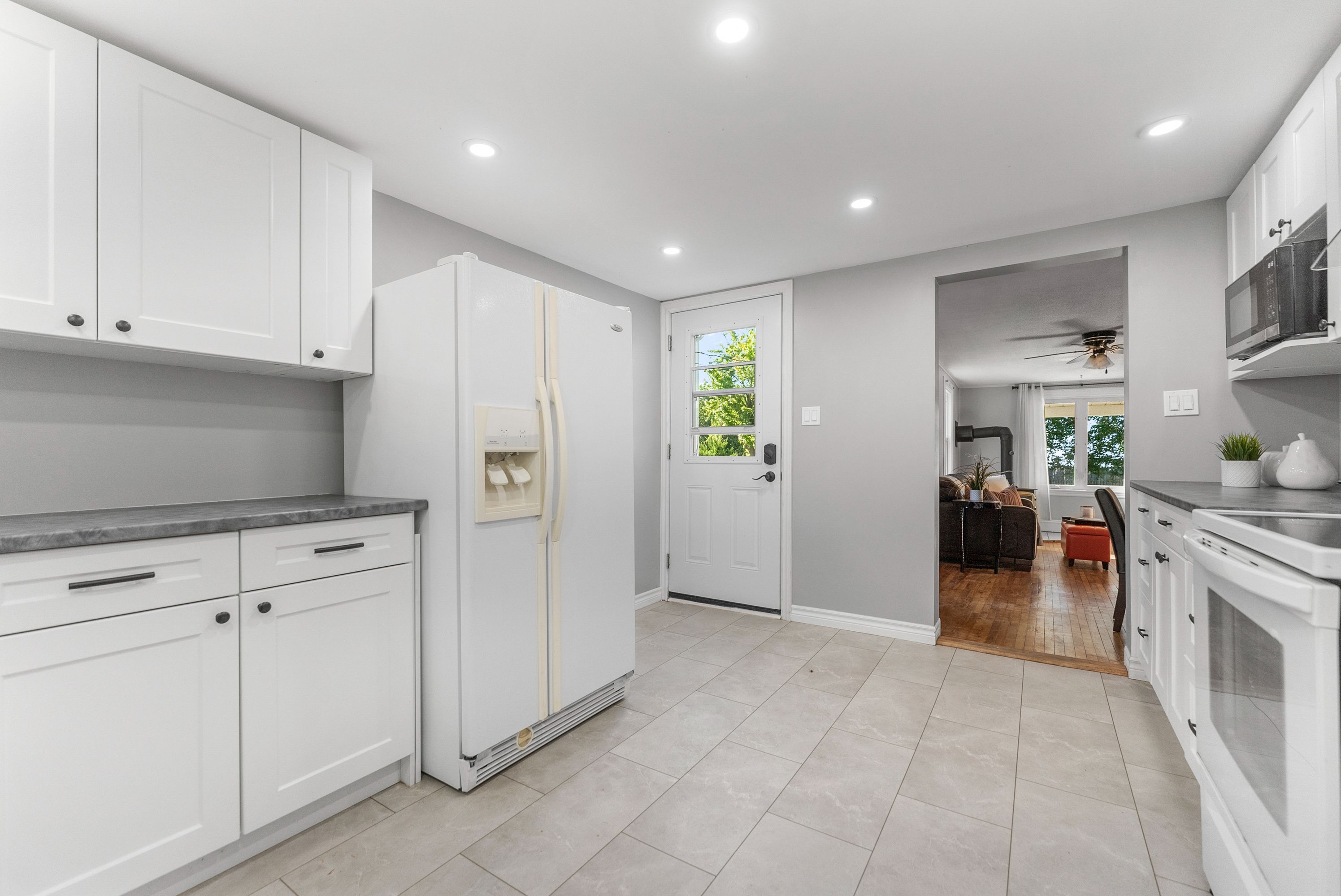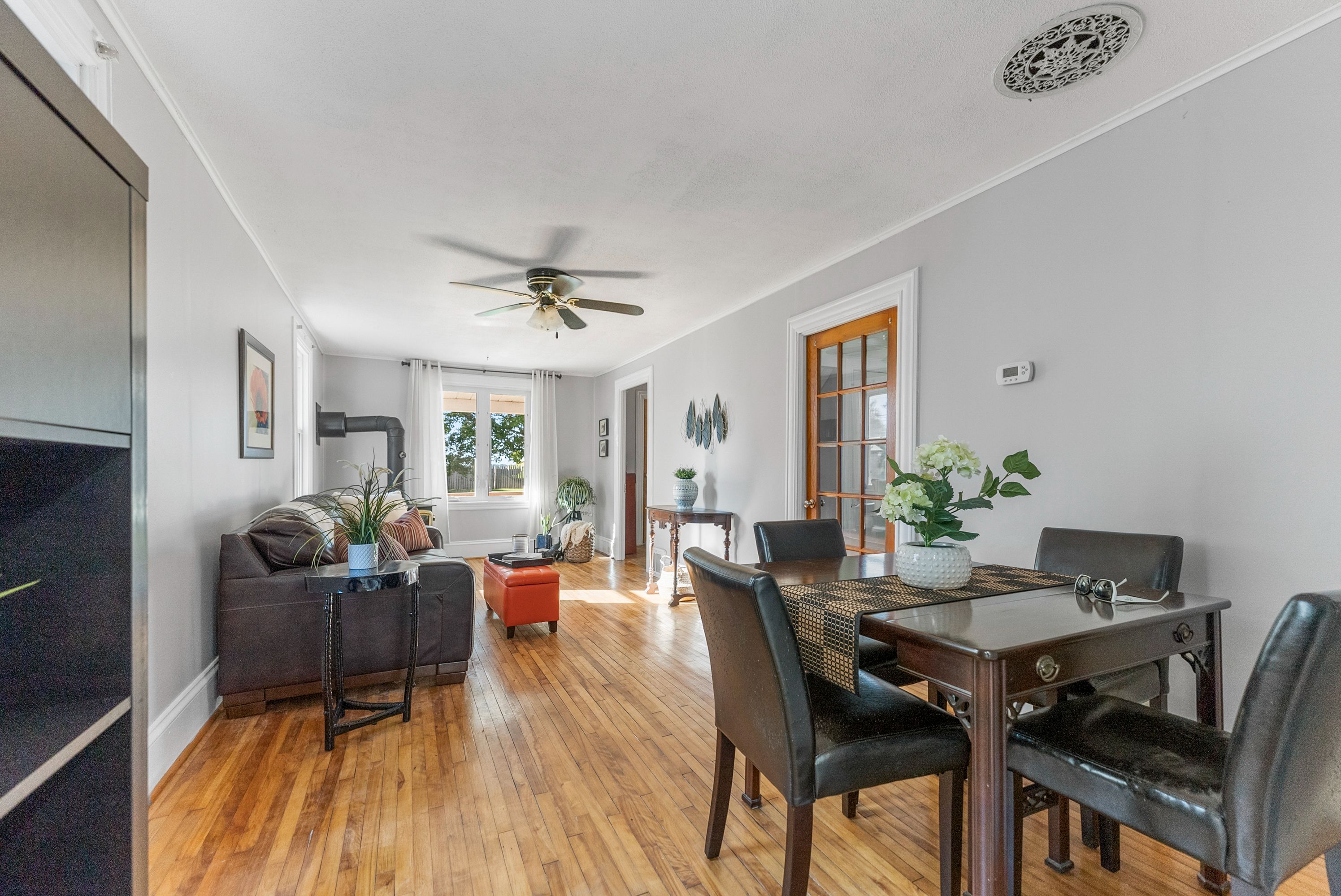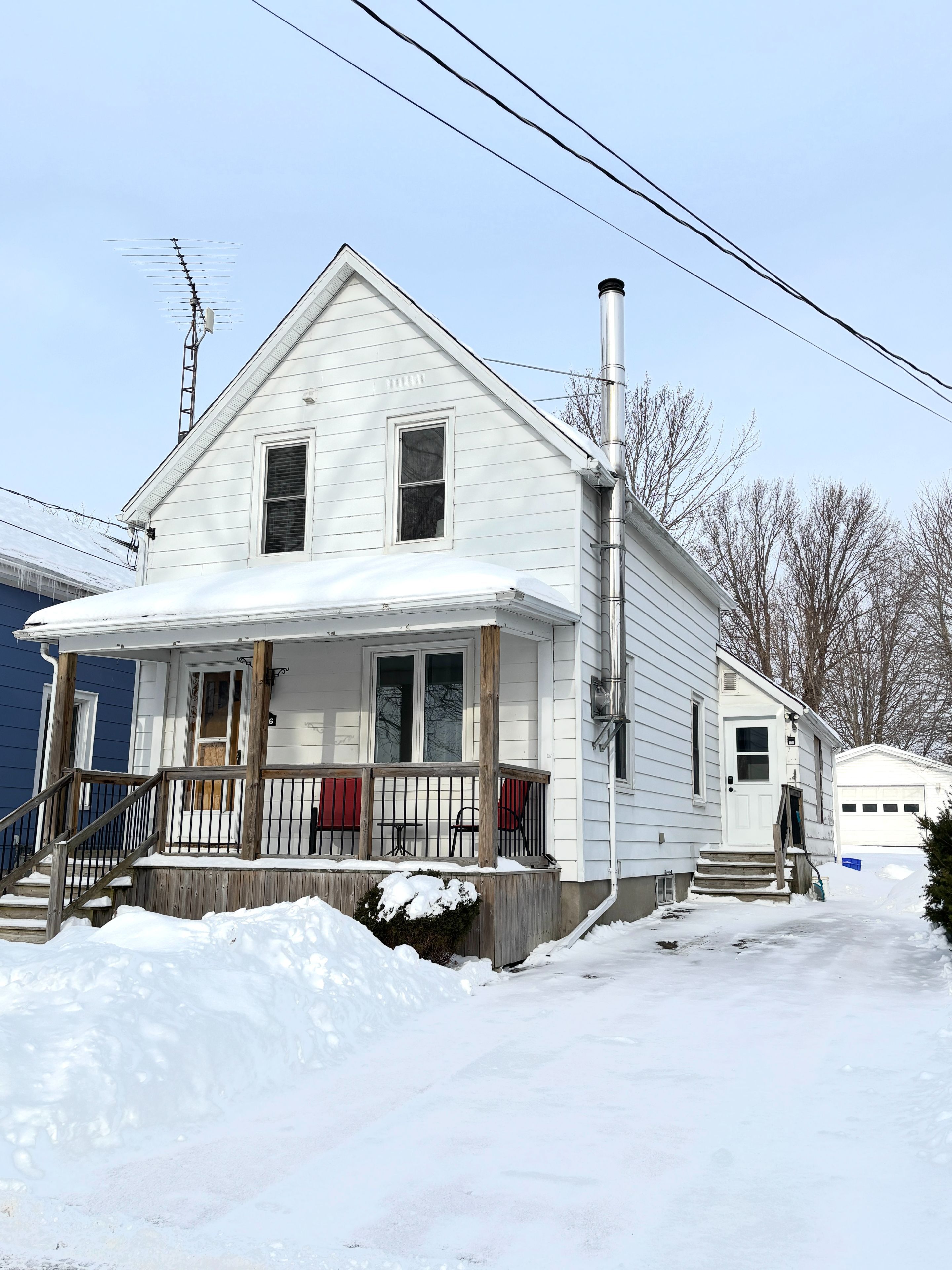 Discover the charm in this home perfectly positioned directly across from prescott's historic fort wellington, offering picturesque views of the st. Lawrence river right from the front porch! Enter the side door into a bright, updated kitchen with extensive white cabinetry and tasteful countertops that flows into a cheerful living and dining space, highlighted by original hardwood floors and anchored by a cozy woodstove. The main floor also features a convenient laundry area with space ready to add another bathroom. The original wood staircase leads to a completely modernized second level with new insulation, drywall, and updated laminate flooring, hosting three bedrooms (including one perfect for a den or home office) and an updated 4-piece bathroom. Outside, enjoy a deep, fenced yard and a fully insulated, oversized detached garage - perfect as a workshop or a place to gather friends for the game! With the peace of mind that comes from a brand new forced air gas furnace and a new owned electric hot water tank, this character-filled home is ready for its next chapter!