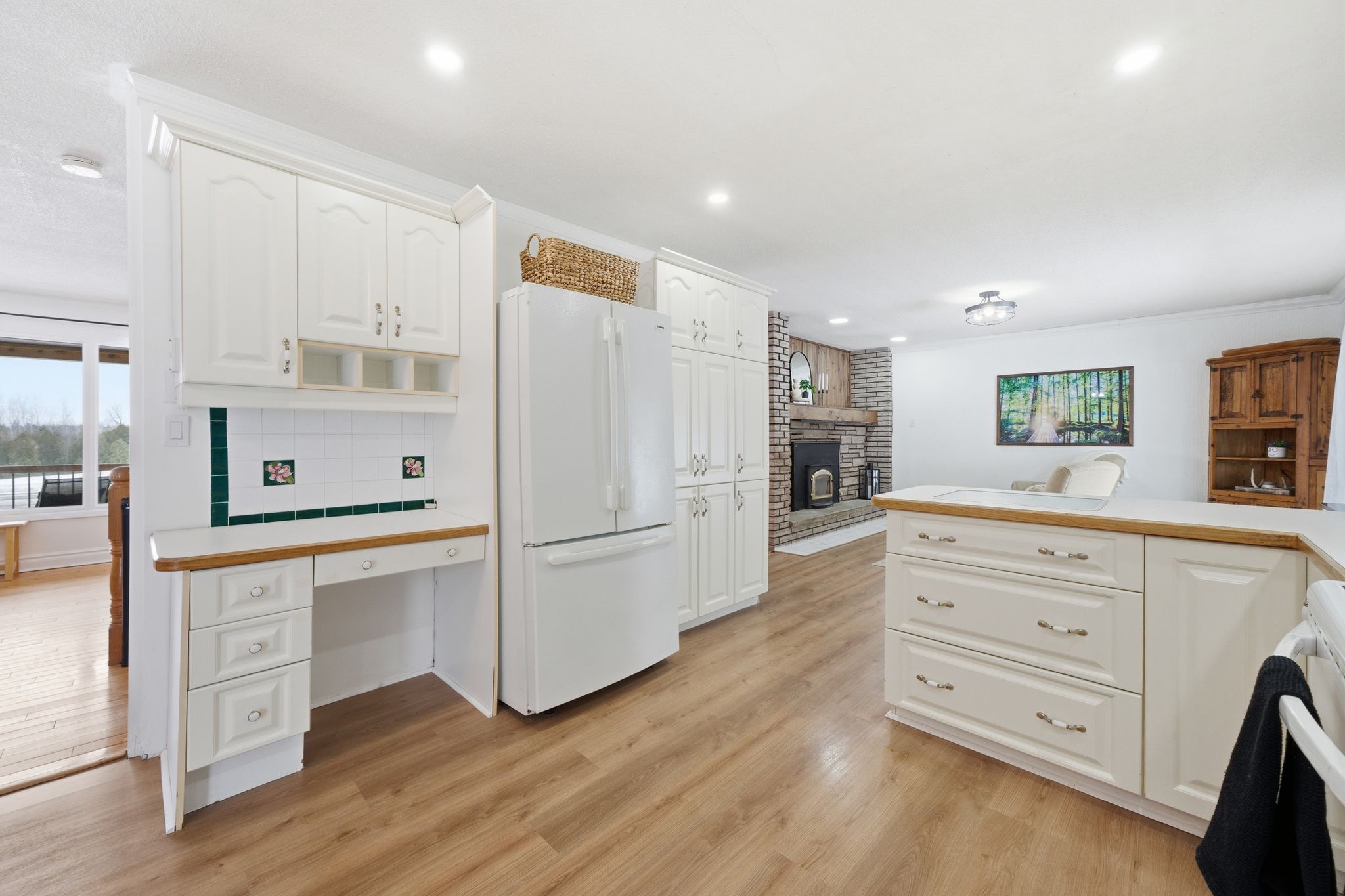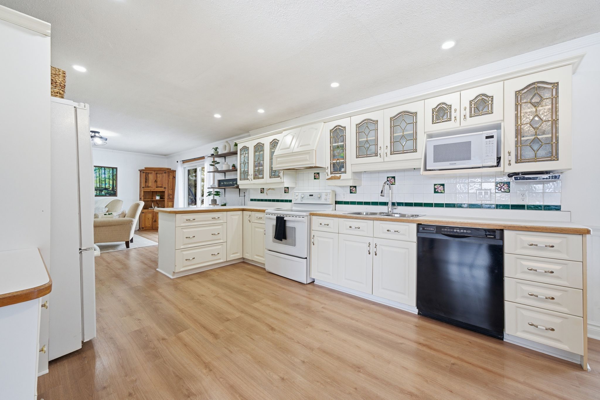• Large kitchen with plenty of cabinetry and stained glass features.