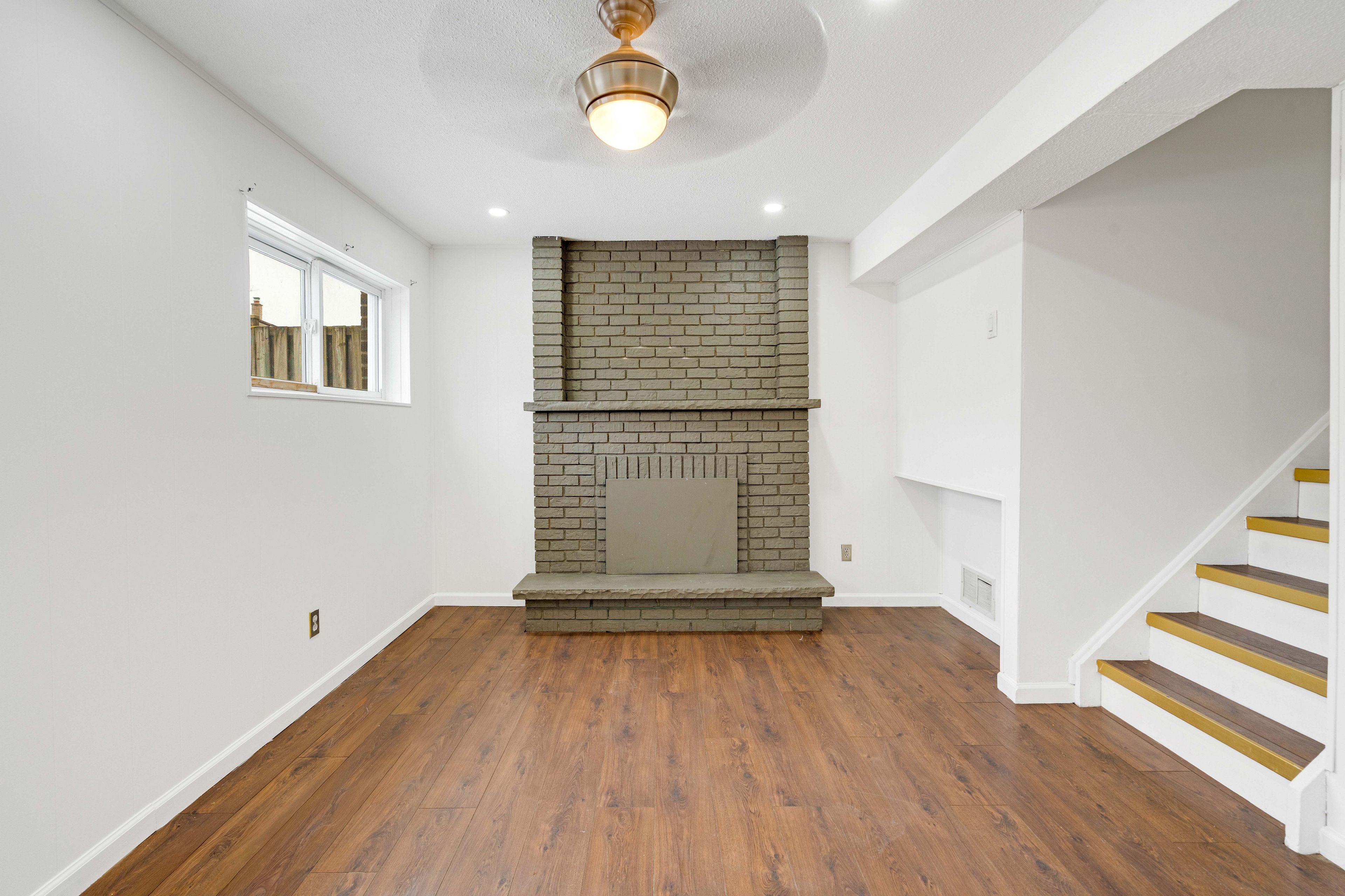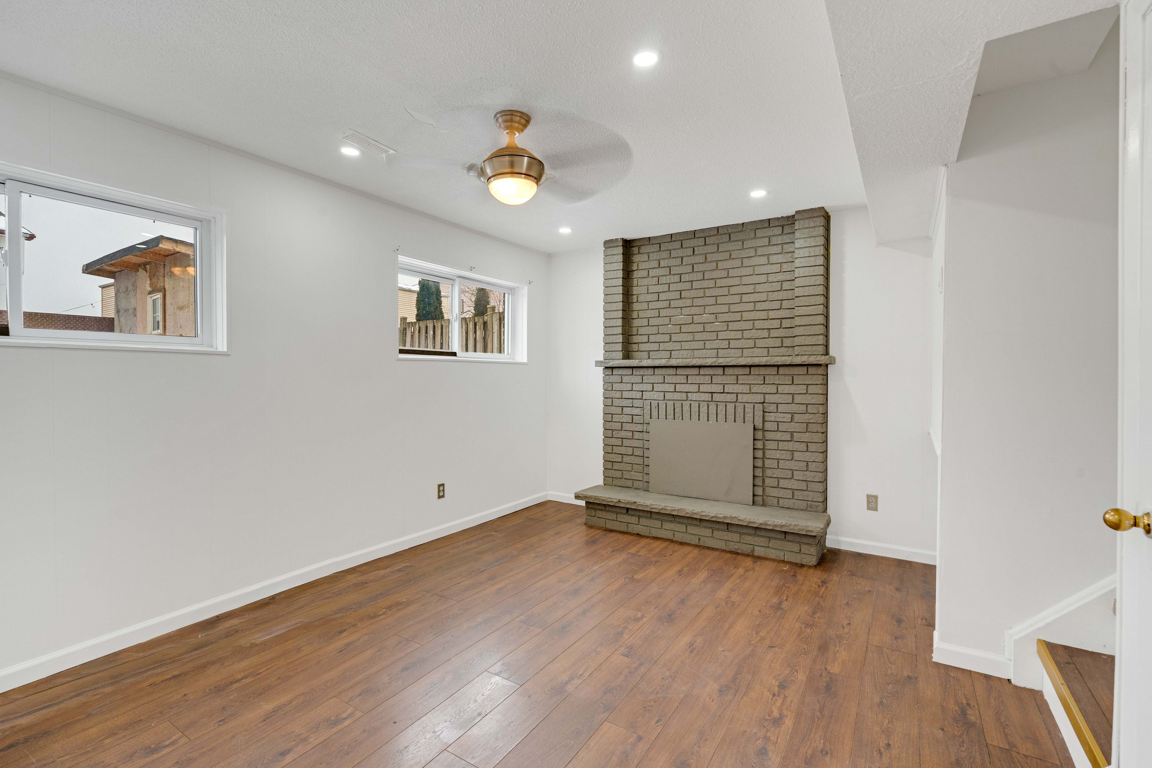 • Lower level features a family room with a fireplace and large windows.