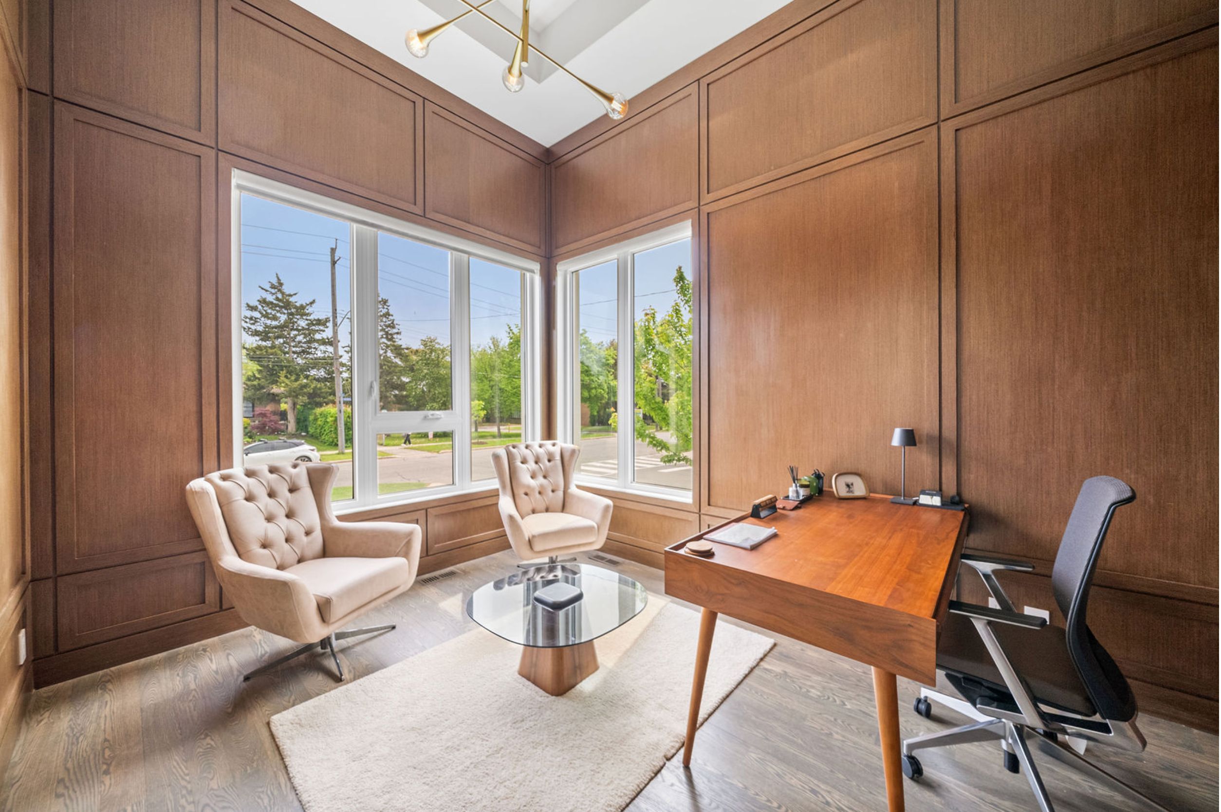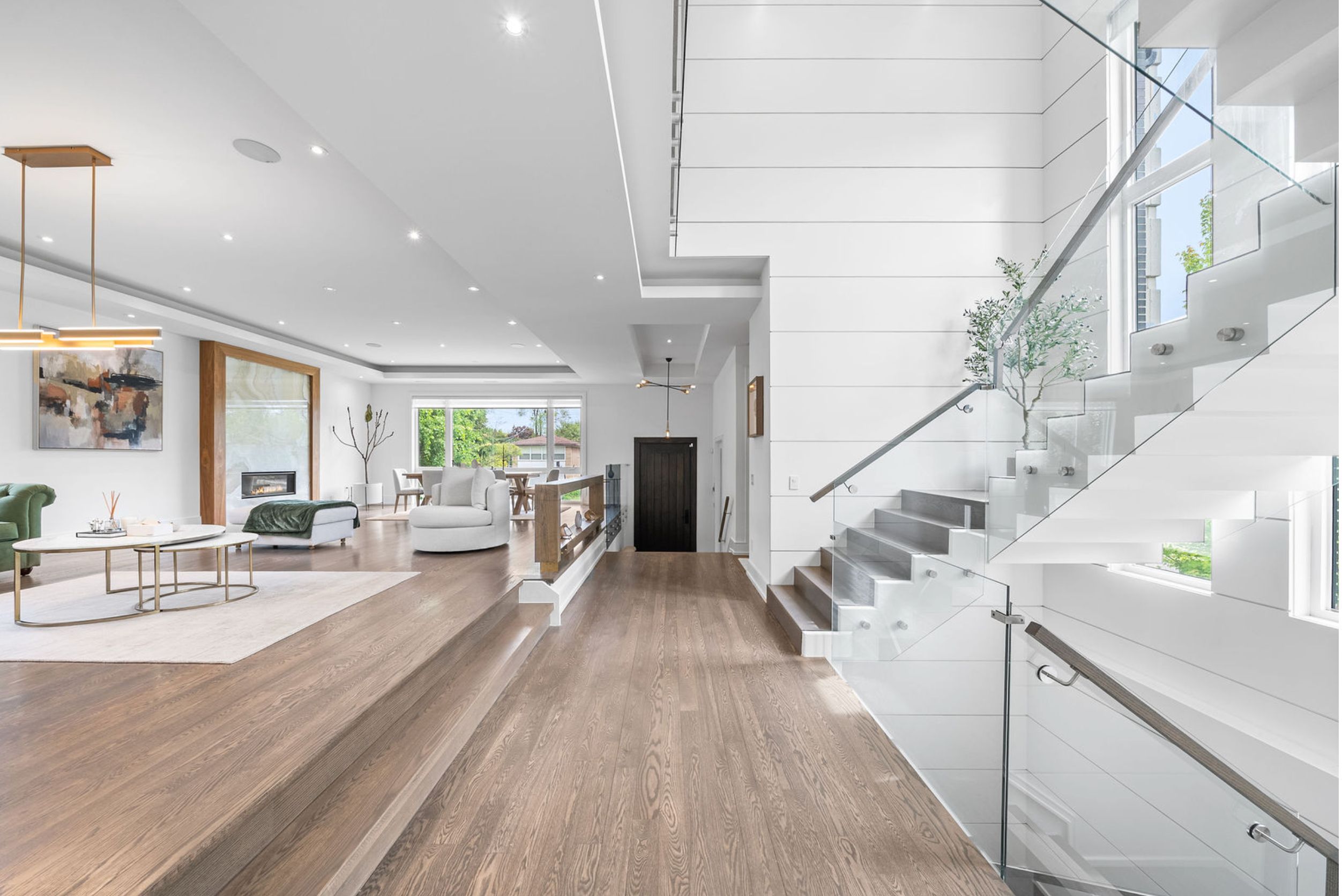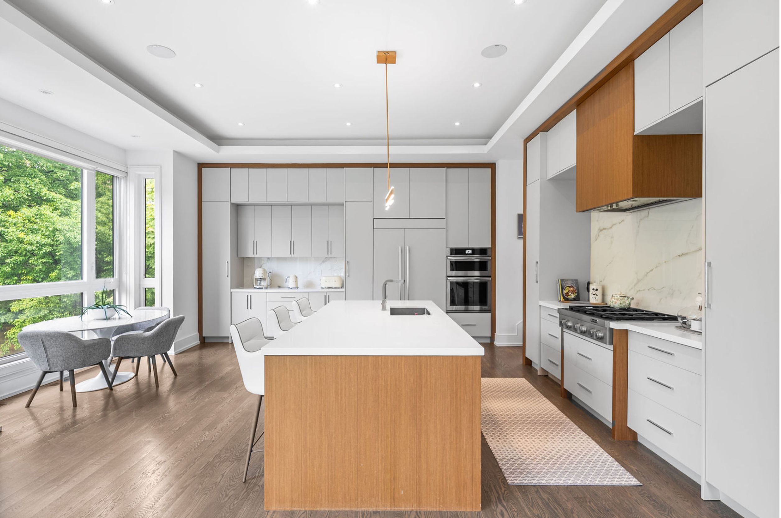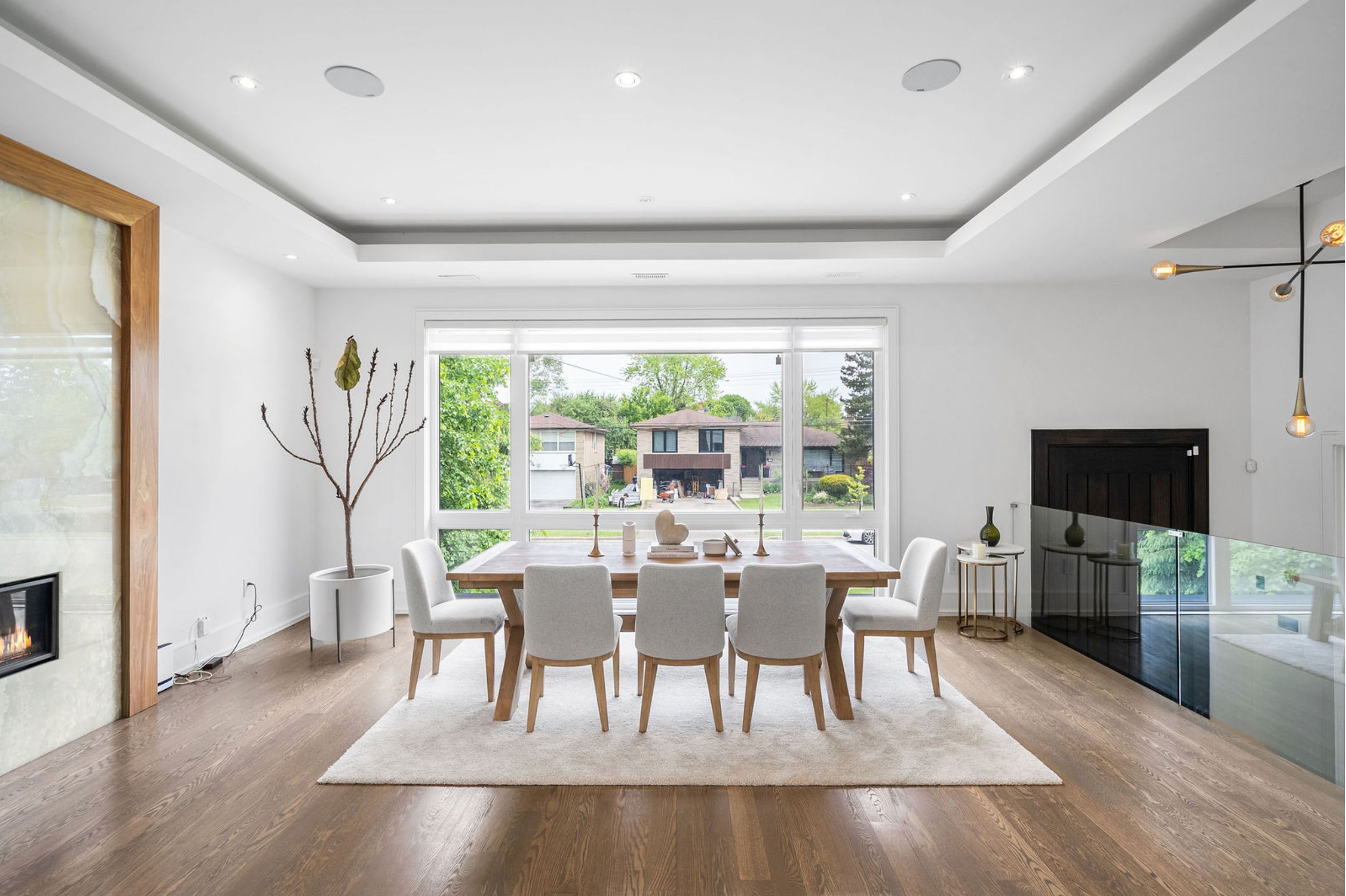 This elegant and sun-filled home sits on a 50-ft frontage lot, showcasing tall ceilings and oversized windows that flood the space with natural light. Featuring 4 spacious bedrooms, each with its own ensuite, plus a nanny's room in the basement, and 6 luxurious bathrooms in total, this home offers the perfect layout for modern family living. A heated foyer with a soaring 14-ft ceiling leads to a beautifully designed office accented with white oak paneling. The open-concept living and dining area features tray ceilings, a striking onyx gas fireplace, and custom wall paneling, creating a refined yet warm atmosphere. The gourmet eat-in kitchen boasts high-end built-in appliances, a large center island, and elegant quartz countertops and backsplash, ideal for both cooking and entertaining. The primary suite is a true retreat, complete with a spa-like 7-piece ensuite and a spacious walk-in closet. The bright, tall basement is a standout feature, with large above-grade windows, an expansive recreation room, second kitchen with onyx slab countertops, a nannysroom with its own 4-piece bath, and a walk-up to the beautifully landscaped backyard. Additional highlights include 2 furnaces, 2 a/c units, and 2 laundry rooms, offering ultimate comfort and convenience. This thoughtfully designed home combines luxury finishes with a functional layout, making it the ideal choice for sophisticated living.