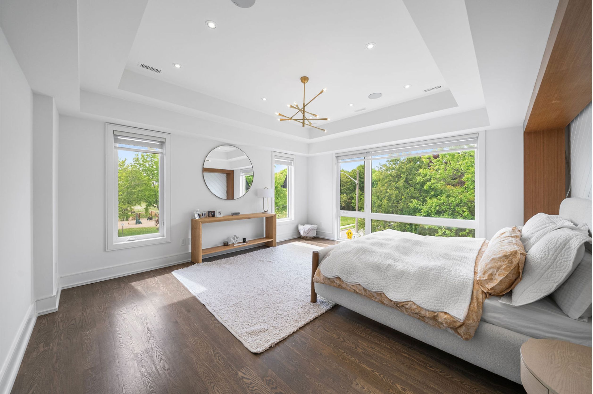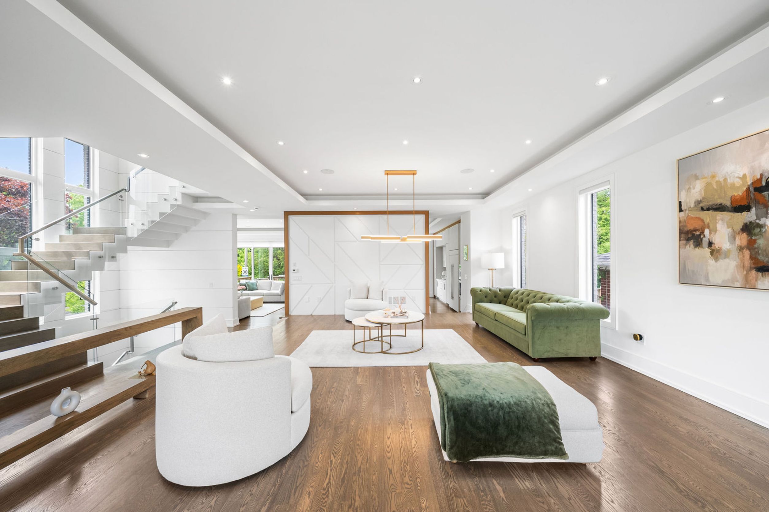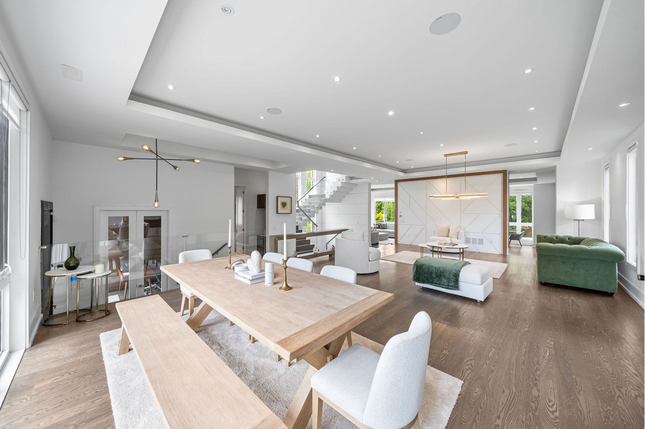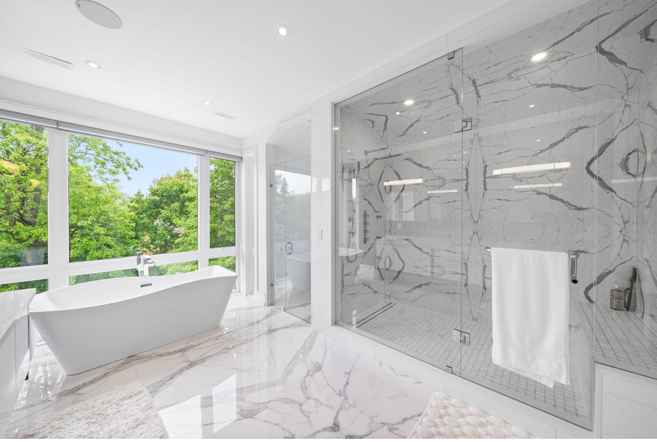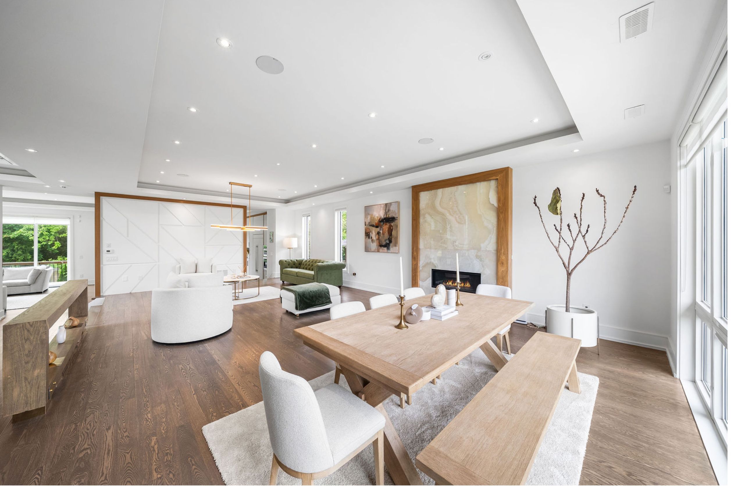 This elegant and sun-filled home sits on a 50-ft frontage lot, showcasing tall ceilings and oversized windows that flood the space with natural light. Featuring 4 spacious bedrooms, each with its own ensuite, plus a nanny's room in the basement, and 6 luxurious bathrooms in total, this home offers the perfect layout for modern family living. A heated foyer with a soaring 14-ft ceiling leads to a beautifully designed office accented with white oak paneling. The open-concept living and dining area features tray ceilings, a striking onyx gas fireplace, and custom wall paneling, creating a refined yet warm atmosphere. The gourmet eat-in kitchen boasts high-end built-in appliances, a large center island, and elegant quartz countertops and backsplash, ideal for both cooking and entertaining. The primary suite is a true retreat, complete with a spa-like 7-piece ensuite and a spacious walk-in closet. The bright, tall basement is a standout feature, with large above-grade windows, an expansive recreation room, second kitchen with onyx slab countertops, a nannysroom with its own 4-piece bath, and a walk-up to the beautifully landscaped backyard. Additional highlights include 2 furnaces, 2 a/c units, and 2 laundry rooms, offering ultimate comfort and convenience. This thoughtfully designed home combines luxury finishes with a functional layout, making it the ideal choice for sophisticated living.