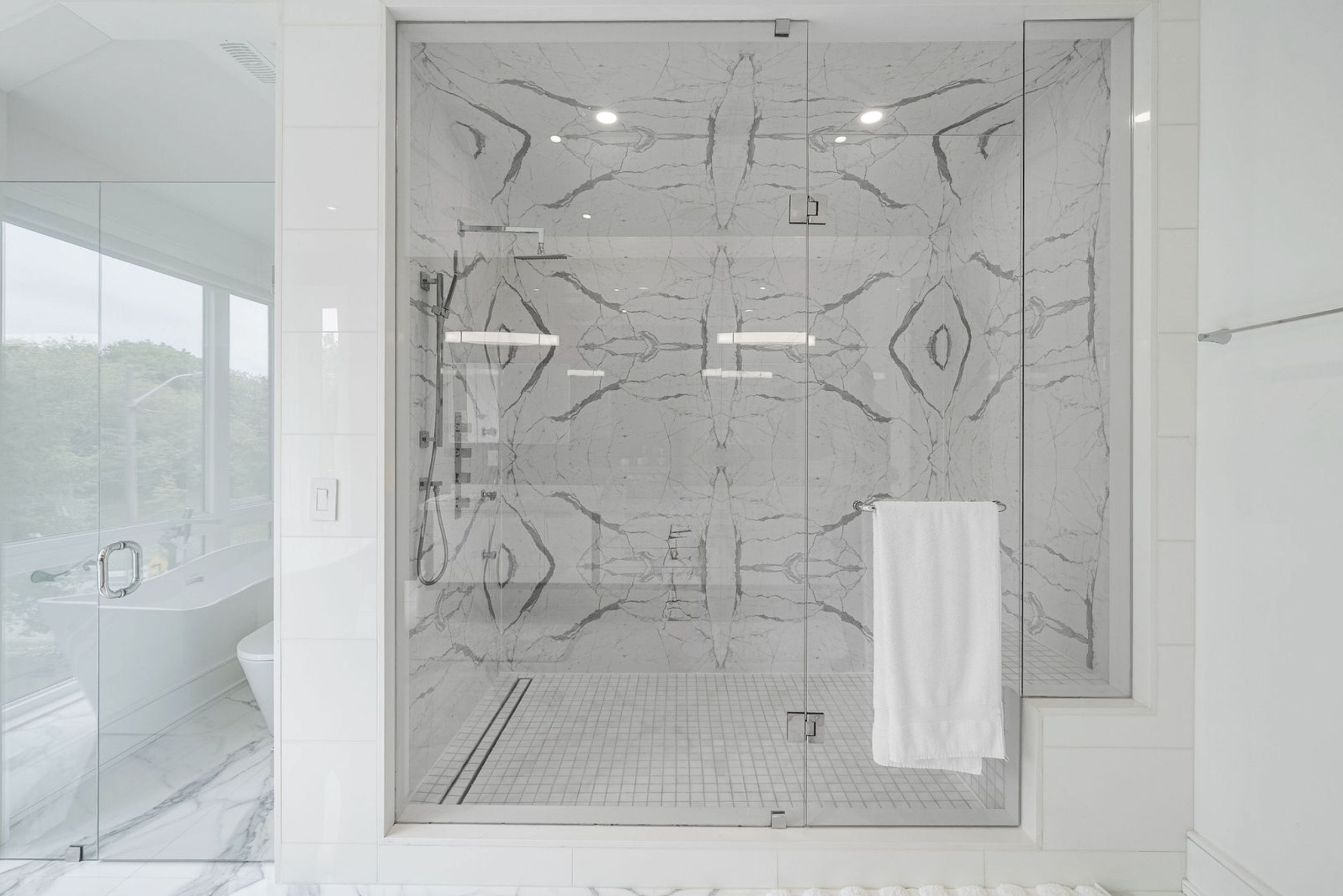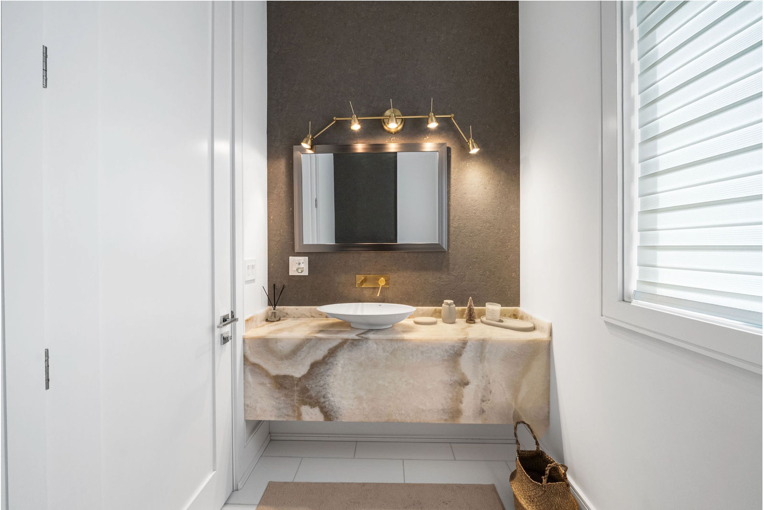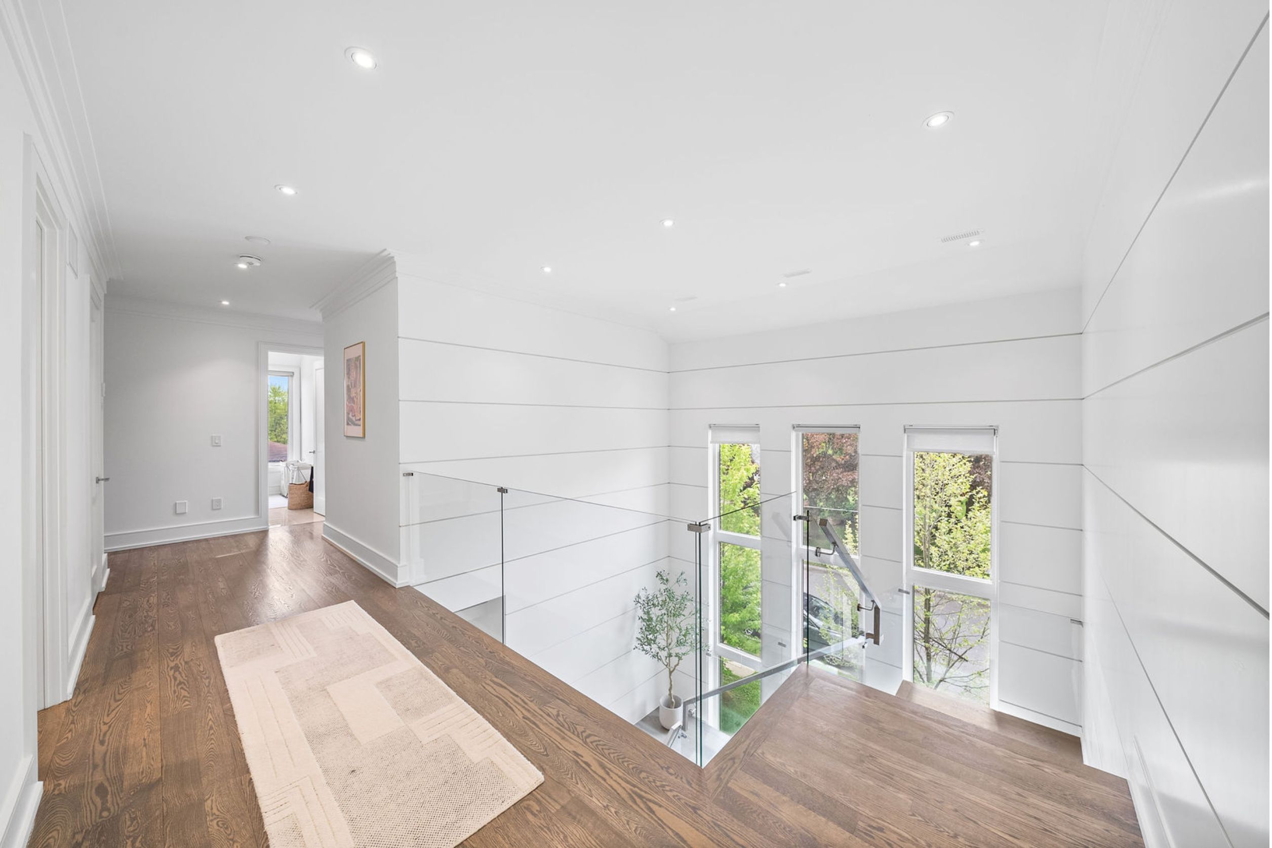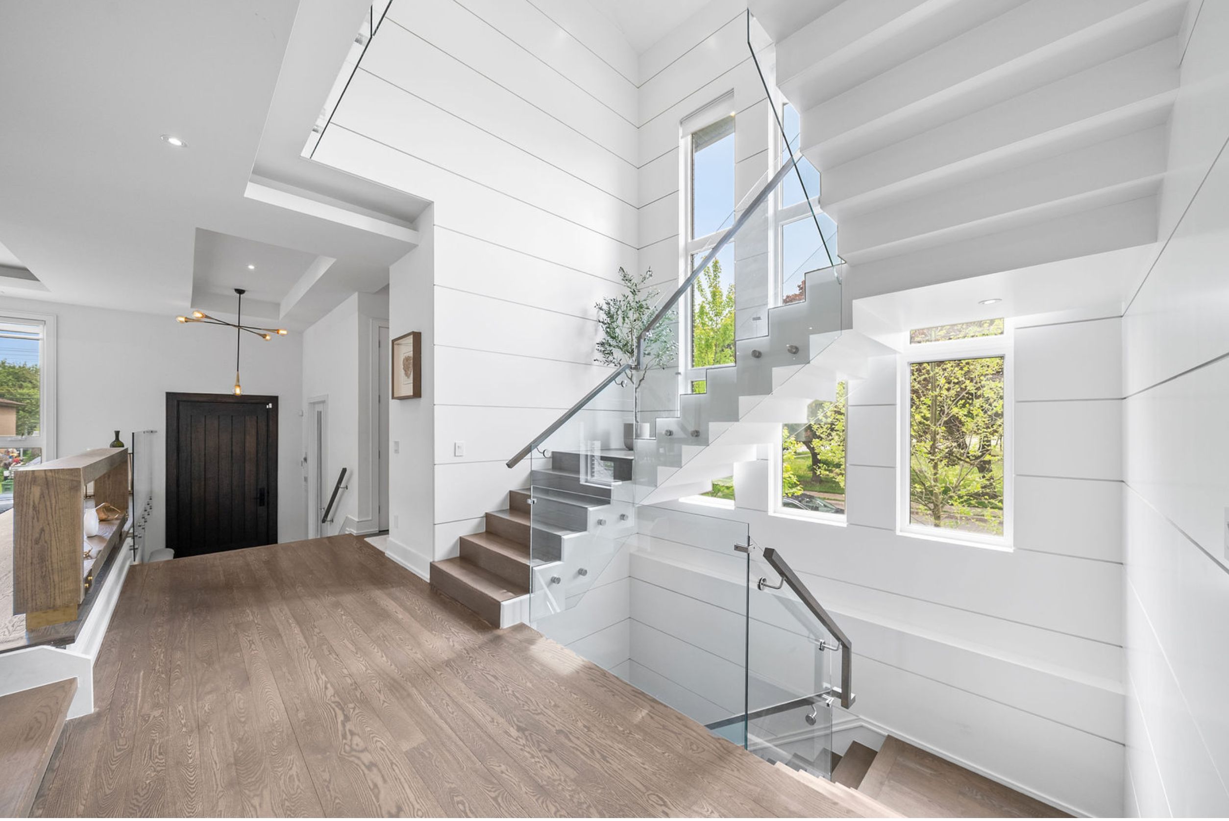 This elegant and sun-filled home sits on a 50-ft frontage lot, showcasing tall ceilings and oversized windows that flood the space with natural light. Featuring 4 spacious bedrooms, each with its own ensuite, plus a nanny's room in the basement, and 6 luxurious bathrooms in total, this home offers the perfect layout for modern family living. A heated foyer with a soaring 14-ft ceiling leads to a beautifully designed office accented with white oak paneling. The open-concept living and dining area features tray ceilings, a striking onyx gas fireplace, and custom wall paneling, creating a refined yet warm atmosphere. The gourmet eat-in kitchen boasts high-end built-in appliances, a large center island, and elegant quartz countertops and backsplash, ideal for both cooking and entertaining. The primary suite is a true retreat, complete with a spa-like 7-piece ensuite and a spacious walk-in closet. The bright, tall basement is a standout feature, with large above-grade windows, an expansive recreation room, second kitchen with onyx slab countertops, a nannysroom with its own 4-piece bath, and a walk-up to the beautifully landscaped backyard. Additional highlights include 2 furnaces, 2 a/c units, and 2 laundry rooms, offering ultimate comfort and convenience. This thoughtfully designed home combines luxury finishes with a functional layout, making it the ideal choice for sophisticated living.