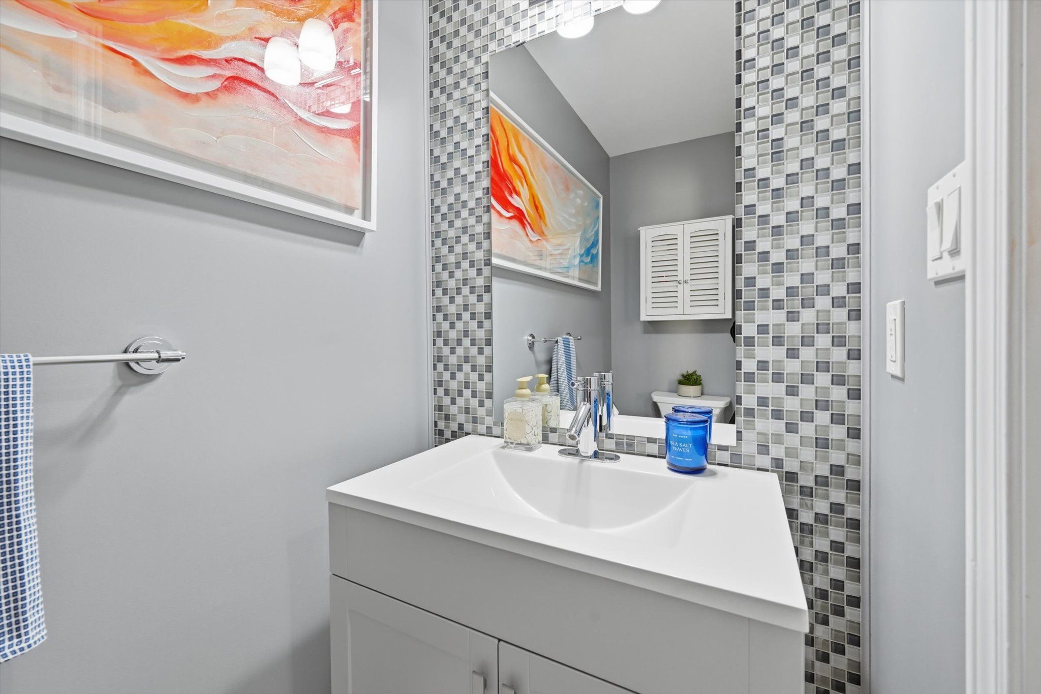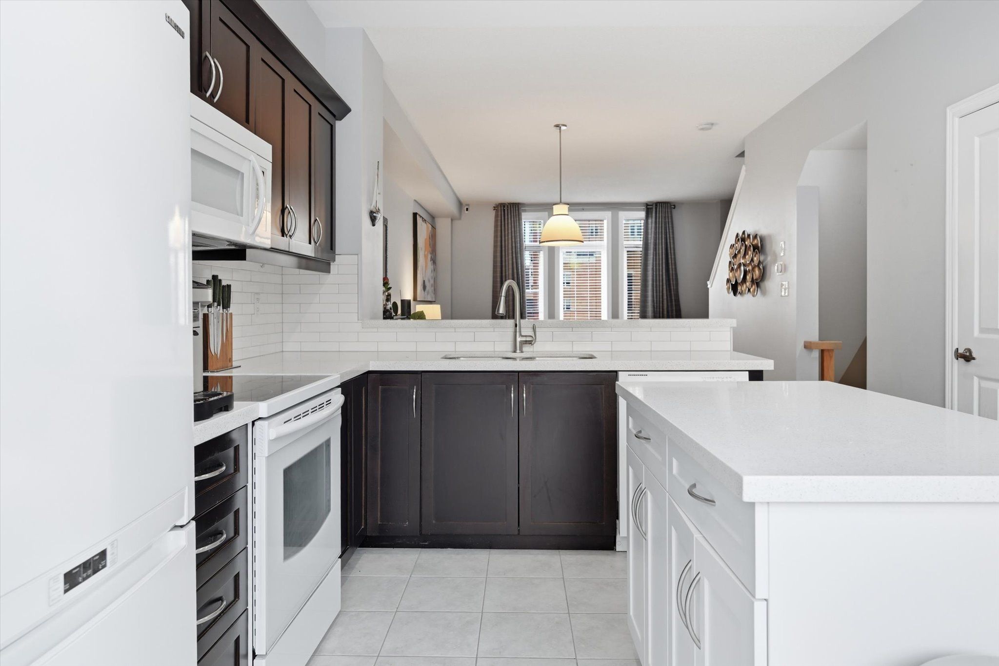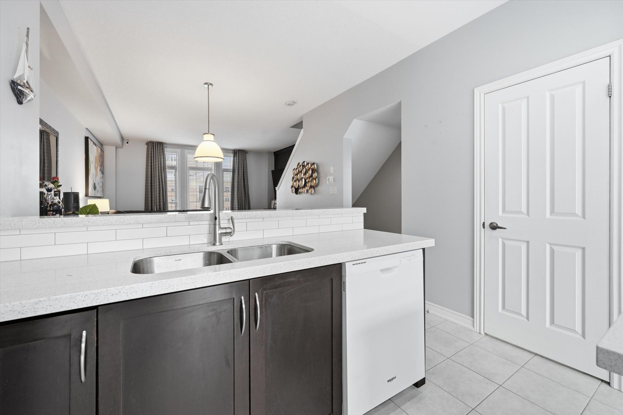 • Stylish kitchen with quartz counters and matching backsplash.