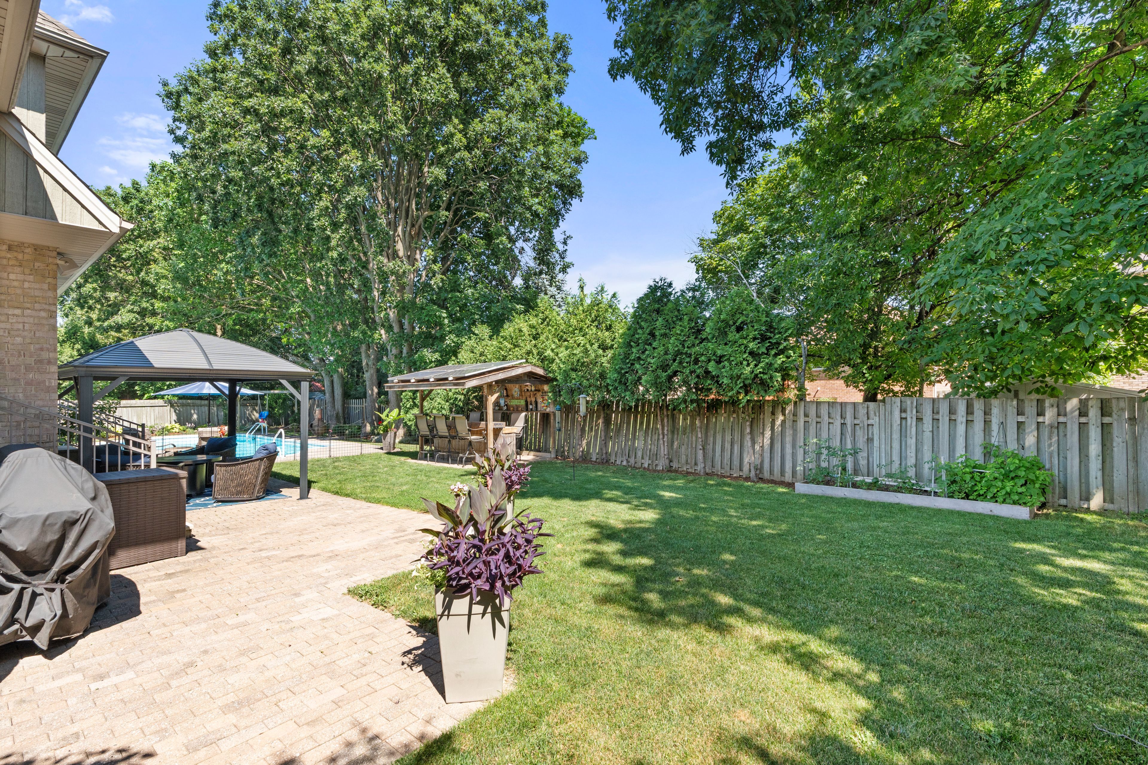 • Large backyard with a saltwater pool, Tiki bar, and gazebo.