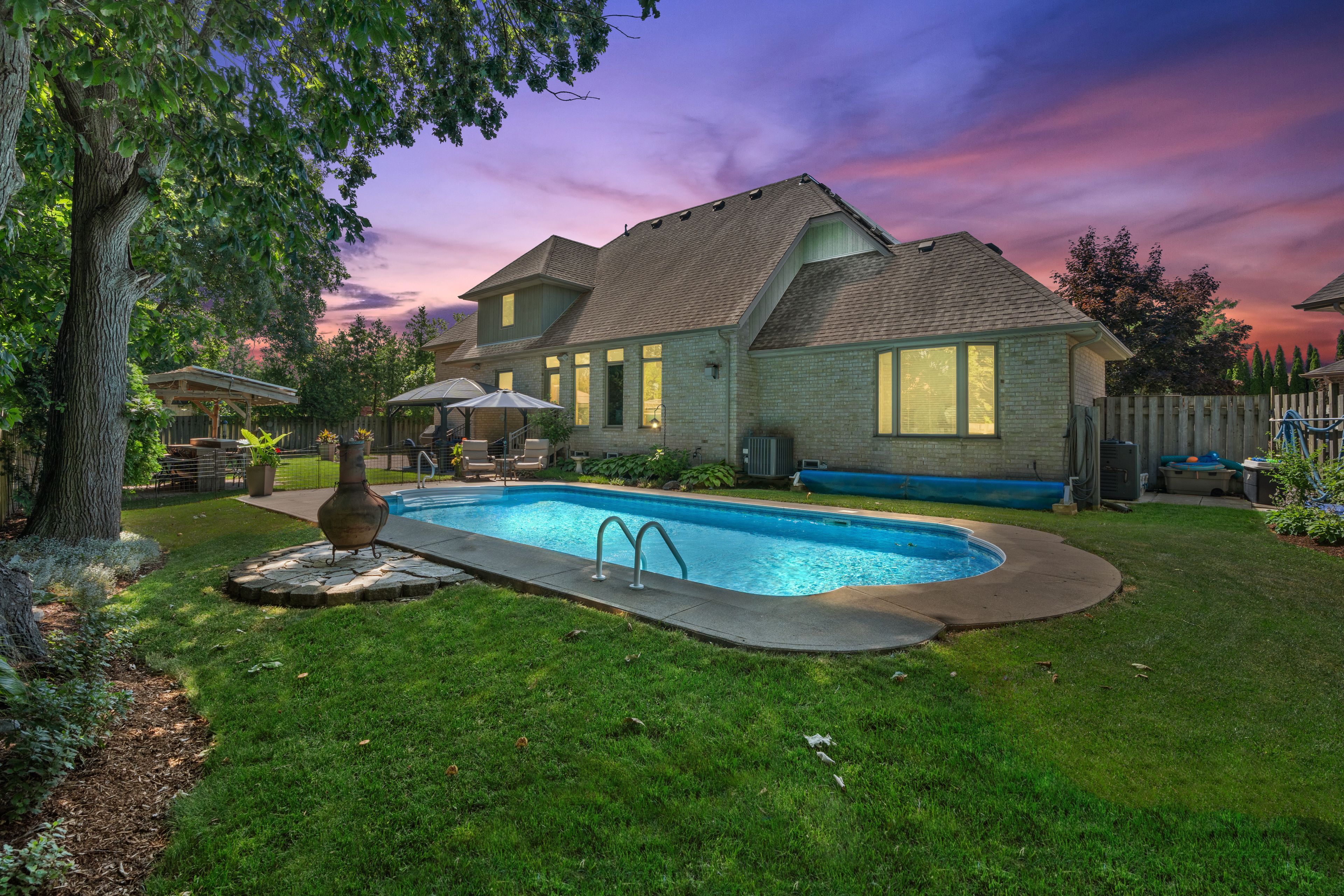 Welcome to this show stopping, one of a kind, custom designed and built, home situated at the end of a quiet cul-de-sac in a highly desirable area of south windsor. This home has 4 bedrooms, and 3 bathrooms. Home is in a great location, close to schools, parks and shopping. The extra wide rear lot supports mature trees, an in- ground salt water sports pool, a tiki bar, a gazebo and a grass area for playing. This home features a main floor primary bedroom with ensuite bathroom and walk in closet. An office and laundry room are also on the main floor. High vaulted ceilings on the main floor great room and dining area give this home a very spacious feel. Cathedral ceiling in the main floor living room and ample large windows bring in loads of natural light which adds to this spacious feel. The large 2 car garage has two entrances into the home, one into the mud room, the other leading to the basement. The second floor includes 3 large bedrooms and a beautiful 4 piece bathroom. The large basement area is partially finished with a recreation room, a games area and a personal gym. The unfinished area includes a large workshop and storage areas. This home features a solar panel system; details available upon request.