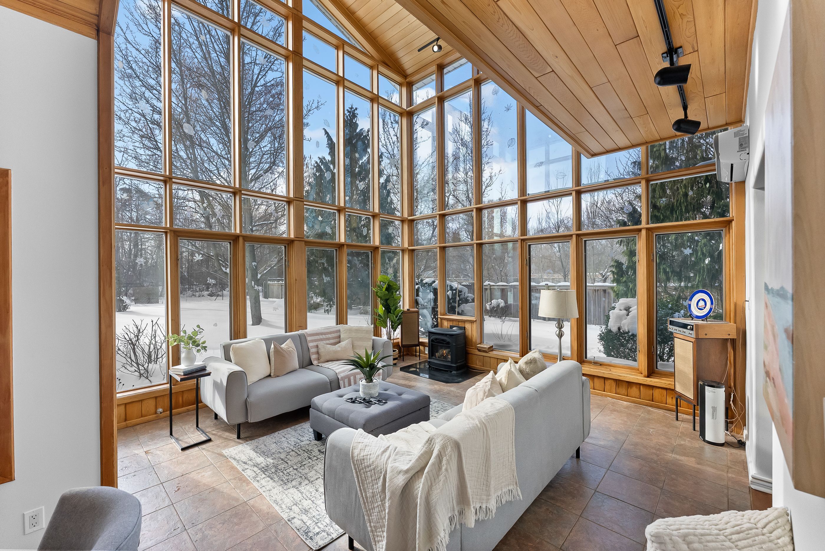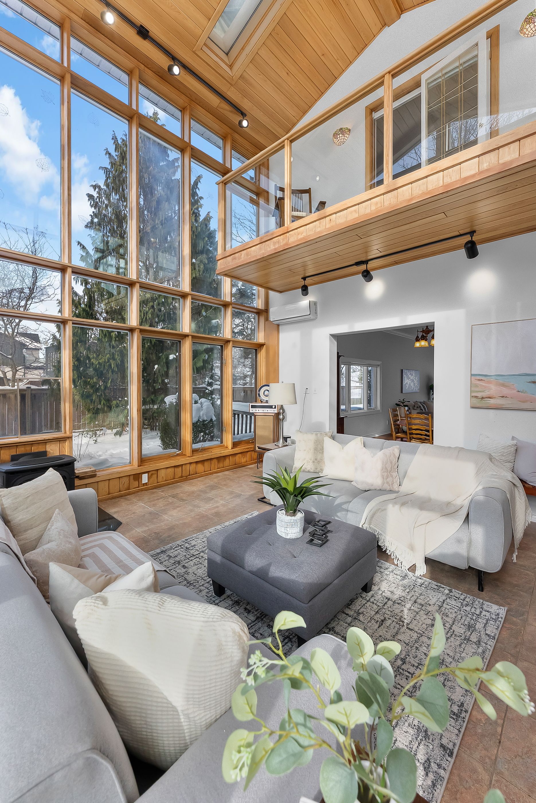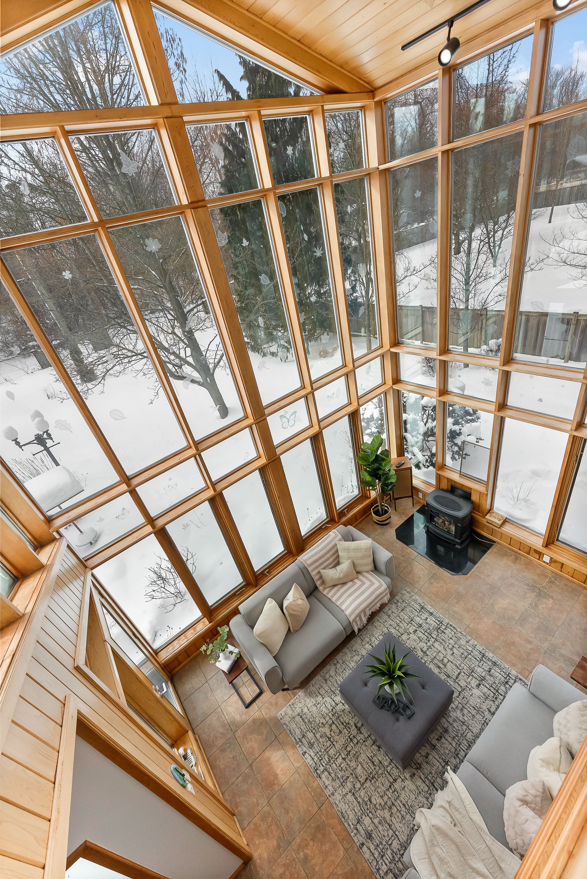 Welcome to 4169 niagara river parkway in fort erie, a custom-built river-view home set on an expansive 190 ft x 100 ft lot along one of the most scenic stretches of the niagara river. This approximately 3,800 sq. Ft. Two-storey residence offers space and serenity with no neighbours directly in front or behind. Inside, soaring ceilings ranging from 10-14 feet and oversized windows flood the home with natural light, connecting indoor living to the surrounding gardens, trees, and river views. Recently refreshed neutral tones, warm hardwood floors, and heated floors in select areas enhance the calm, airy feel throughout the main living spaces. The kitchen is exceptionally well maintained, featuring stainless steel appliances, a gas stove, and a breakfast nook overlooking the backyard. A front study offers flexible office or guest space, while automatic blinds add modern convenience. The year-round sunroom features floor-to-ceiling windows and a gas fireplace, complemented by an upper-level juliet balcony. Upstairs, the primary suite includes a spa-inspired ensuite with jet tub, walk-in shower, motion-sensor japanese-style toilet, his-and-hers closets, and a large walk-in storage room. Additional bedrooms are bright with mini-split heating and cooling. The oversized double garage and workshop feature ceiling-mounted heating, extensive electrical, a drive-through design with full doors at both the front and rear, and an electronic lift providing access to the second level. Outdoors, the private, fully treed backyard offers open lawn space, a gas bbq hookup, a baby barn/shed with electrical service, and gated access to the hydro corridor. Both the front and backyard have been professionally landscaped with fully manicured, low-maintenance gardens and hundreds of black-eyed susans adding seasonal colour. Located along the niagara river parkway, this home offers scenic walking and cycling routes, proximity to boating, and a rare combination of privacy, scale, and lifestyle.