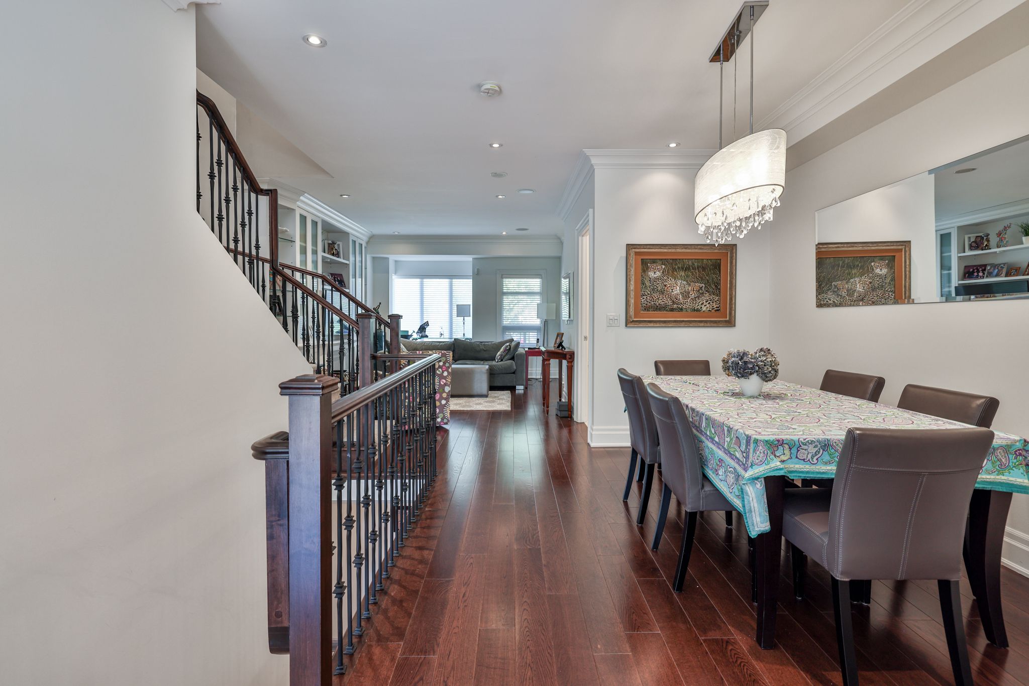 • Spacious interior with hardwood floors, crown mouldings, and skylights for natural light.