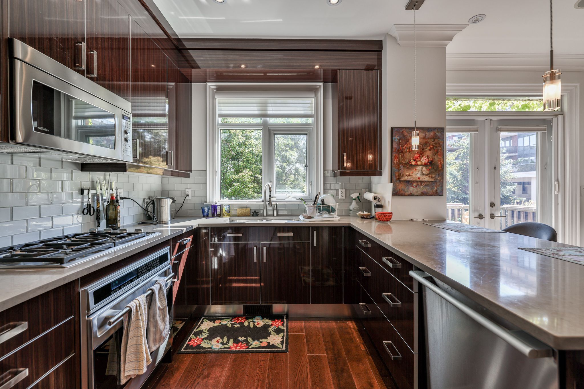 • Custom kitchen with high-end appliances and seamless family room access.