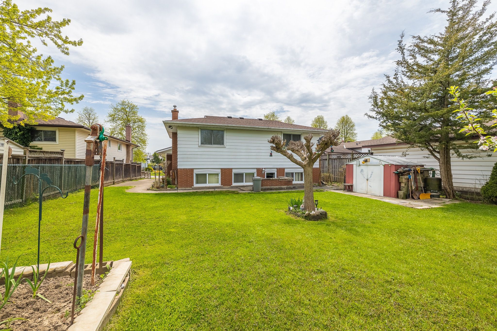 Spacious, meticulously clean 3 bedroom brick/metal siding back-spit with a single attached garage and large rear yard equipped with a vegetable garden. Layout consists of 3 upper level bedrooms, 4 pc bath and extra closets/storage. Main floor features an eat-in kitchen, dining room with built-in cabinets, living room, and a sliding door to a covered concrete patio (9'8" x 13'6") with an entrance to the garage. Lower level includes a second open concept kitchen, rec room with brick gas natural fireplace and 3 pc bath. The lower level has a separate walkout to the beautiful backyard with plenty of green space, huge garden and shed. Includes an extra 560sq. Ft of living space. Basement laundry, workshop storage and cold storage. Shingles replaced in 2019, hot water heater owned, 100 amp electrical. Located in a great neighbourhood! Close to schools, shopping, restaurants, access to qew and much more! Walking distance to shopping, bus stops, etc.. This home is full of character that you don't want to miss!