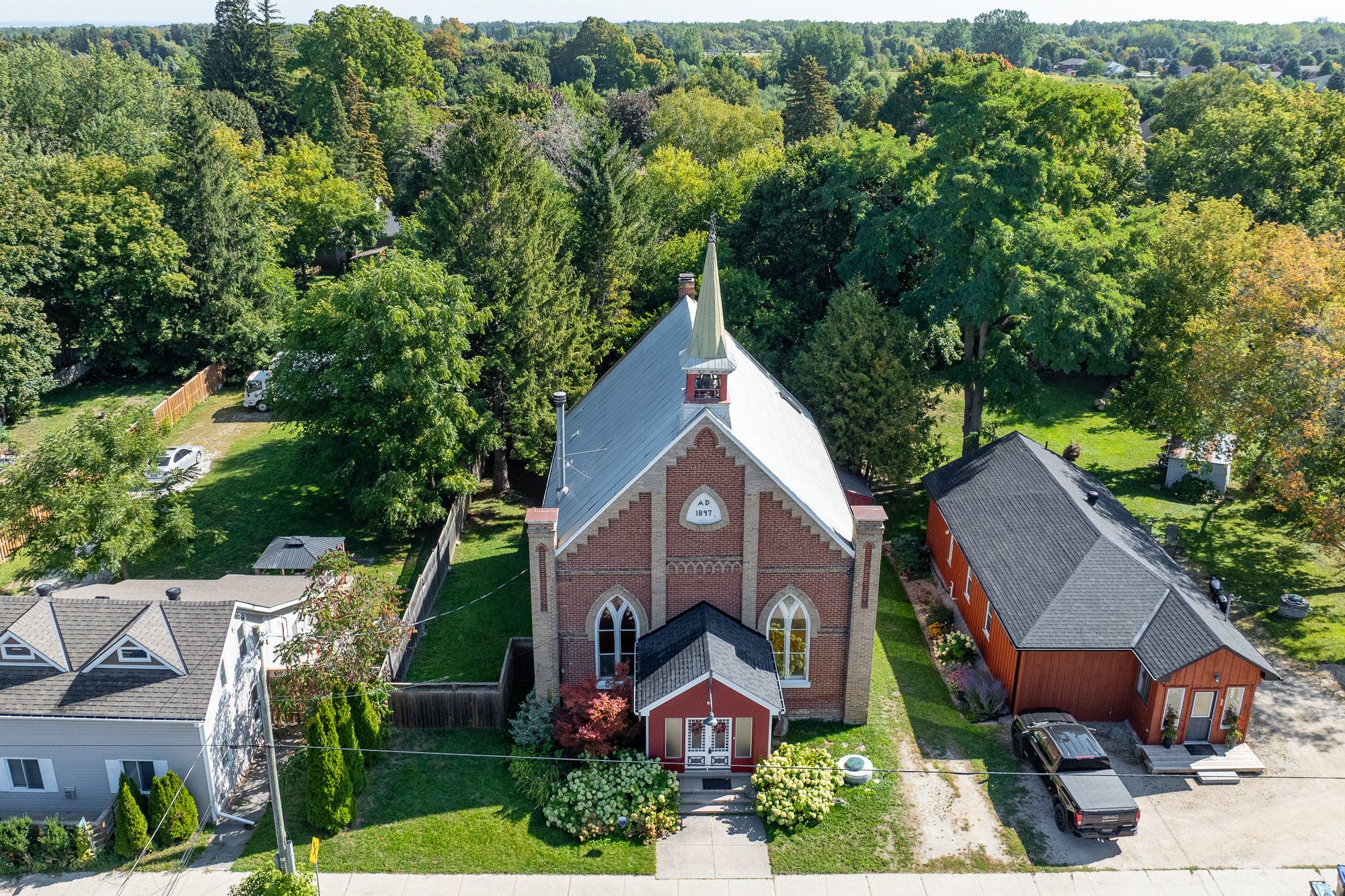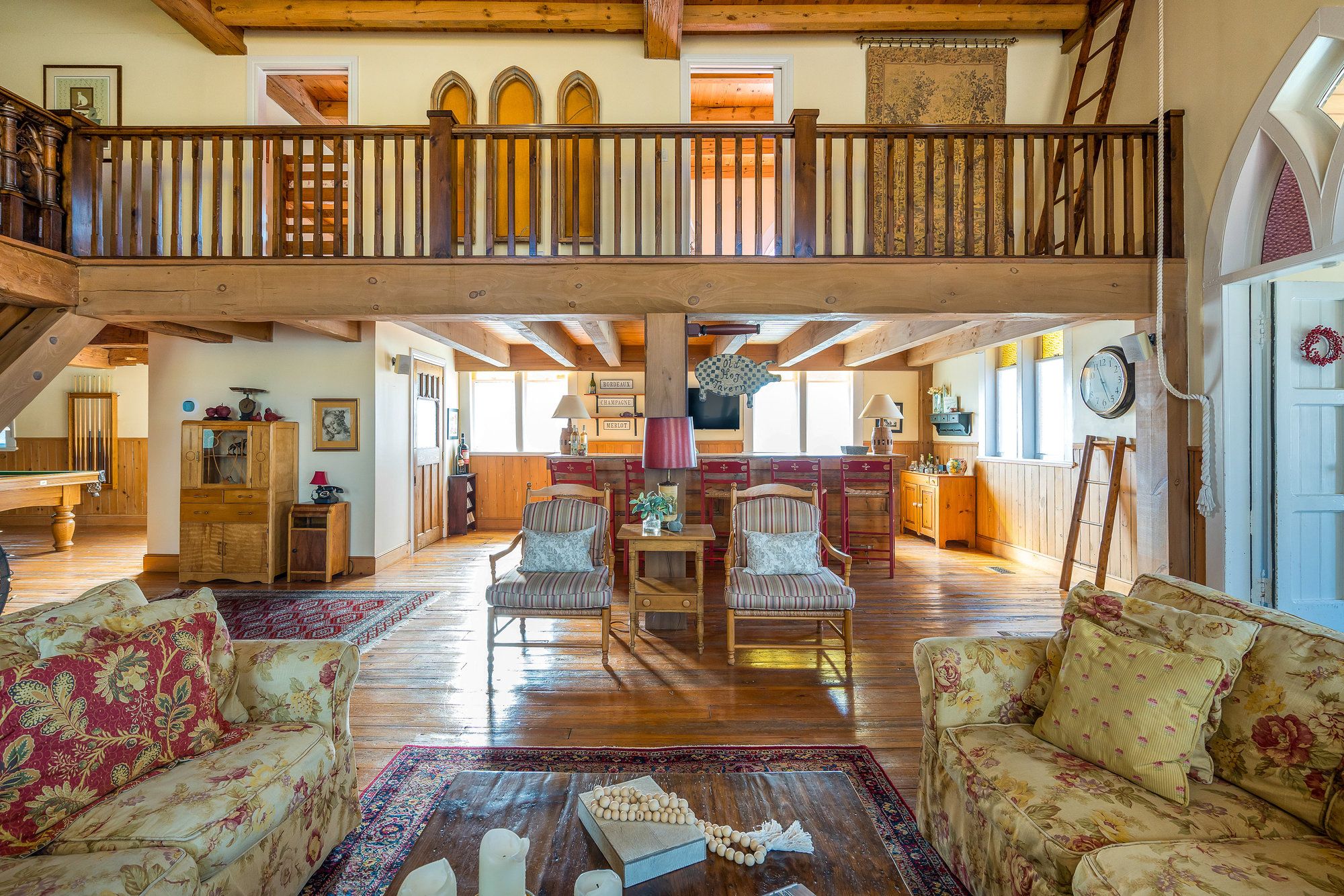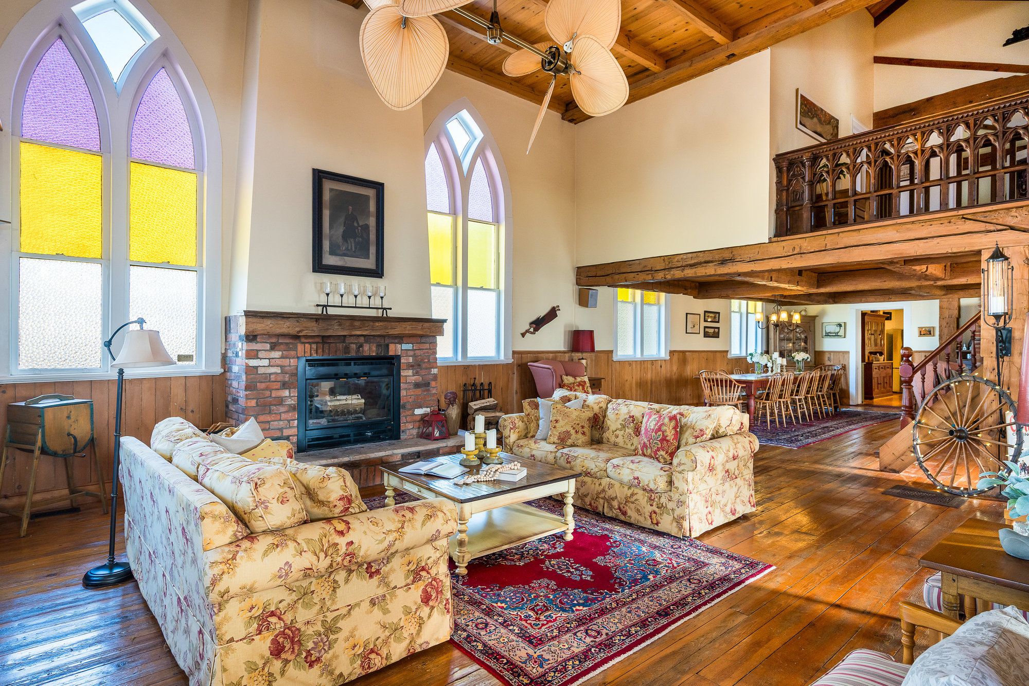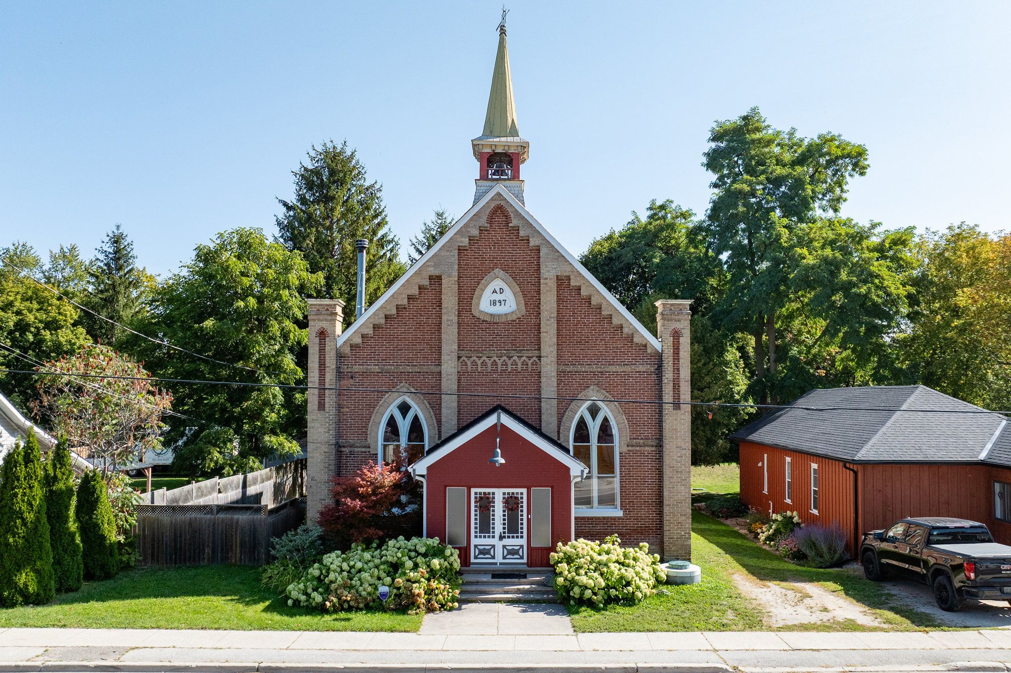 When you step inside this unique, renovated 1897 church, you can't help but imagine the fabulous holidays your family and friends would enjoy here. On the main street of the charming village of nottawa, this is a home meant for gathering. This rare opportunity is absolutely full of thoughtful touches and decor lavished on it by its current owners, and all those touches are included in the sale. Furnishings, linens, rugs, art, lamps, antiques, even the dishes, all come with the house so moving in will be easy. Your family will enjoy the restful and restorative atmosphere of the main floor with the soft light of stained glass. The sprawling living space under post and beam cathedral ceilings has a chalet like feel. It features a primary seating area in front of a wood burning fireplace with a wonderful long and welcoming bar for entertaining. The bar itself was recovered from an old general store. An adjoining space houses another seating area in front of a gas fireplace and a large billiards table. The dining table seats 14 so no card tables will be necessary. Each space is wide open yet beautifully defined with a combination of historic details and new improvements. You will have room for all your guests in the five upstairs bedrooms, all stylishly decorated and all enjoying the comforting glow of stained glass windows. The main floor den has a pull out sofa bed and an ensuite bathroom for additional sleeping quarters. It is a home to wander in, explore, and bask in its warmth and coziness. Outside, a large backyard deck allows space for an oversized bbq and an enormous hot tub, all under a beautiful canopy of mature trees. Multiple sheds for storage and potting make maintenance easy -- and even the garden equipment is included.