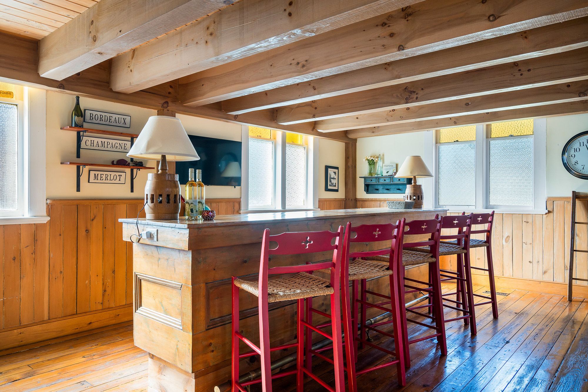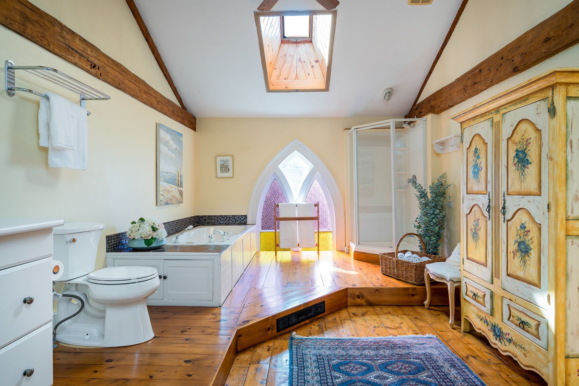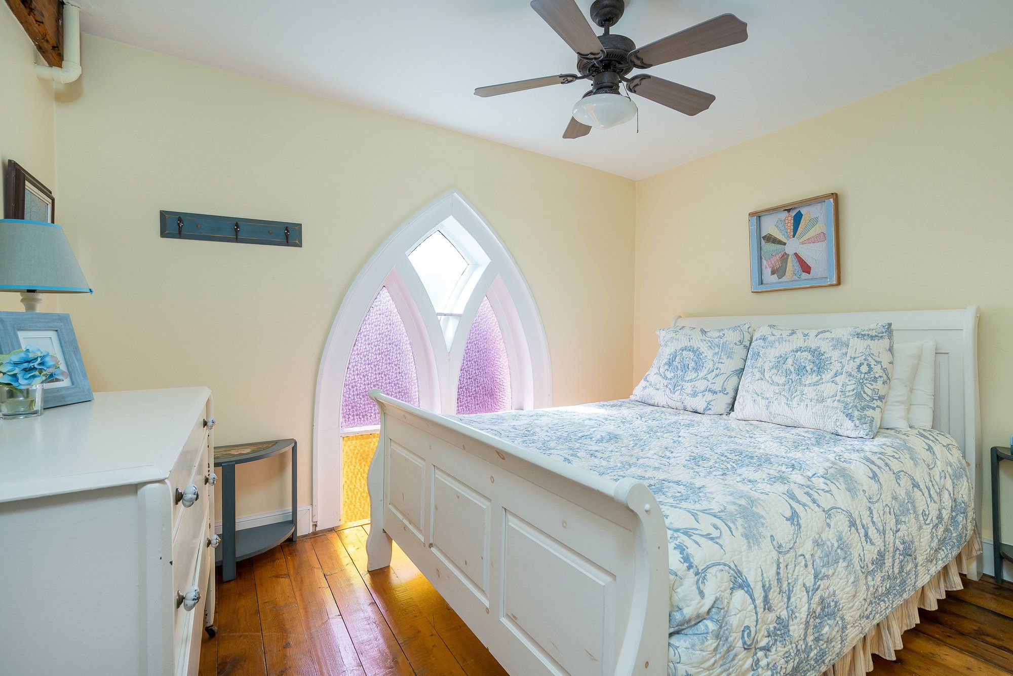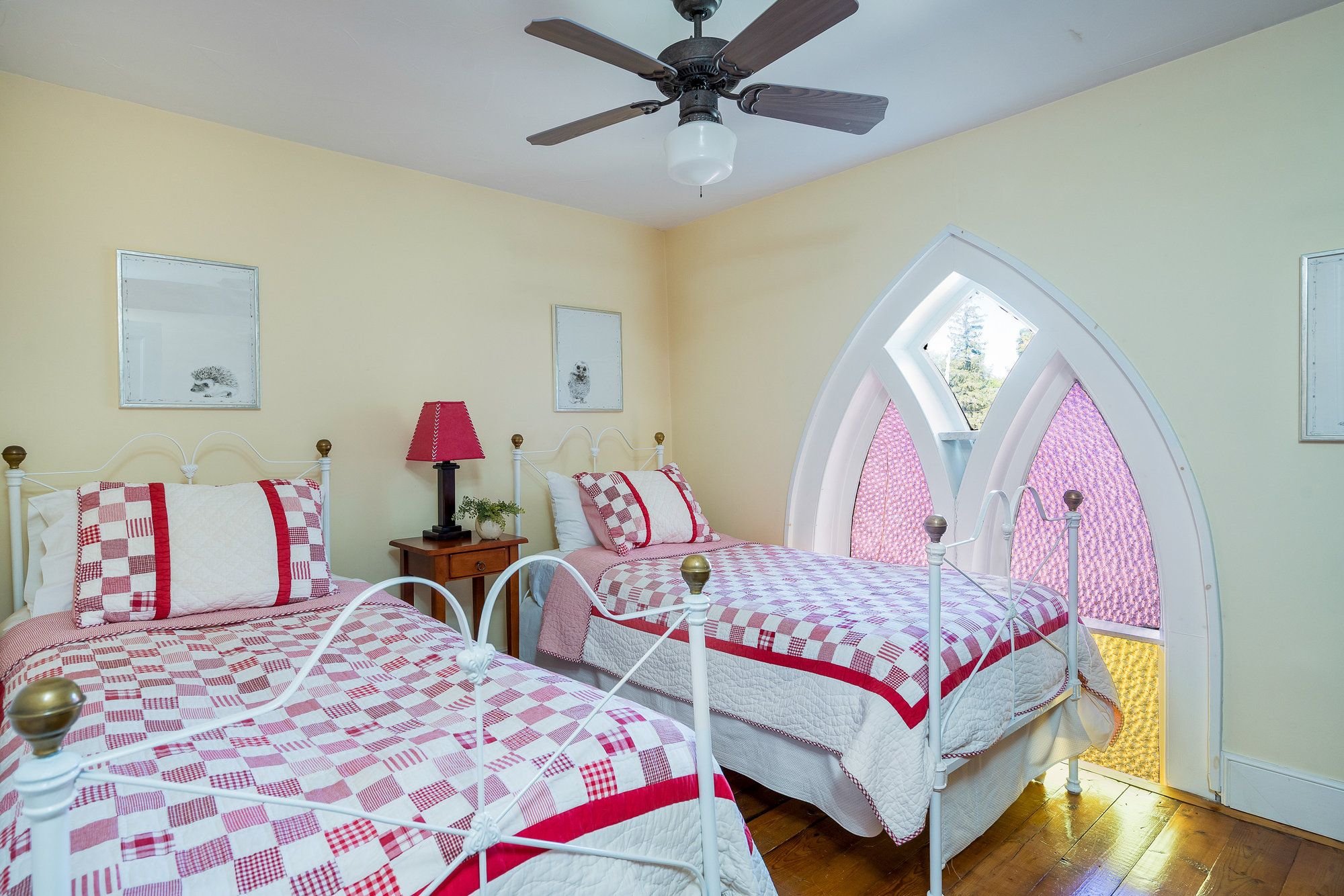 When you step inside this unique, renovated 1897 church, you can't help but imagine the fabulous holidays your family and friends would enjoy here. On the main street of the charming village of nottawa, this is a home meant for gathering. This rare opportunity is absolutely full of thoughtful touches and decor lavished on it by its current owners, and all those touches are included in the sale. Furnishings, linens, rugs, art, lamps, antiques, even the dishes, all come with the house so moving in will be easy. Your family will enjoy the restful and restorative atmosphere of the main floor with the soft light of stained glass. The sprawling living space under post and beam cathedral ceilings has a chalet like feel. It features a primary seating area in front of a wood burning fireplace with a wonderful long and welcoming bar for entertaining. The bar itself was recovered from an old general store. An adjoining space houses another seating area in front of a gas fireplace and a large billiards table. The dining table seats 14 so no card tables will be necessary. Each space is wide open yet beautifully defined with a combination of historic details and new improvements. You will have room for all your guests in the five upstairs bedrooms, all stylishly decorated and all enjoying the comforting glow of stained glass windows. The main floor den has a pull out sofa bed and an ensuite bathroom for additional sleeping quarters. It is a home to wander in, explore, and bask in its warmth and coziness. Outside, a large backyard deck allows space for an oversized bbq and an enormous hot tub, all under a beautiful canopy of mature trees. Multiple sheds for storage and potting make maintenance easy -- and even the garden equipment is included.