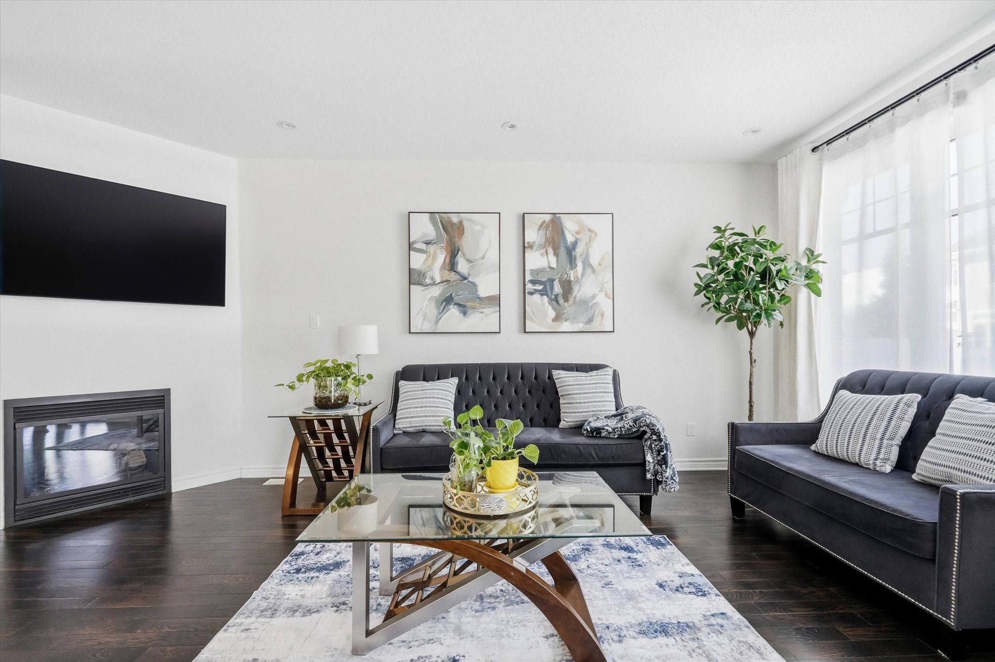 • Sun-filled living room with a cozy gas fireplace and large window.