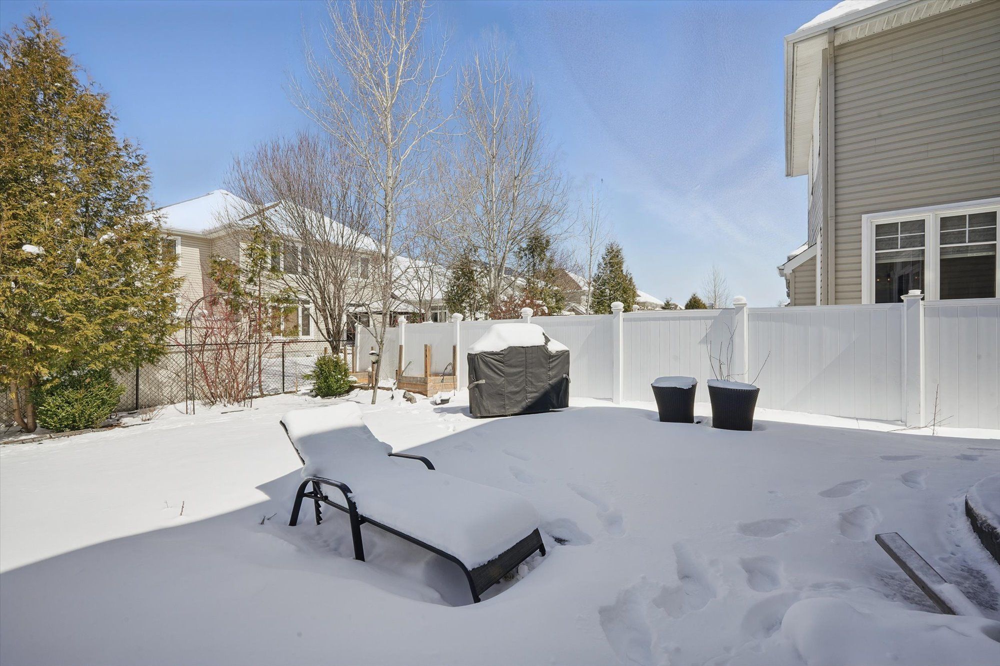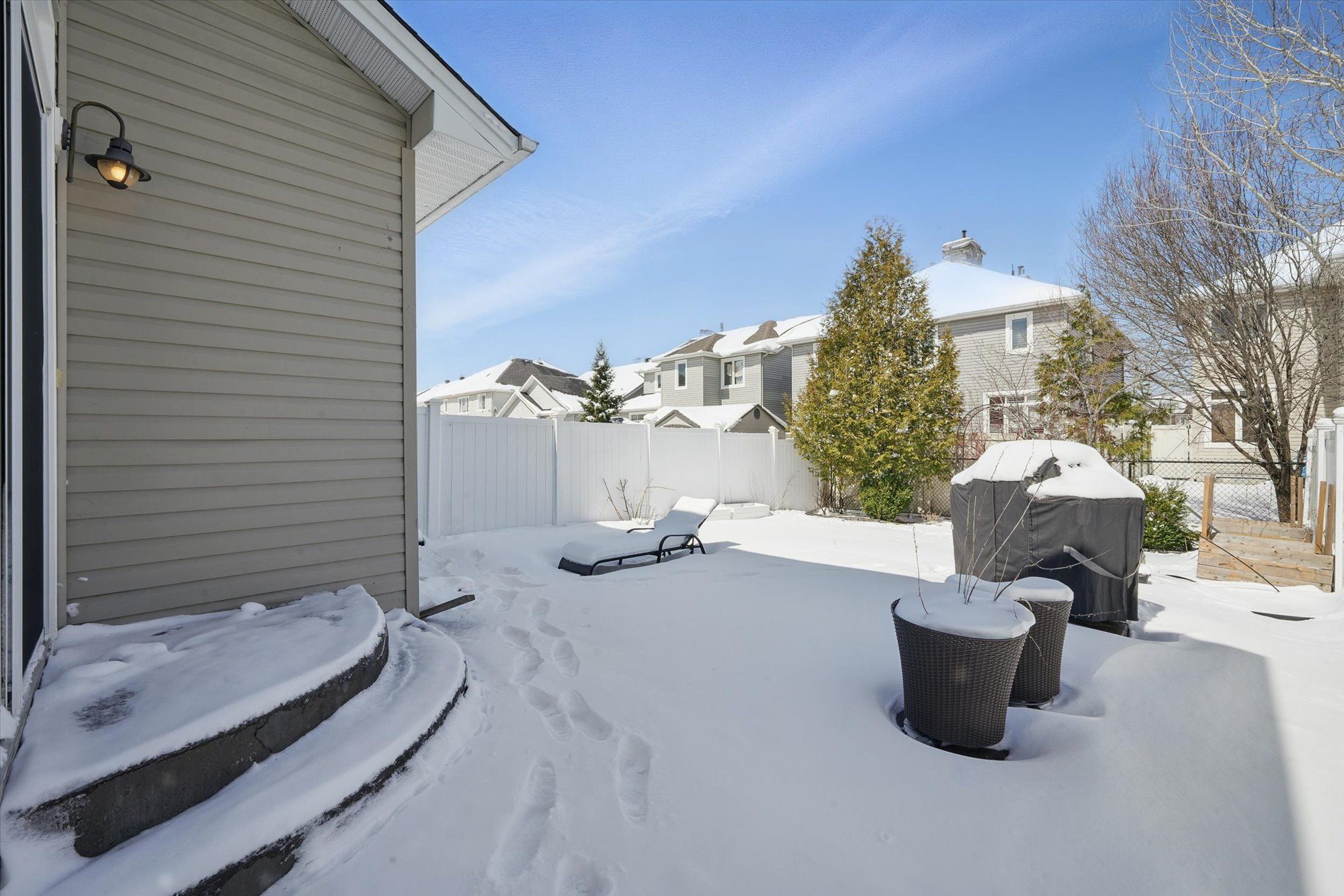 • Fully fenced backyard with concrete area and green space.