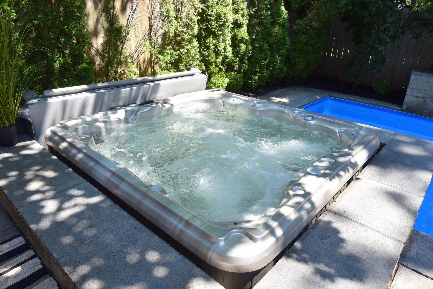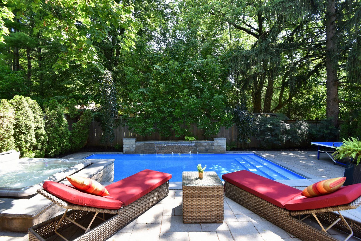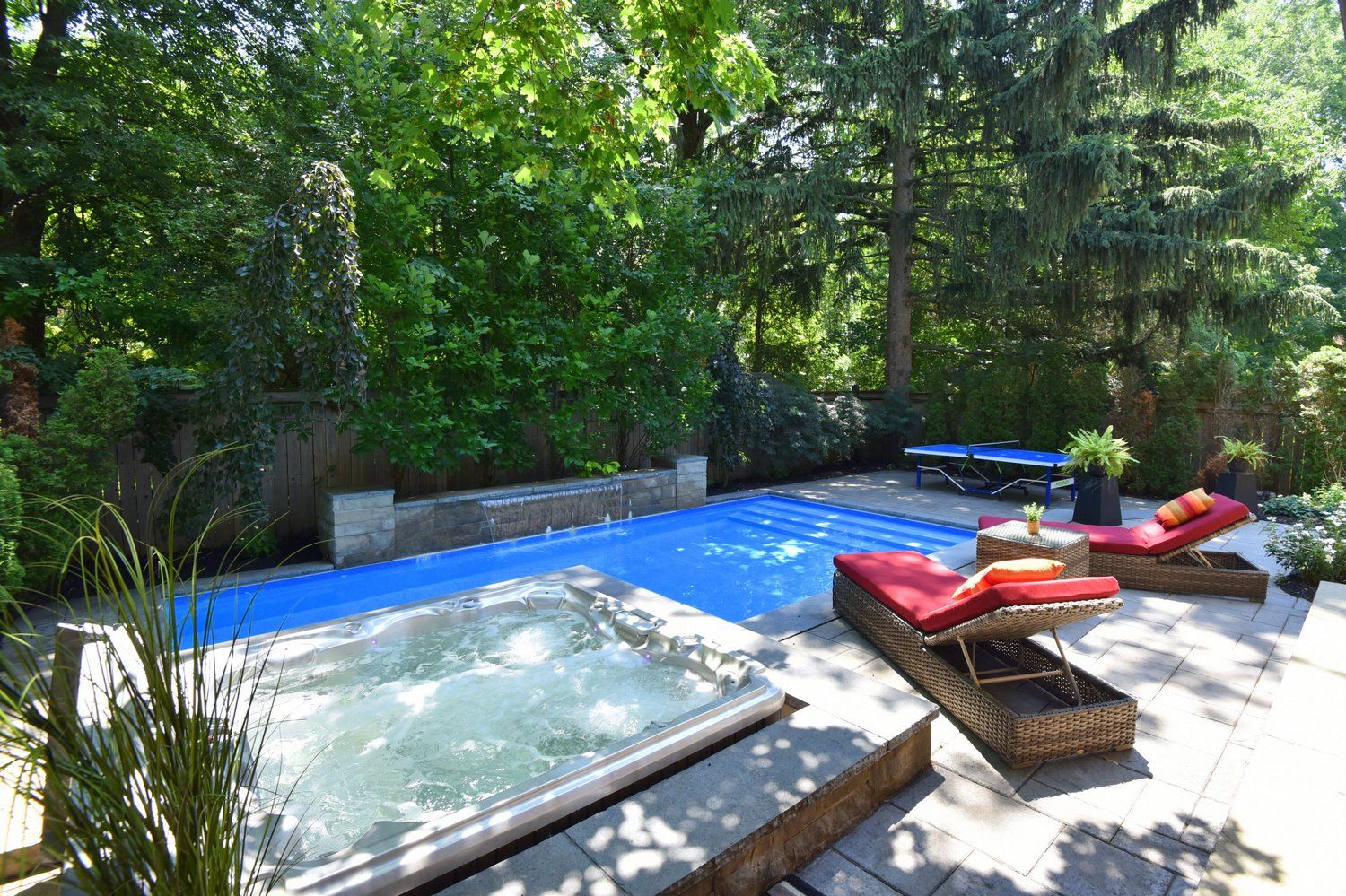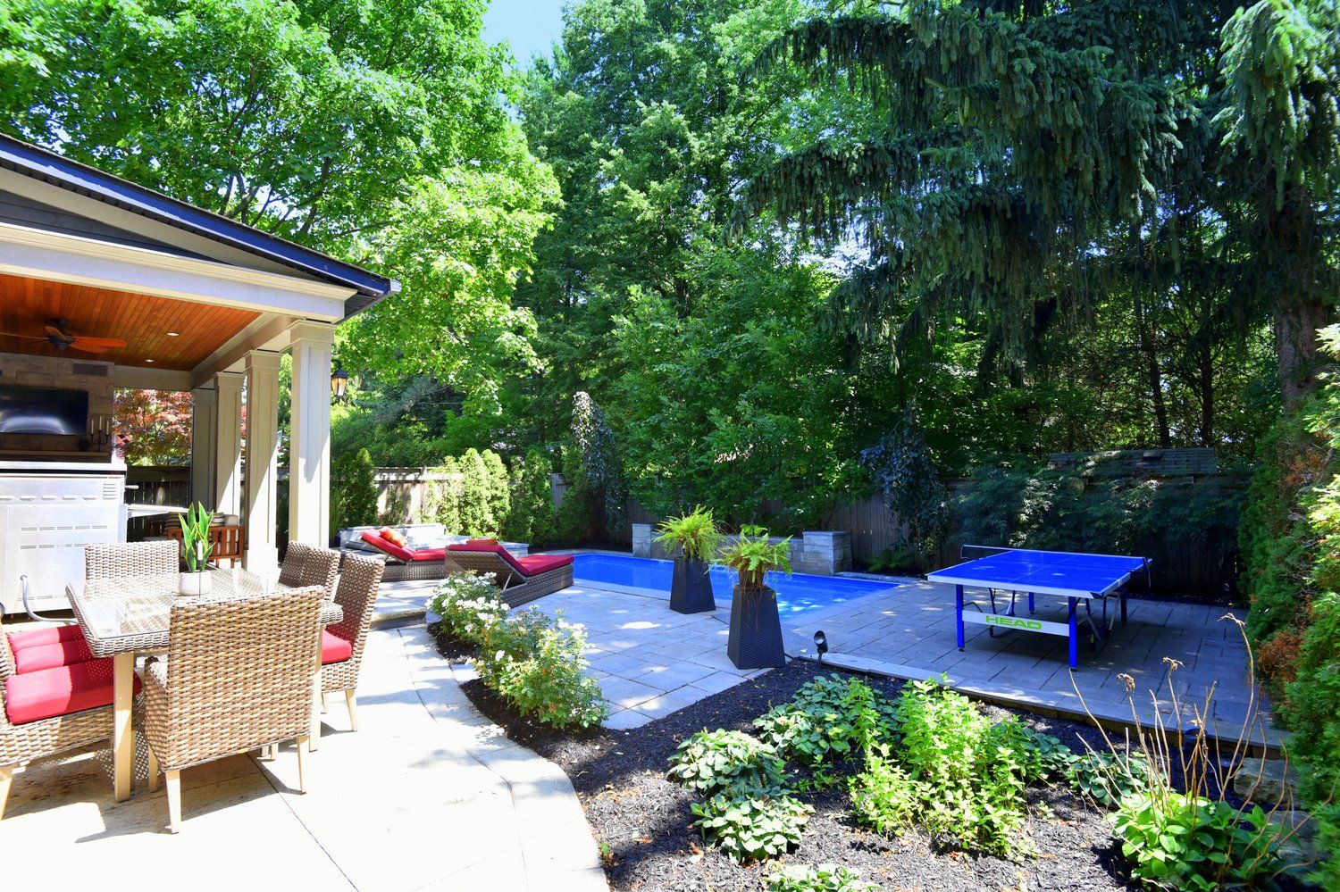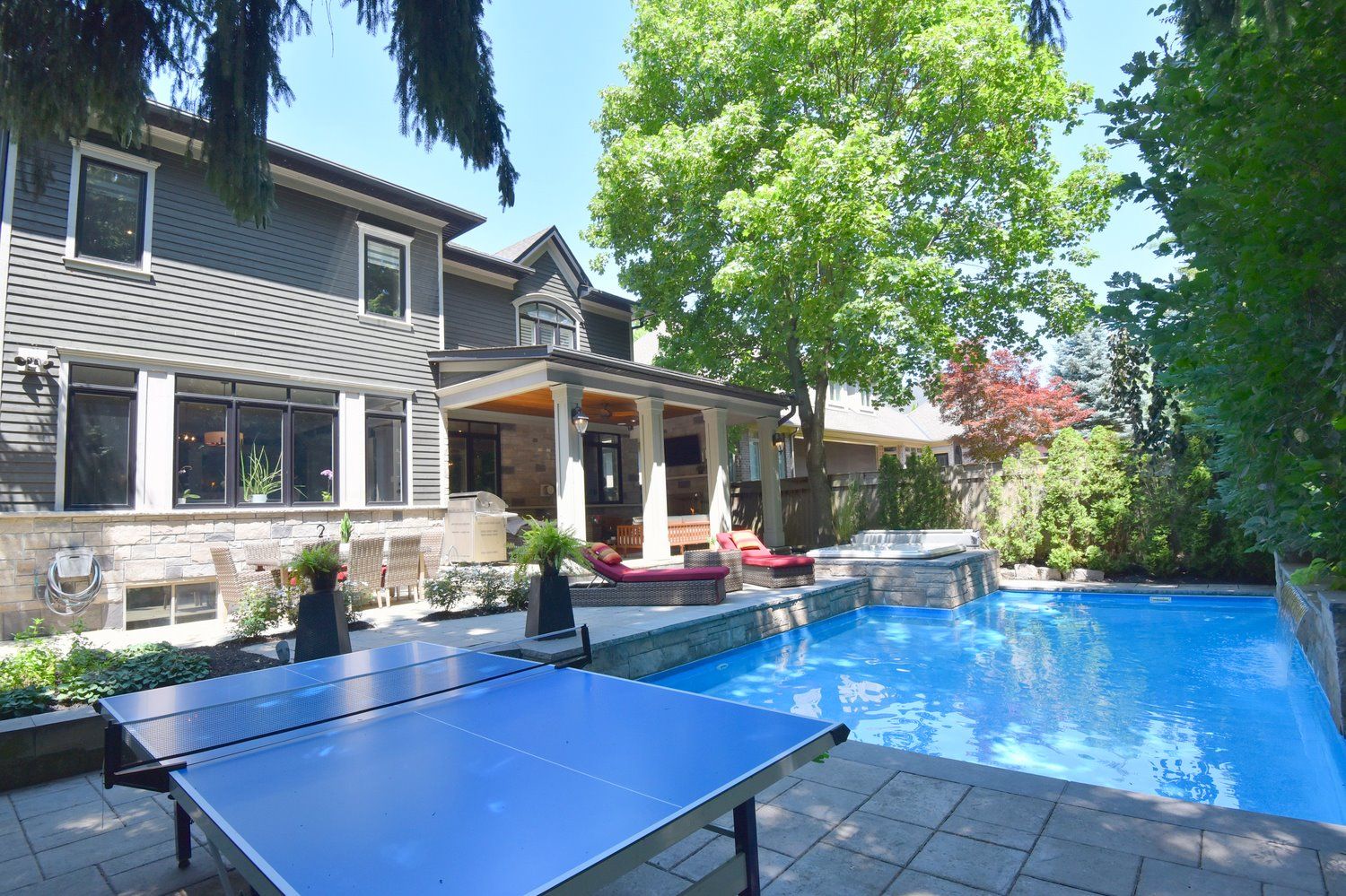 • Maintenance-free backyard with a heated saltwater pool and covered terrace.