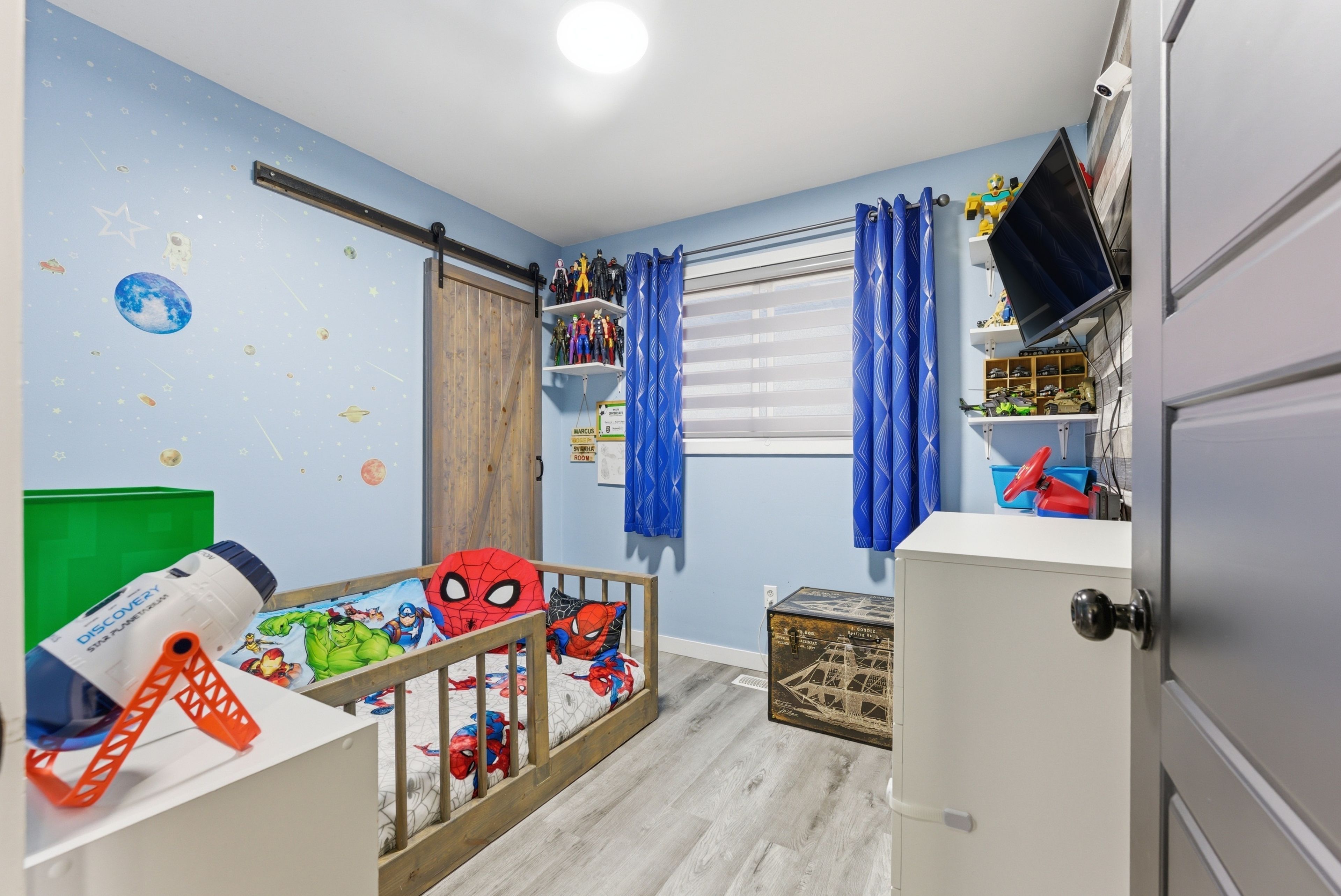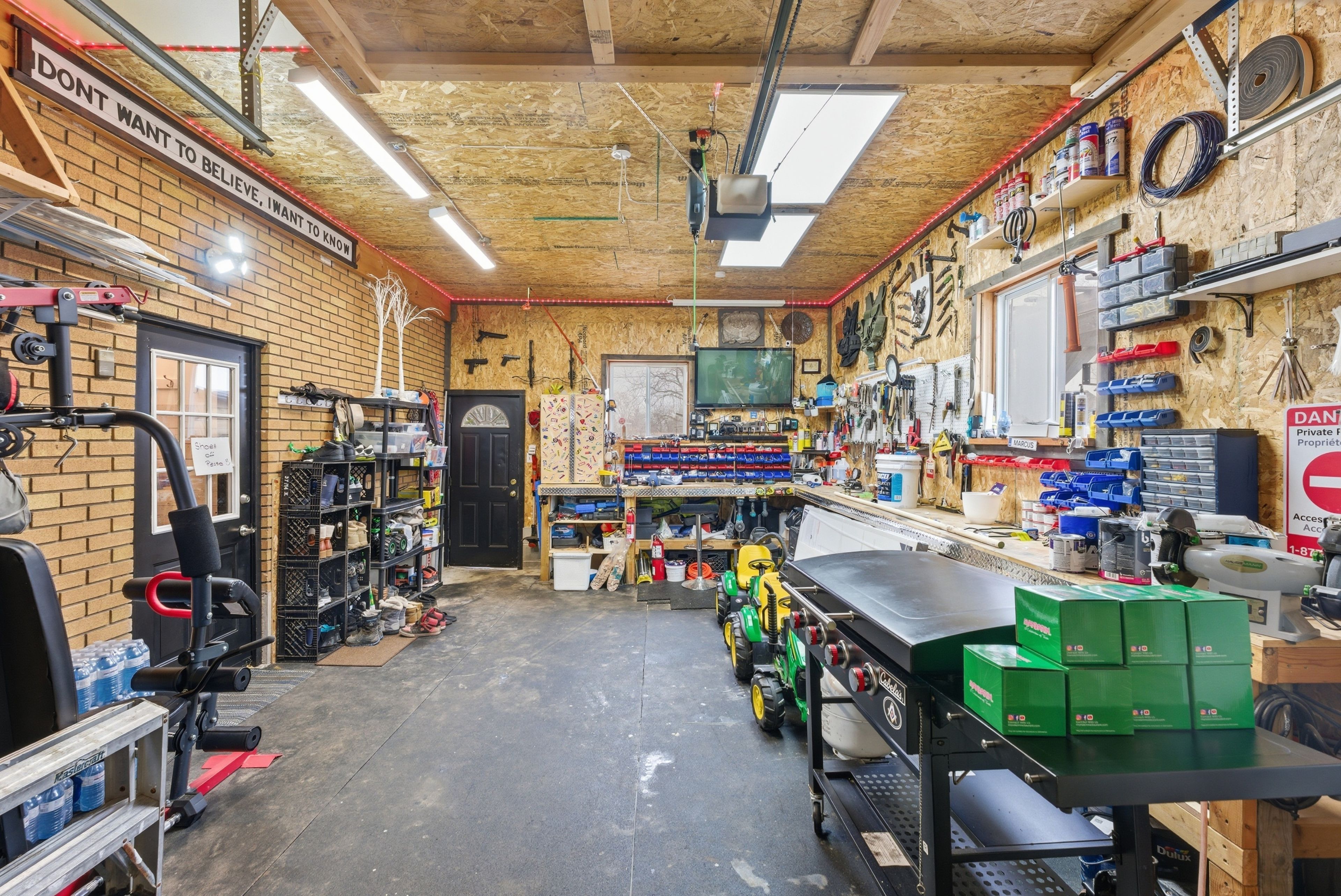 • Oversized 1.5 car garage with built-in workbench for storage and workspace.