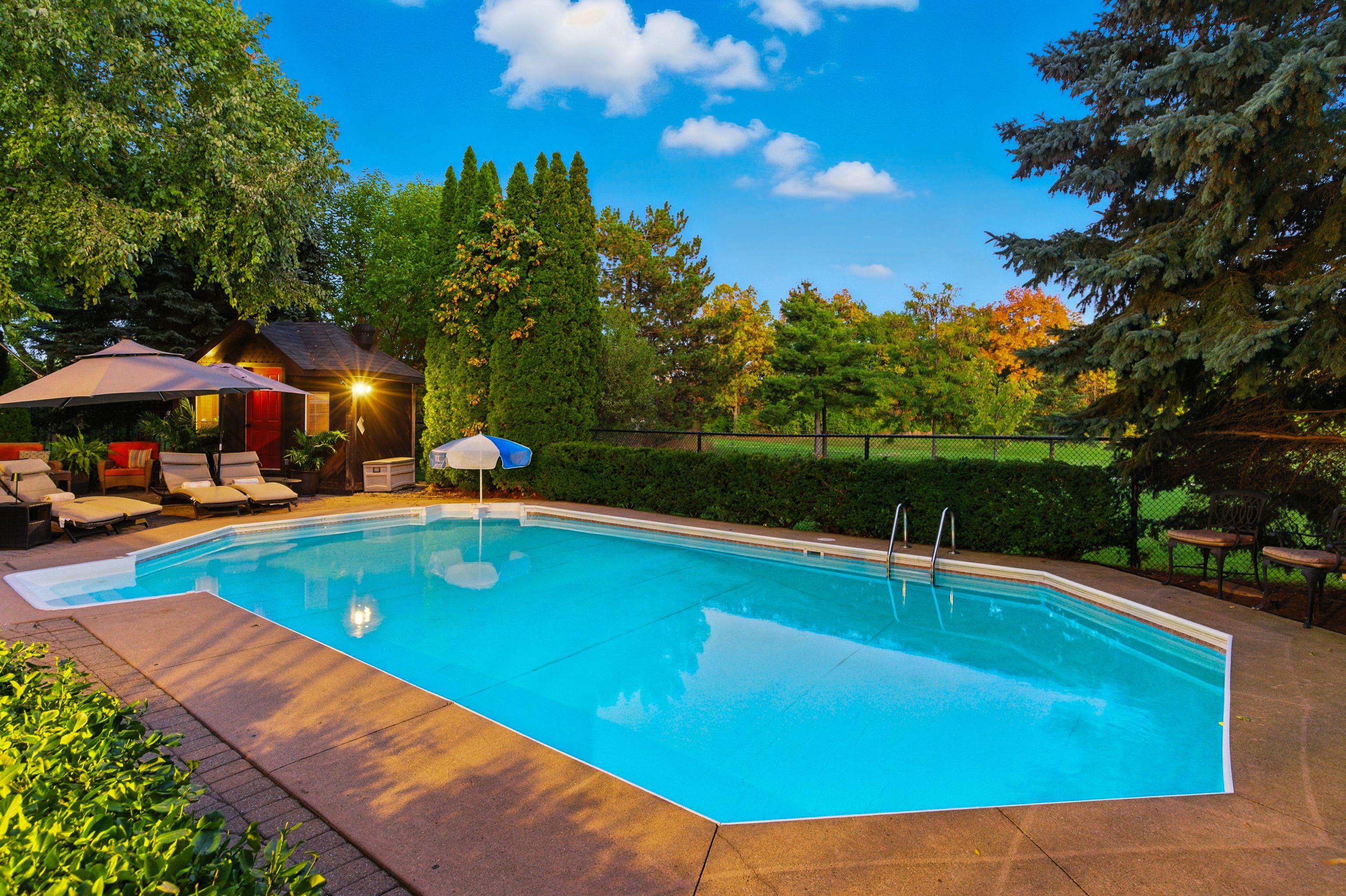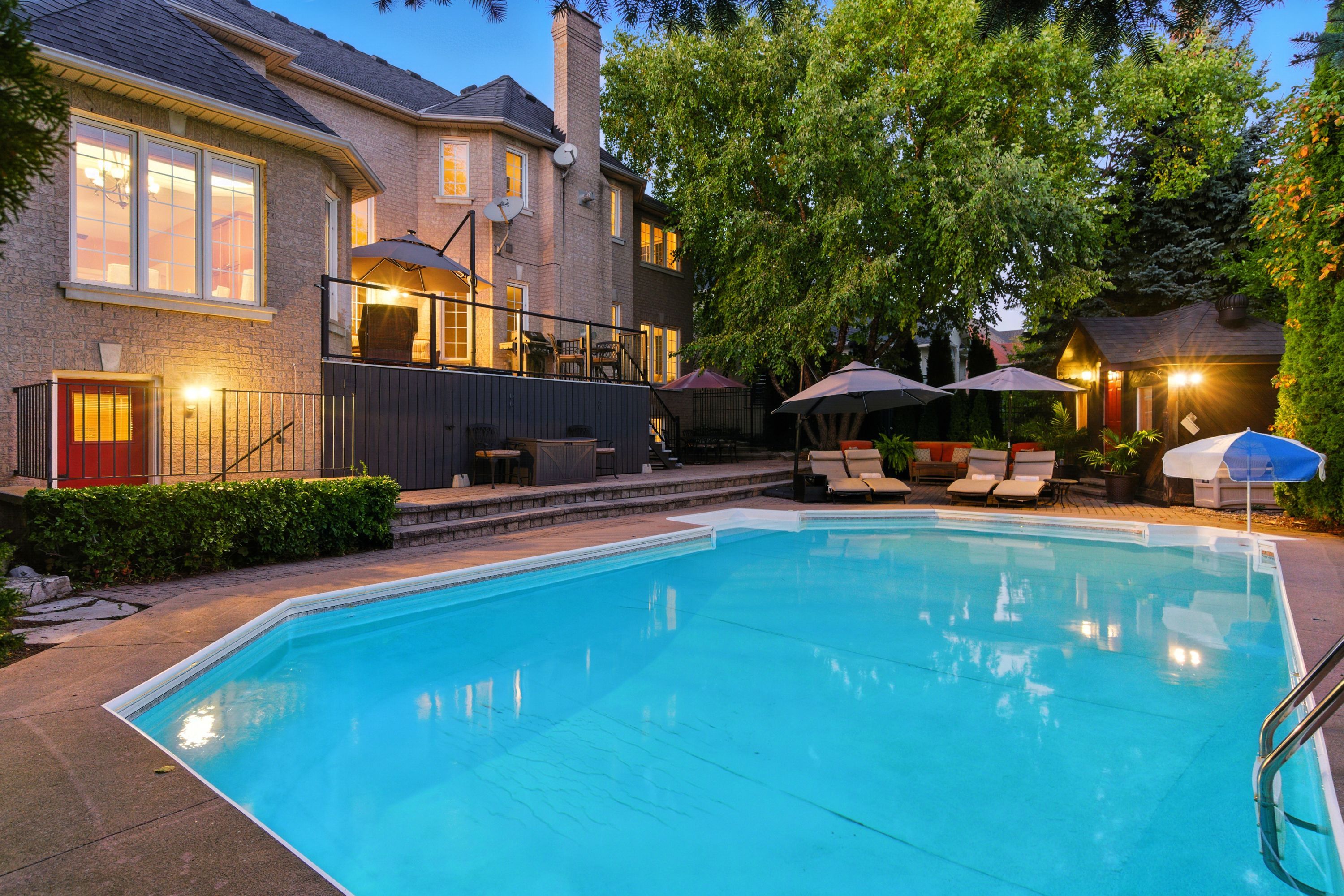 • Resort-style backyard with a pool, surrounded by mature trees.