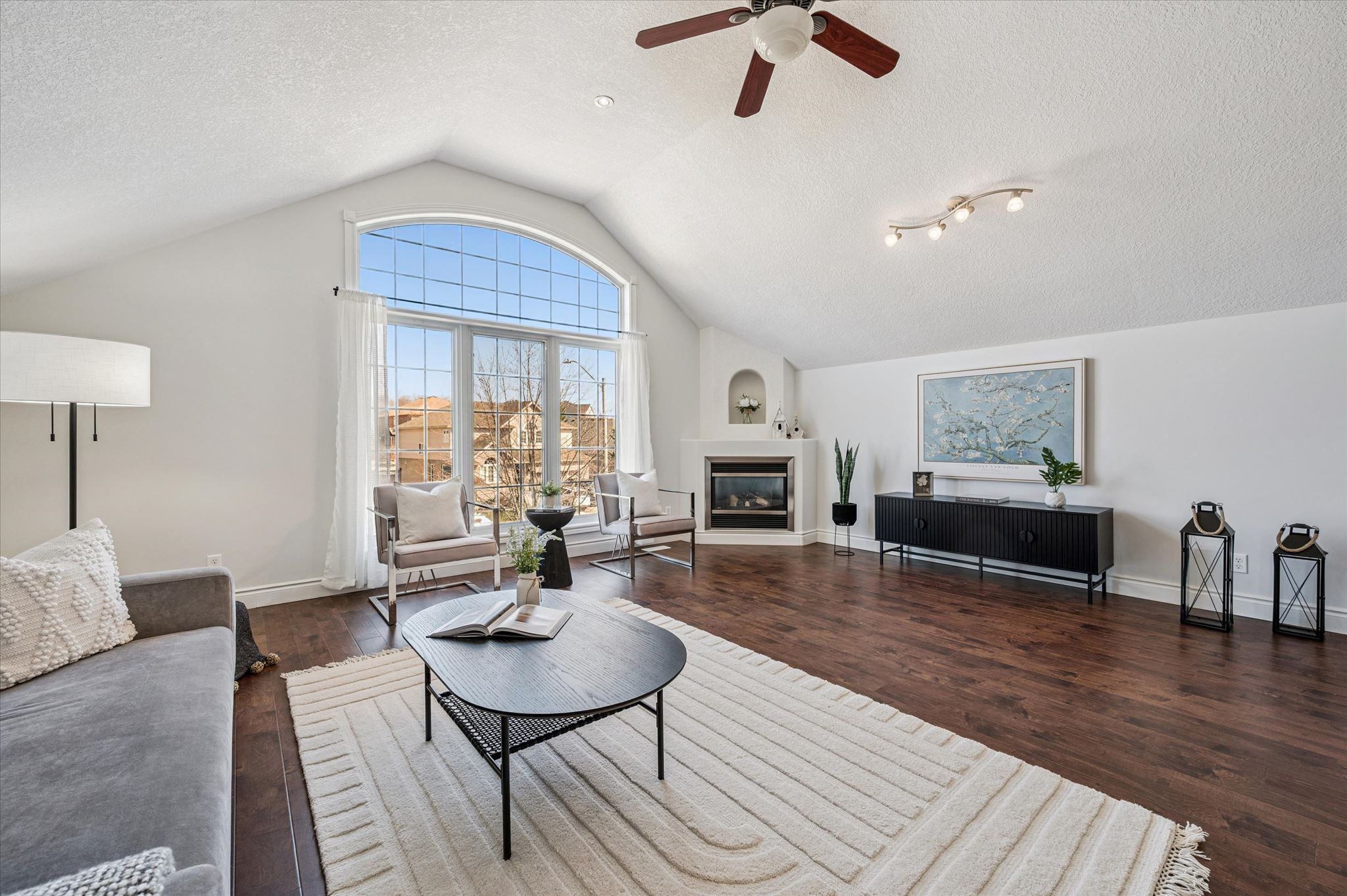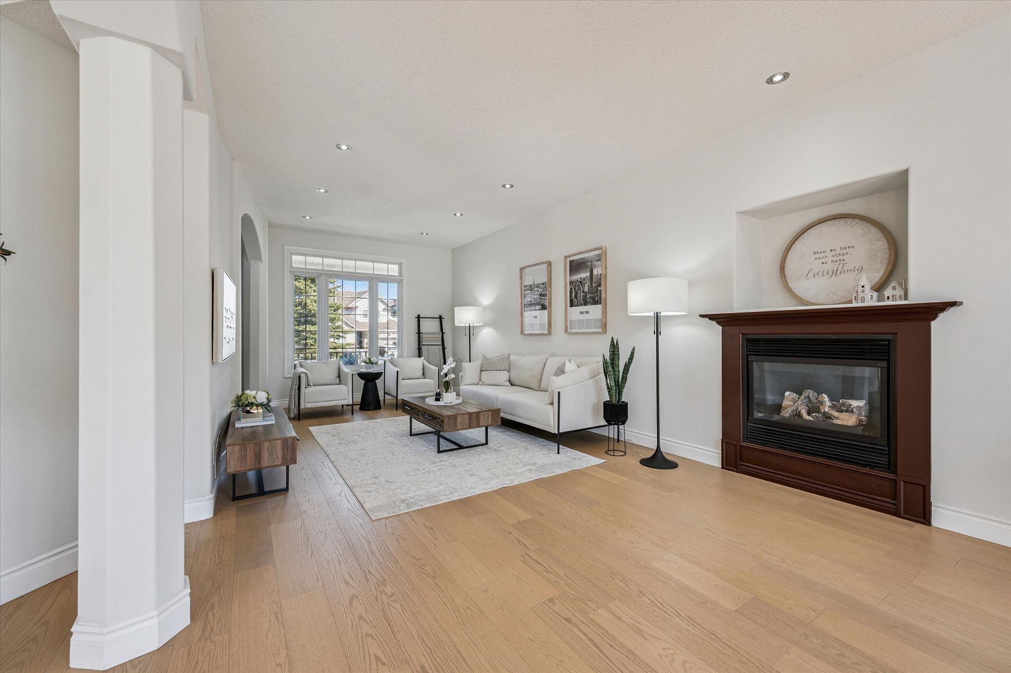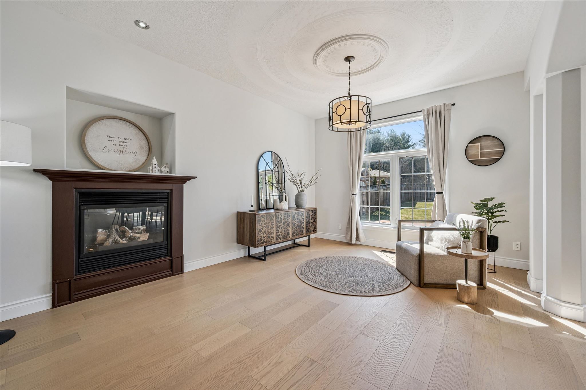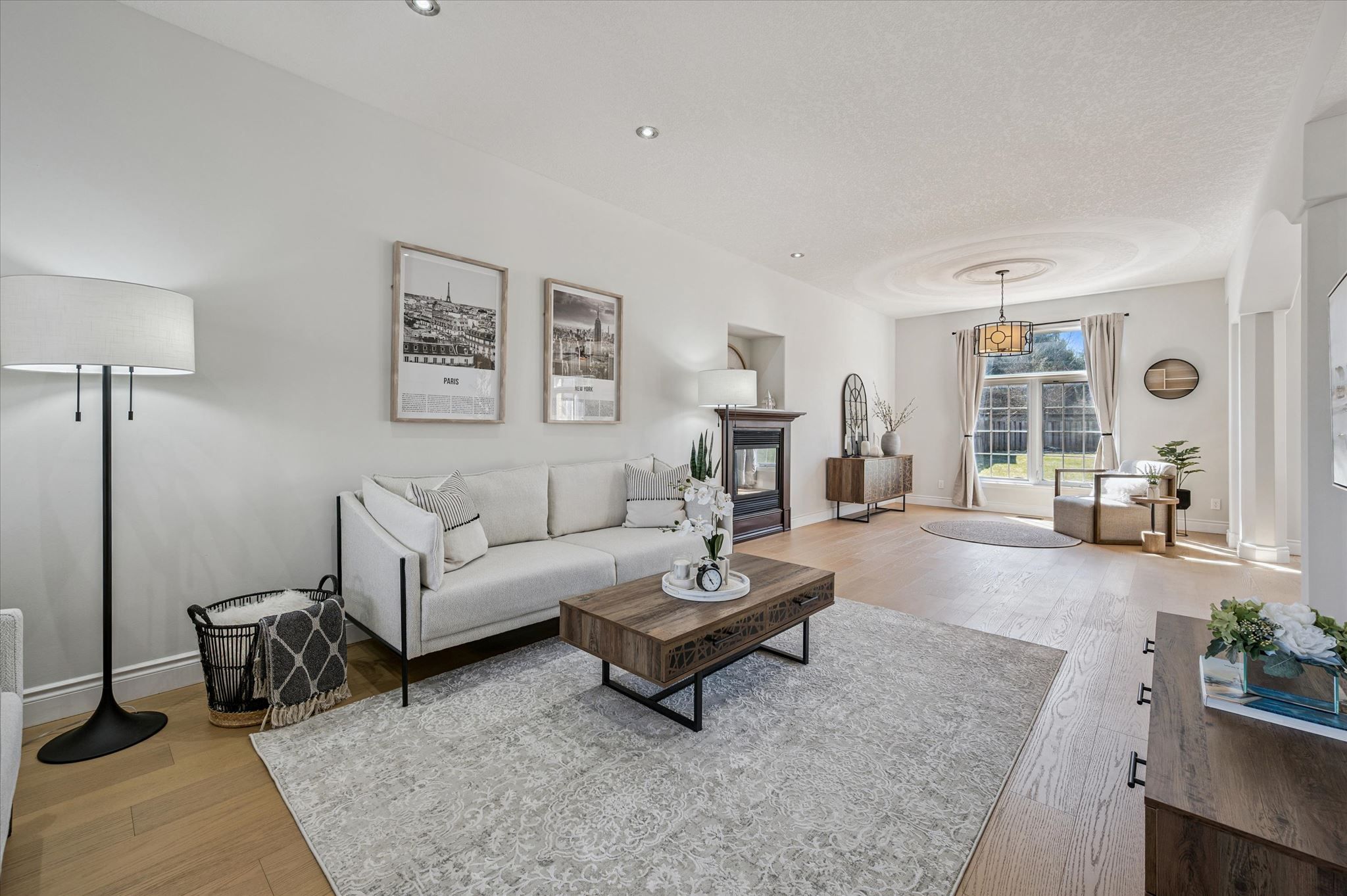 • Bright living room with 9-foot ceilings and a cozy gas fireplace.