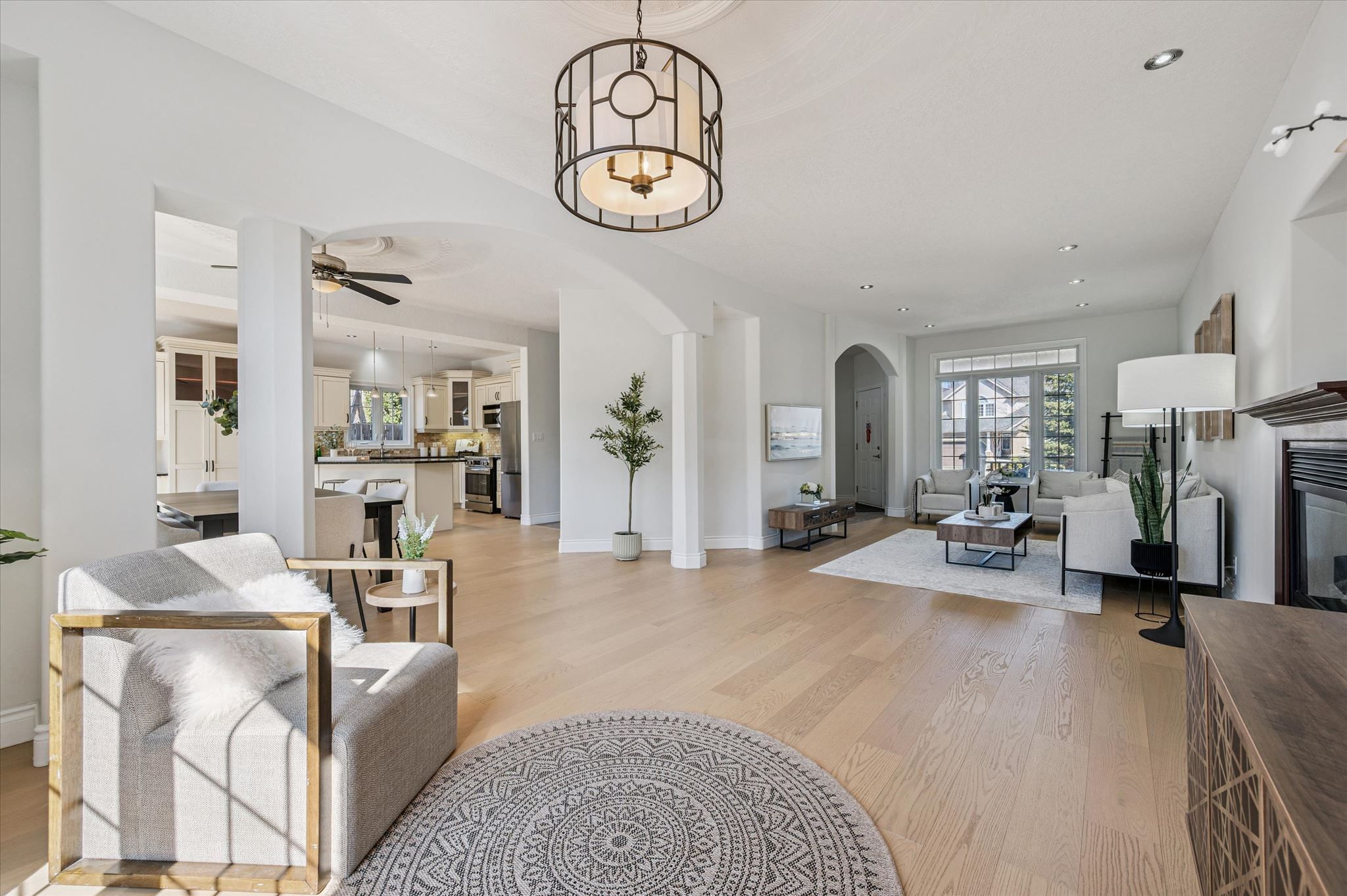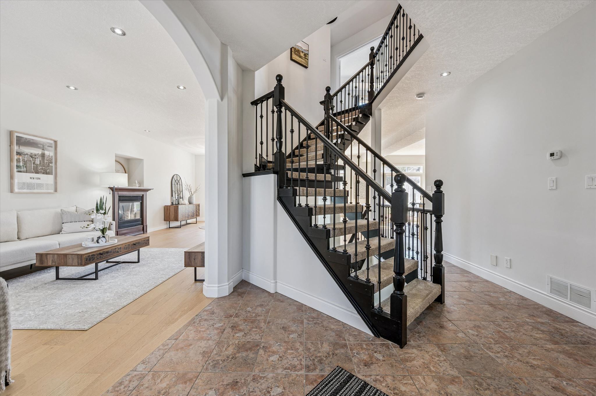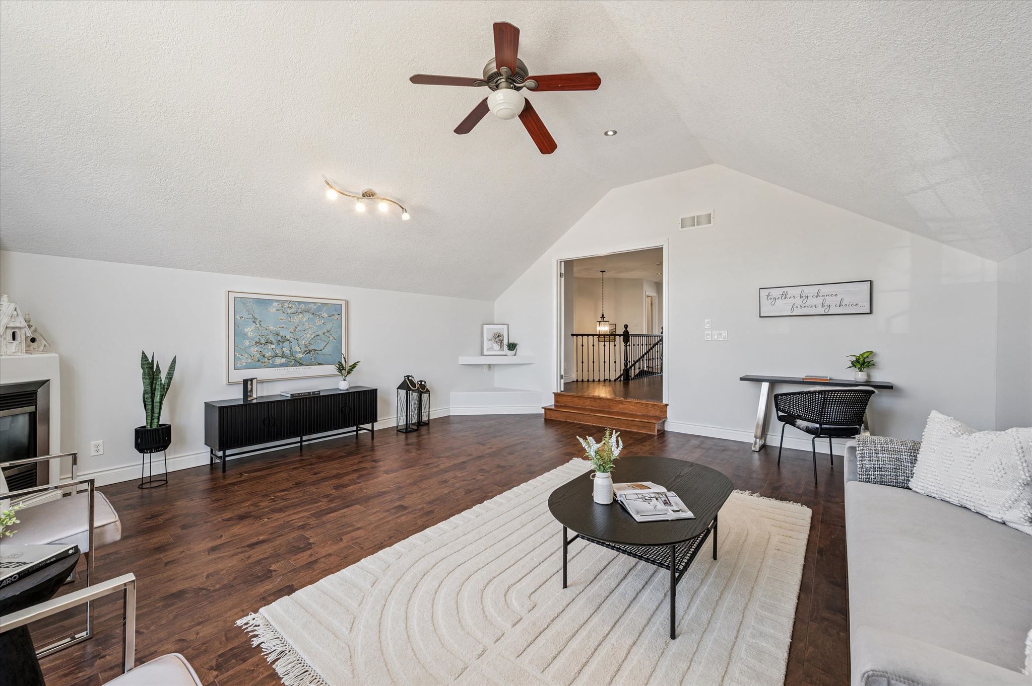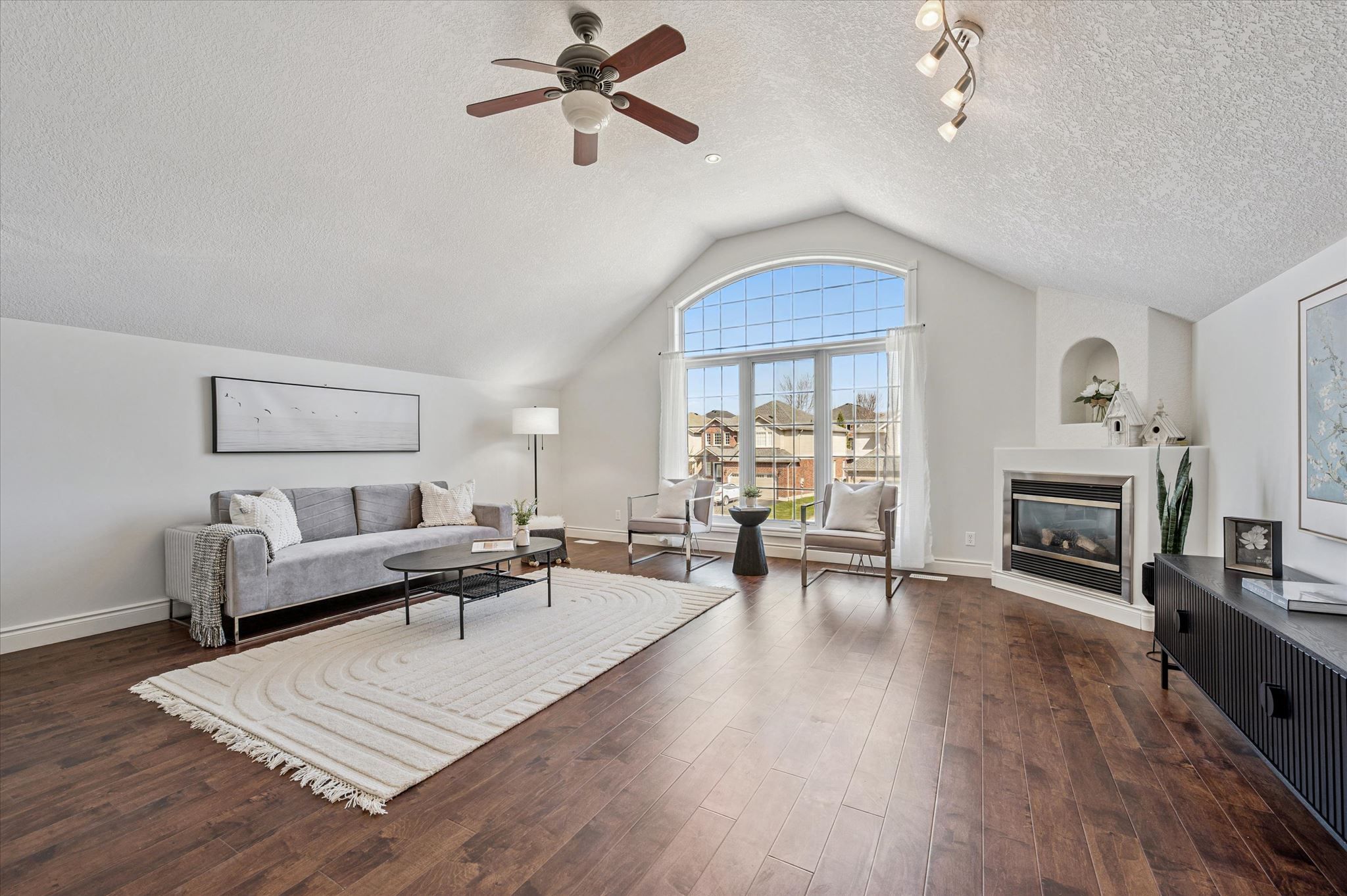 • Bright living room with 9-foot ceilings and a cozy gas fireplace.