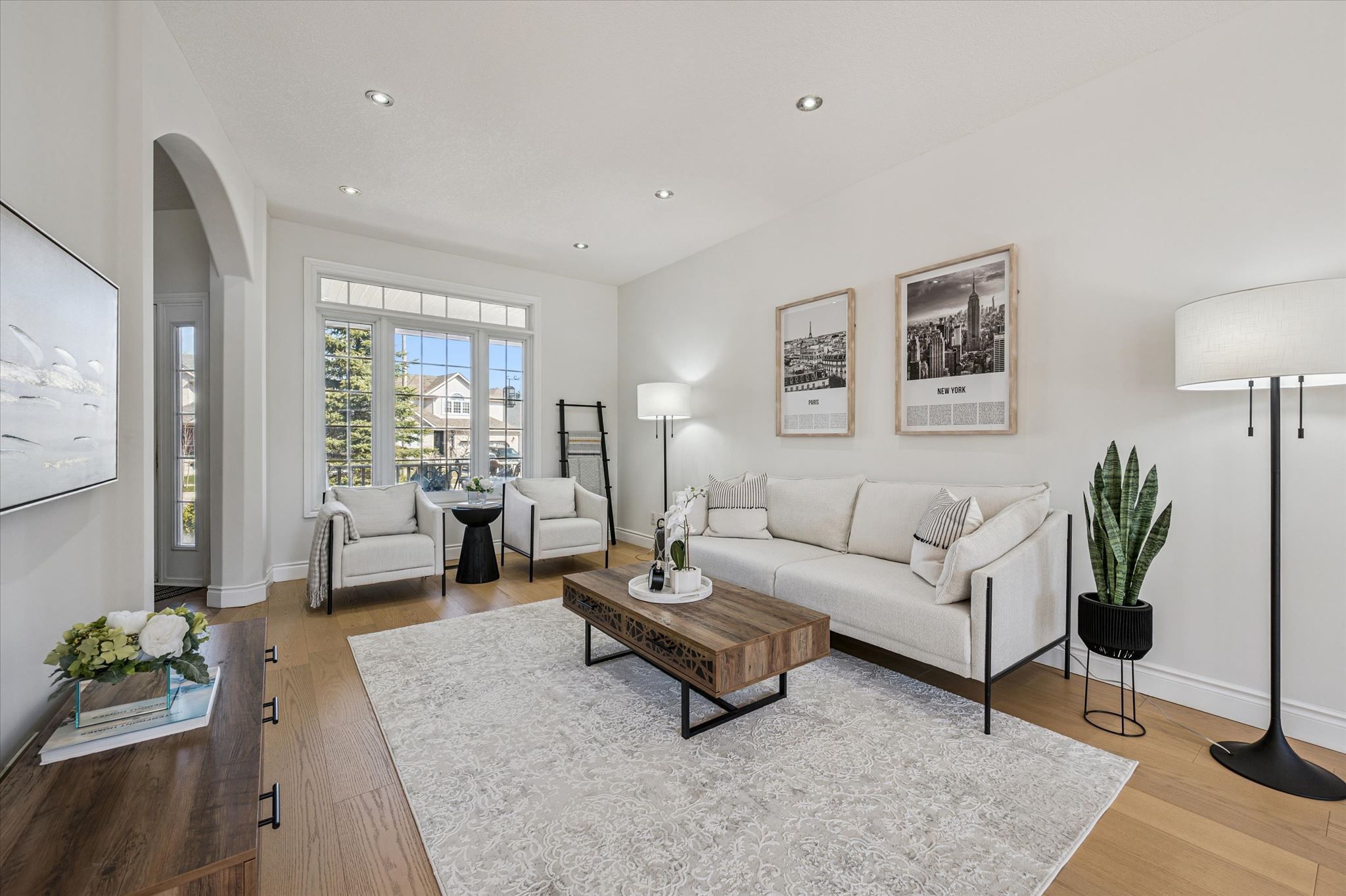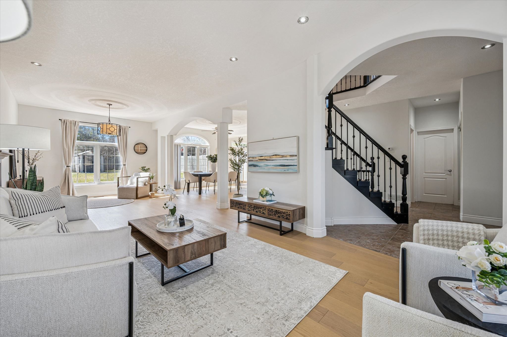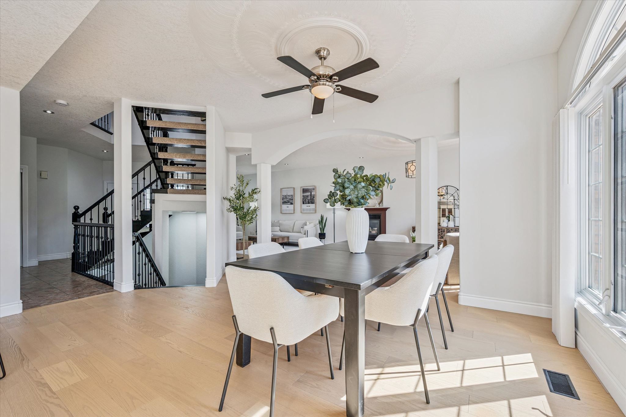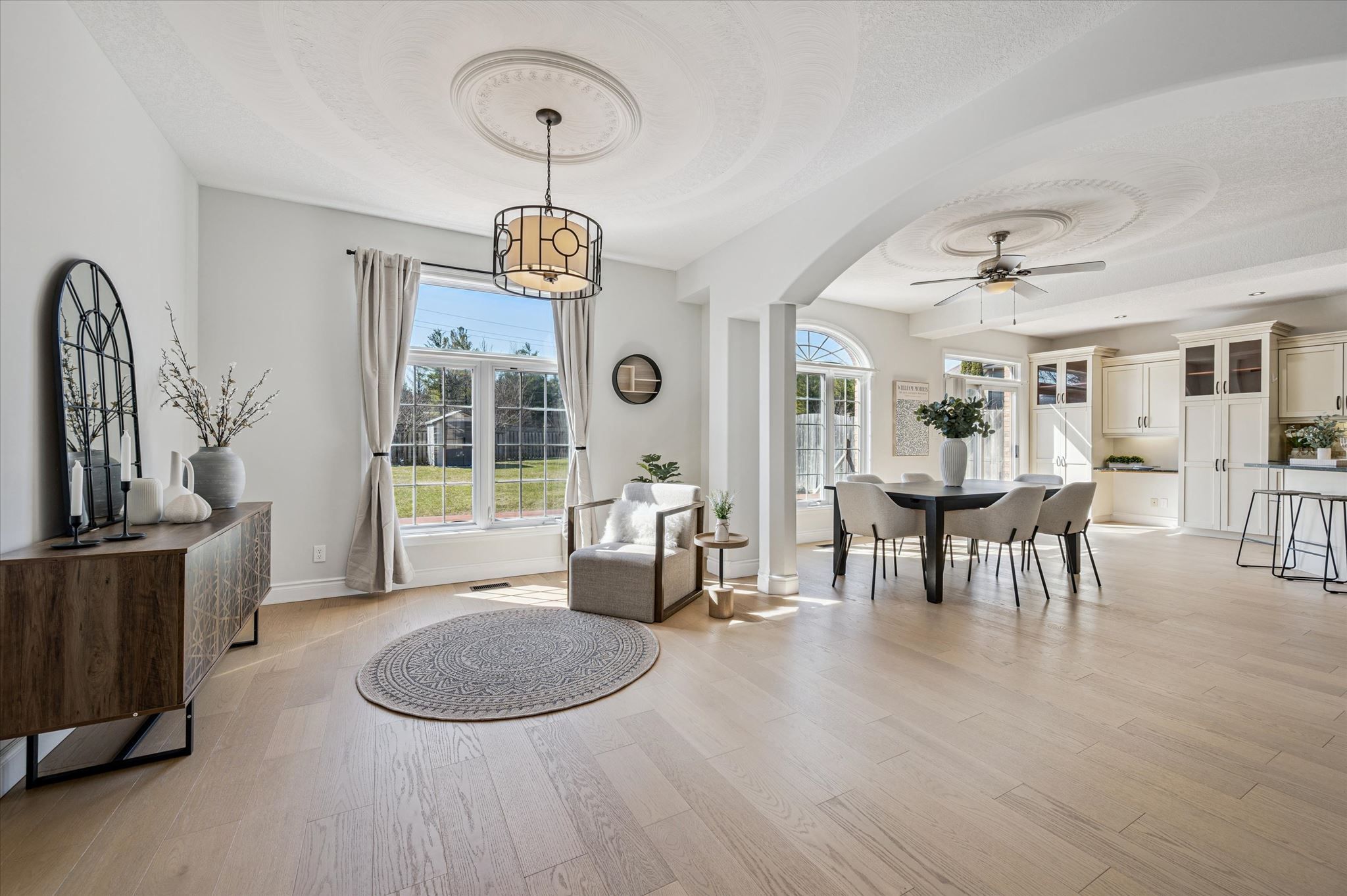 • Bright living room with 9-foot ceilings and a cozy gas fireplace.