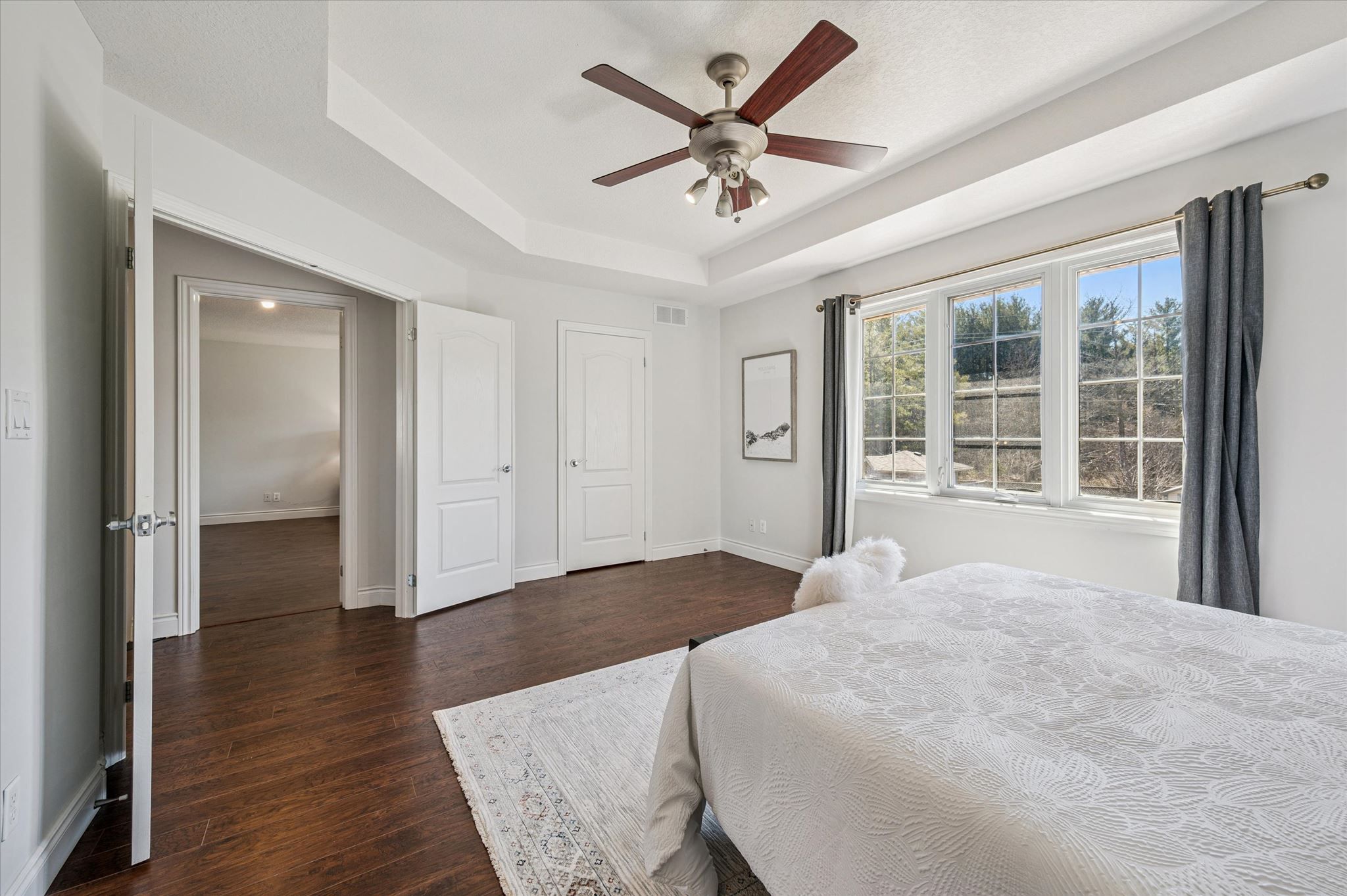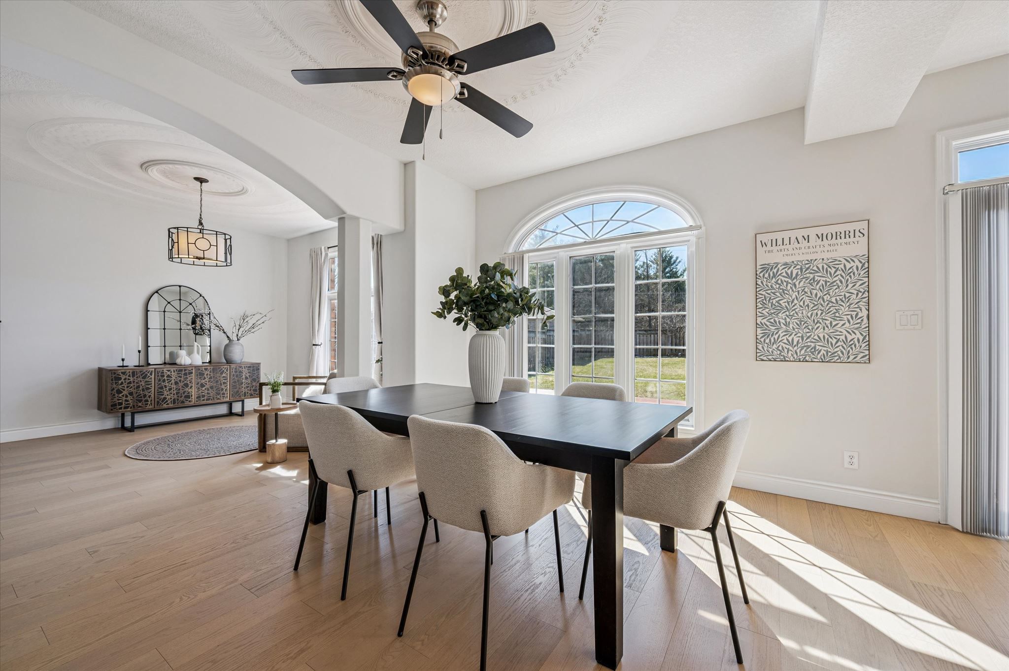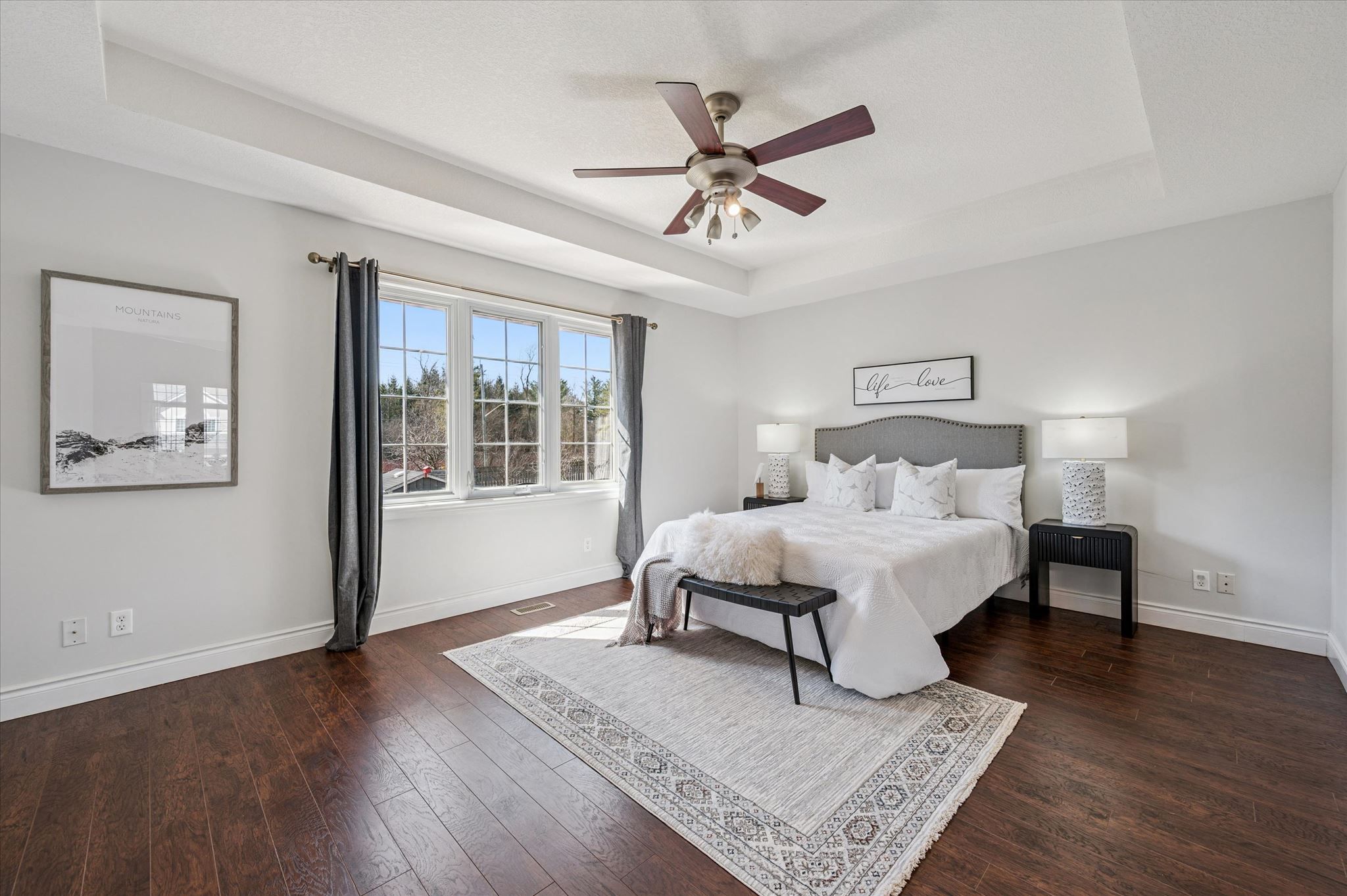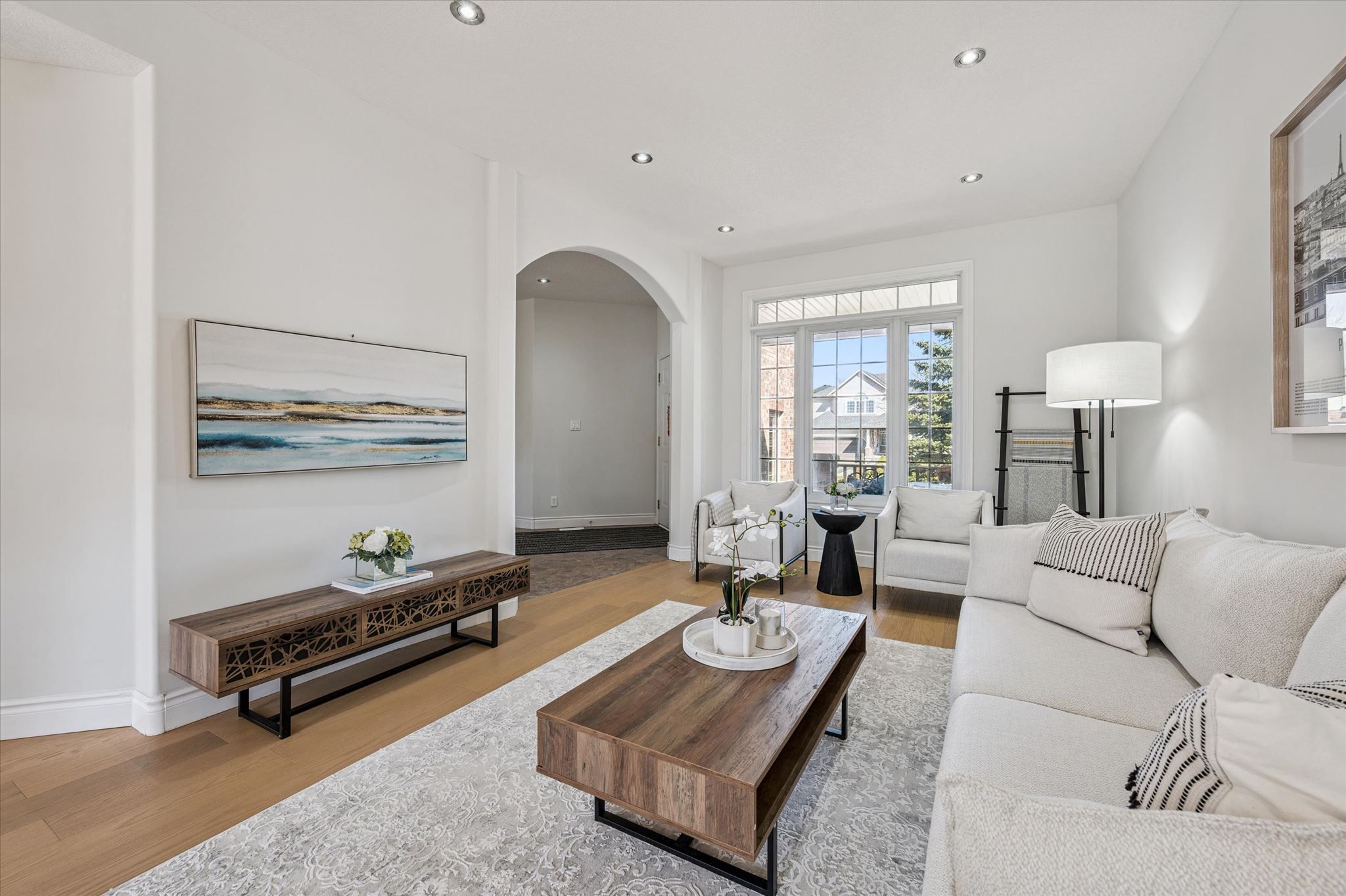 • Bright living room with 9-foot ceilings and a cozy gas fireplace.