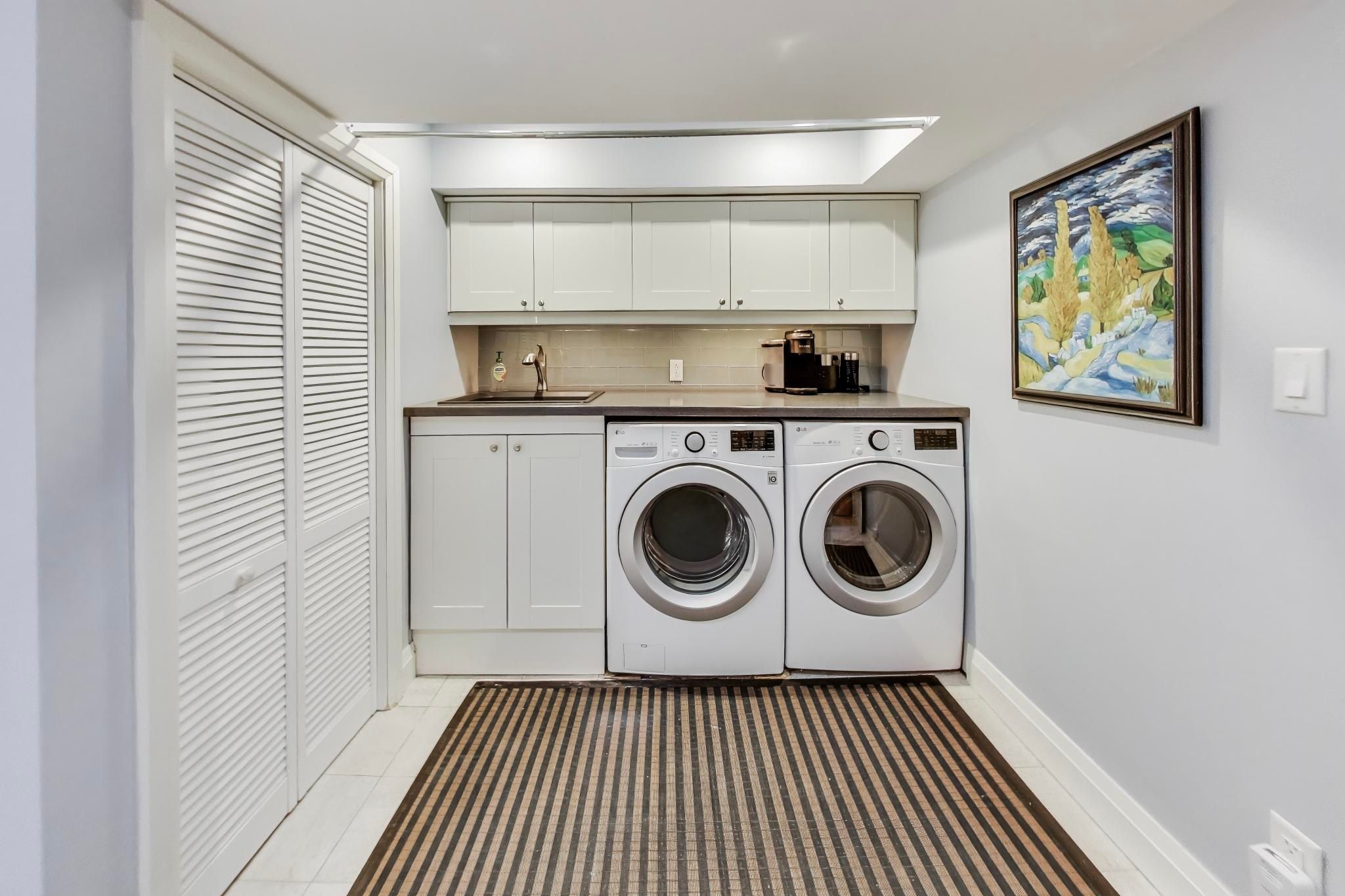 • Modern kitchen features Caesarstone countertops and a large island for cooking.